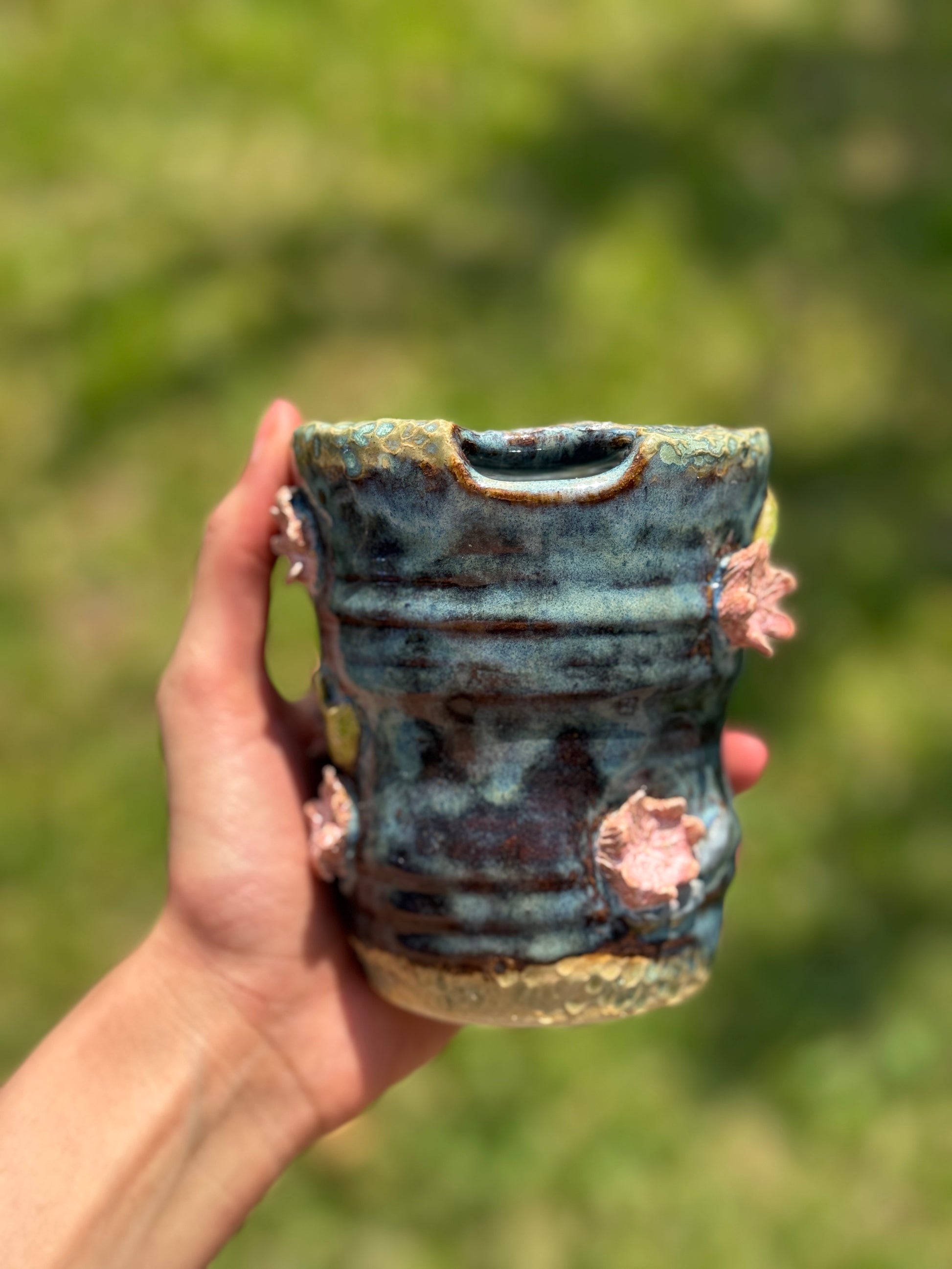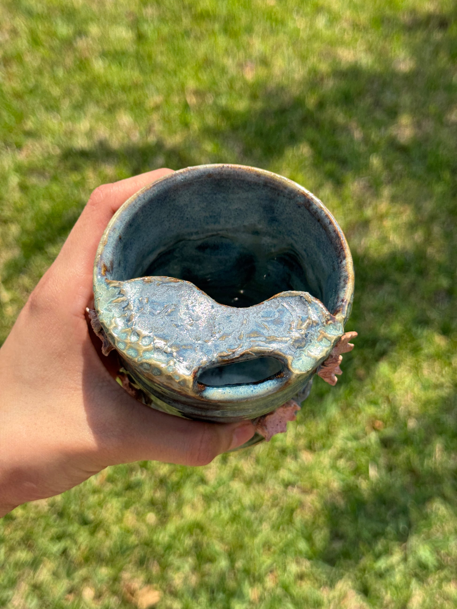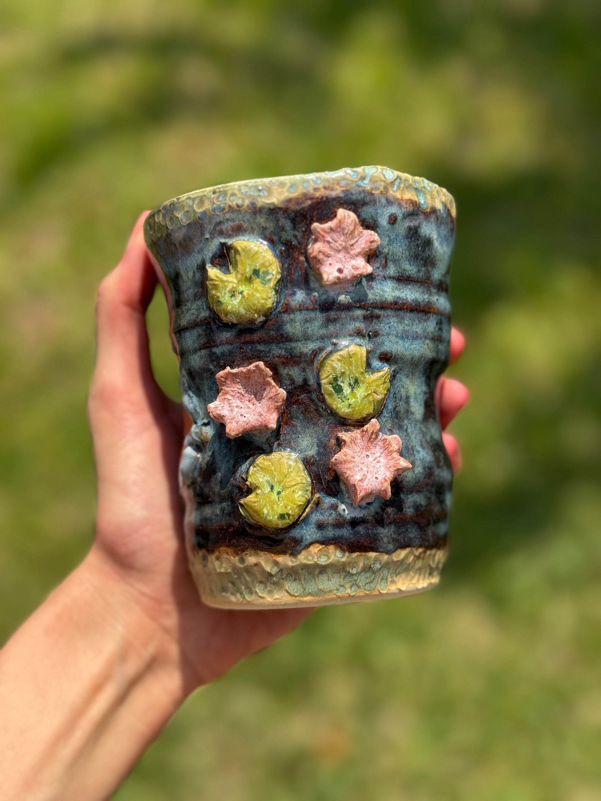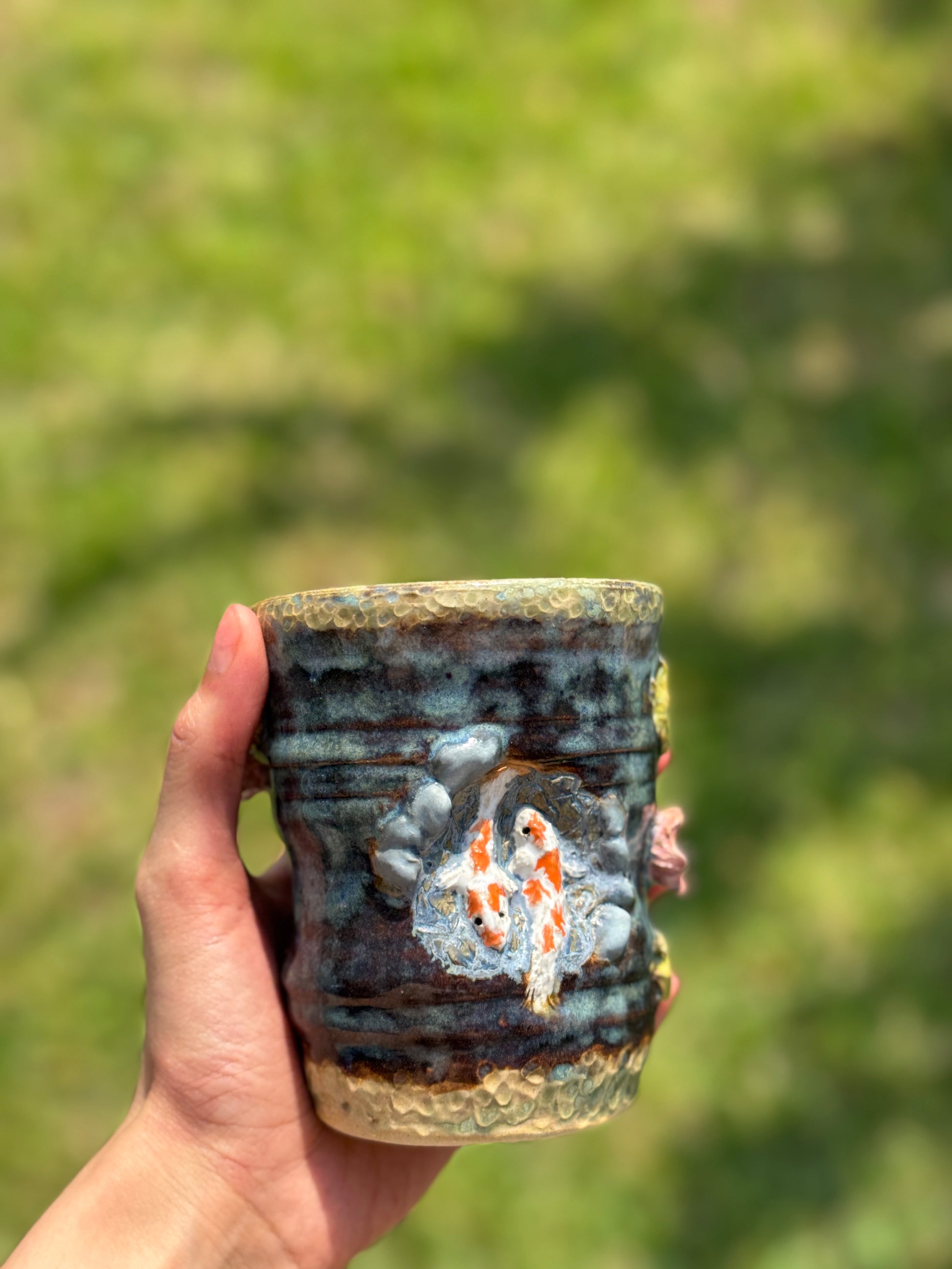 A koi fish-themed travel mug with a gracefully sculpted koi fish swimming around. The shimmering glazes in shades of orange, white , and blue bring the beauty of a koi pond to life, perfect for carrying a bit of tranquility and nature with you wherever you go.