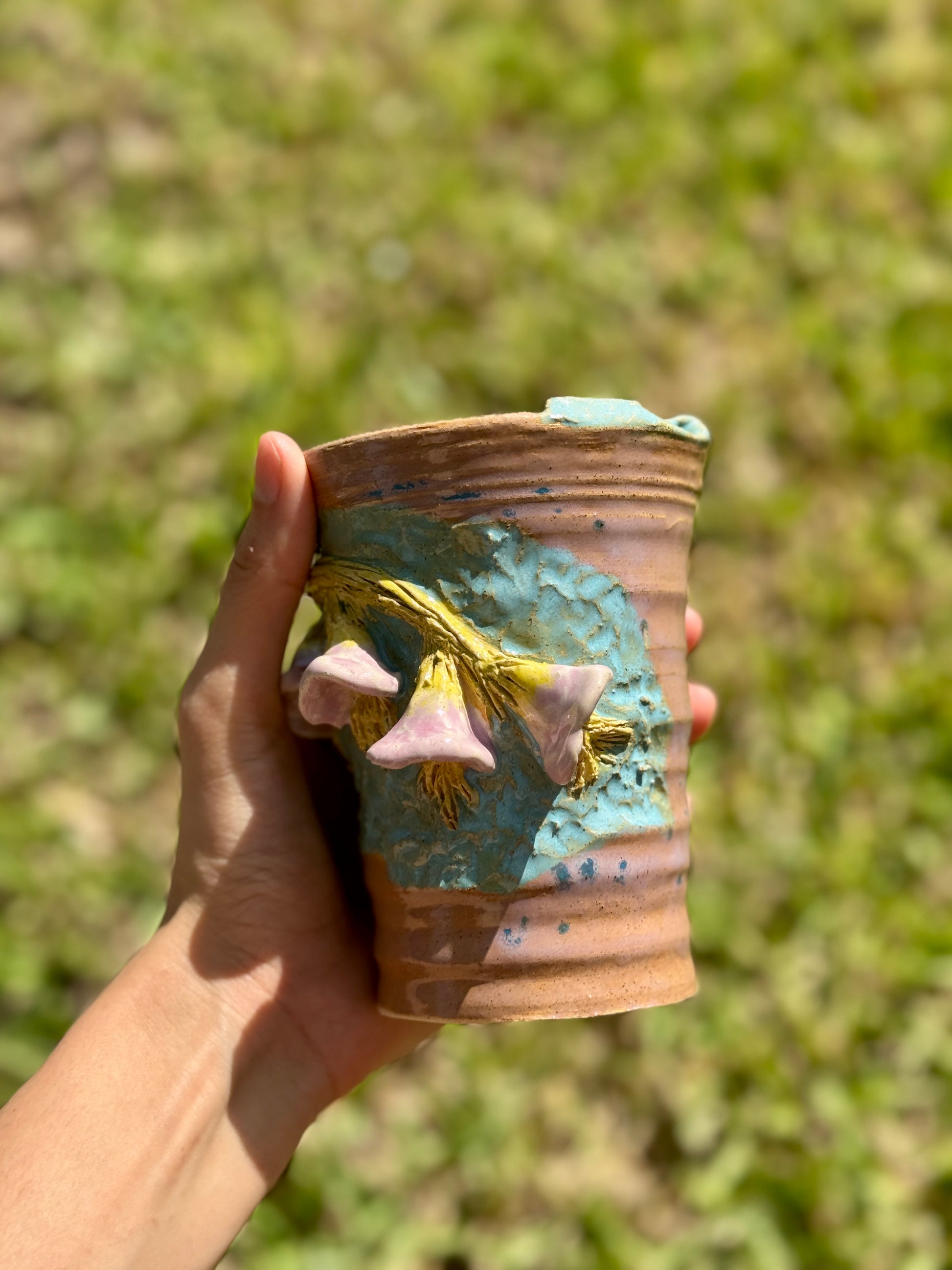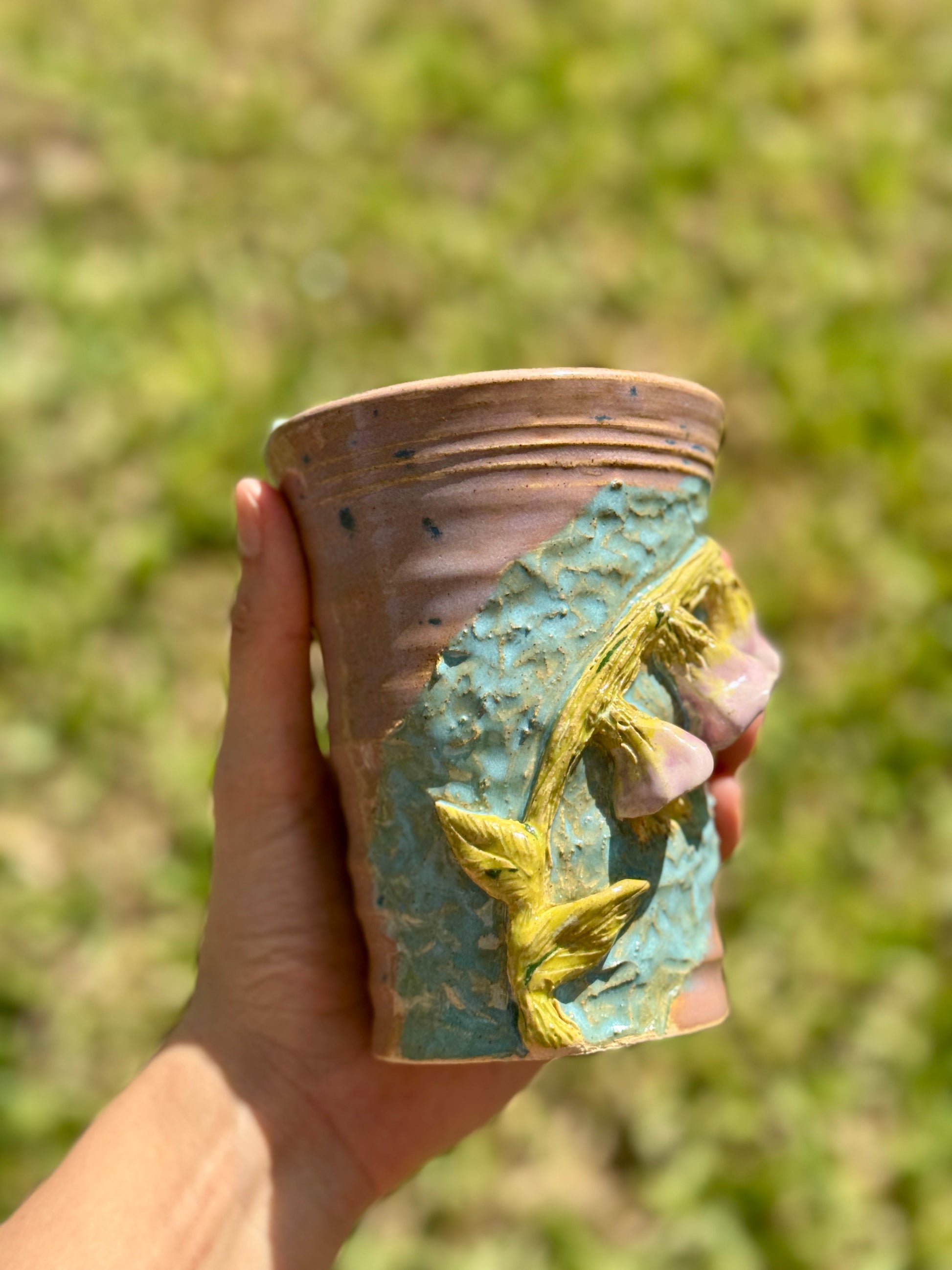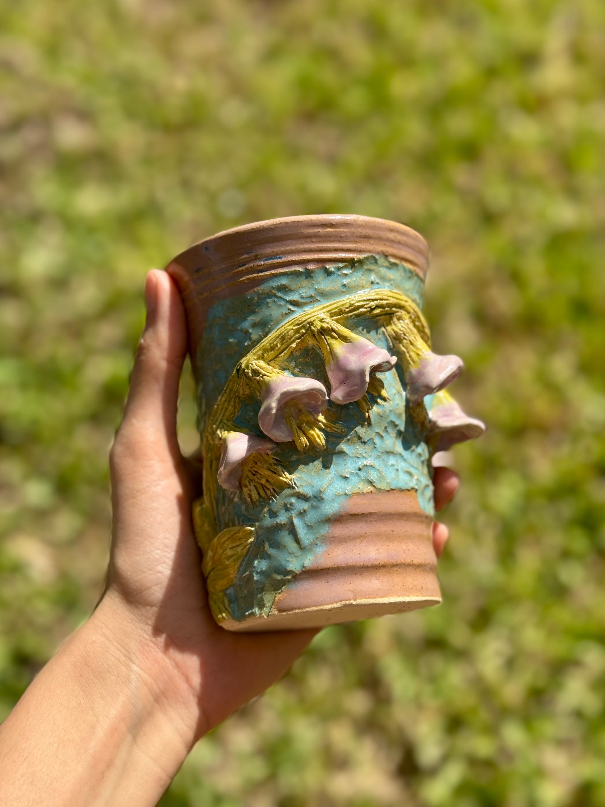A to go mug adorned with delicate pink and purple bell flowers. Perfect for sipping in bloom wherever you go.