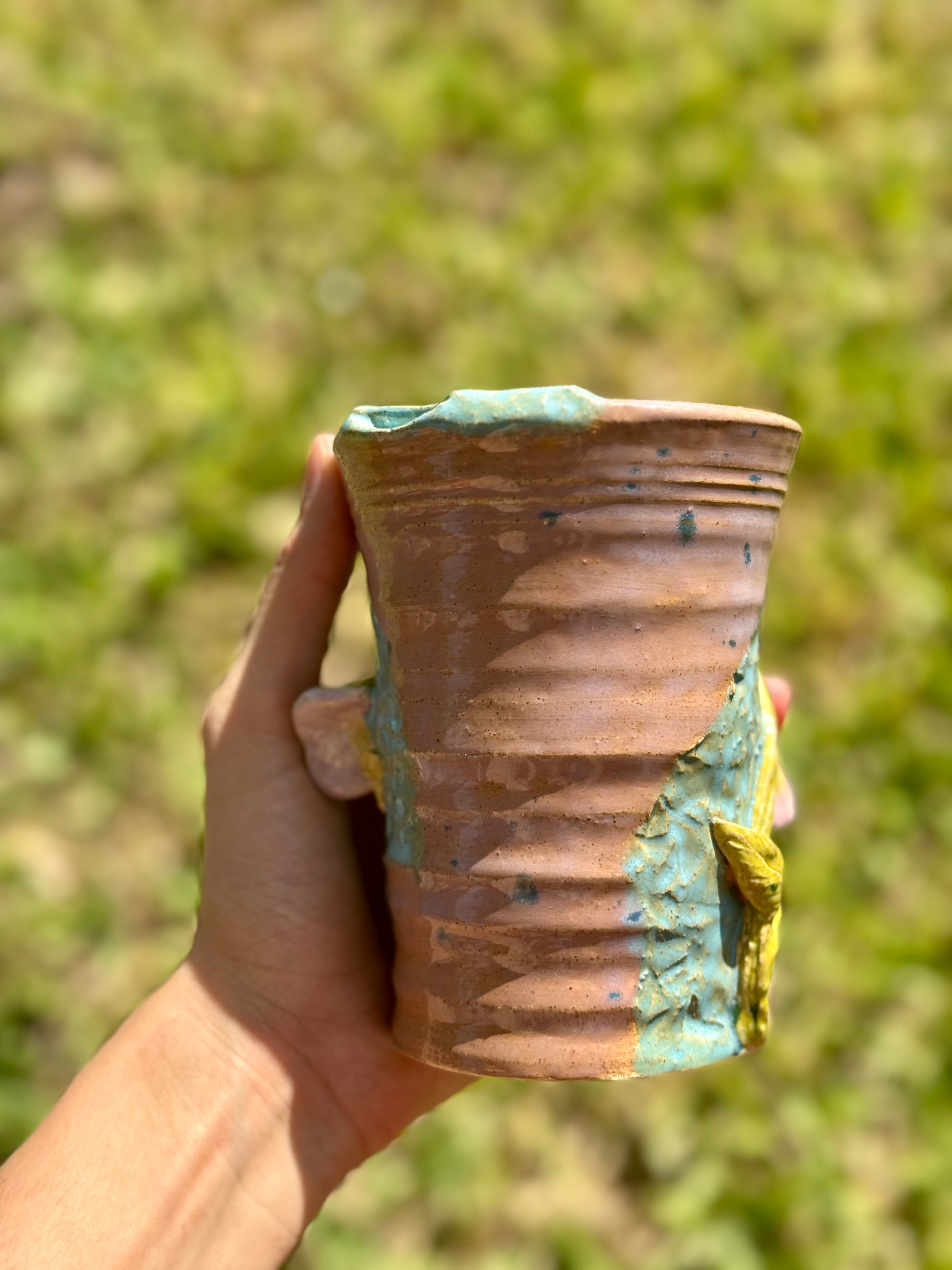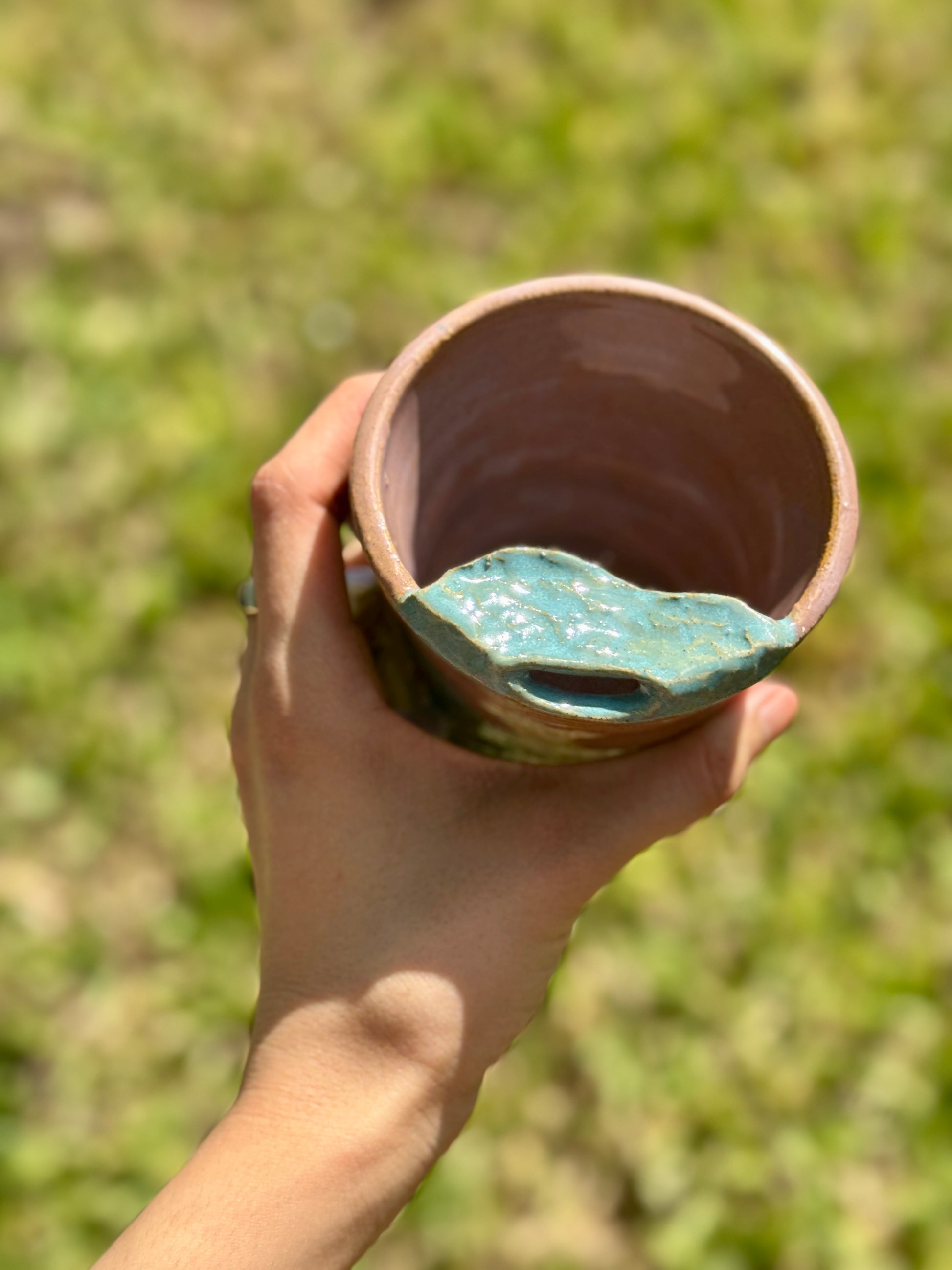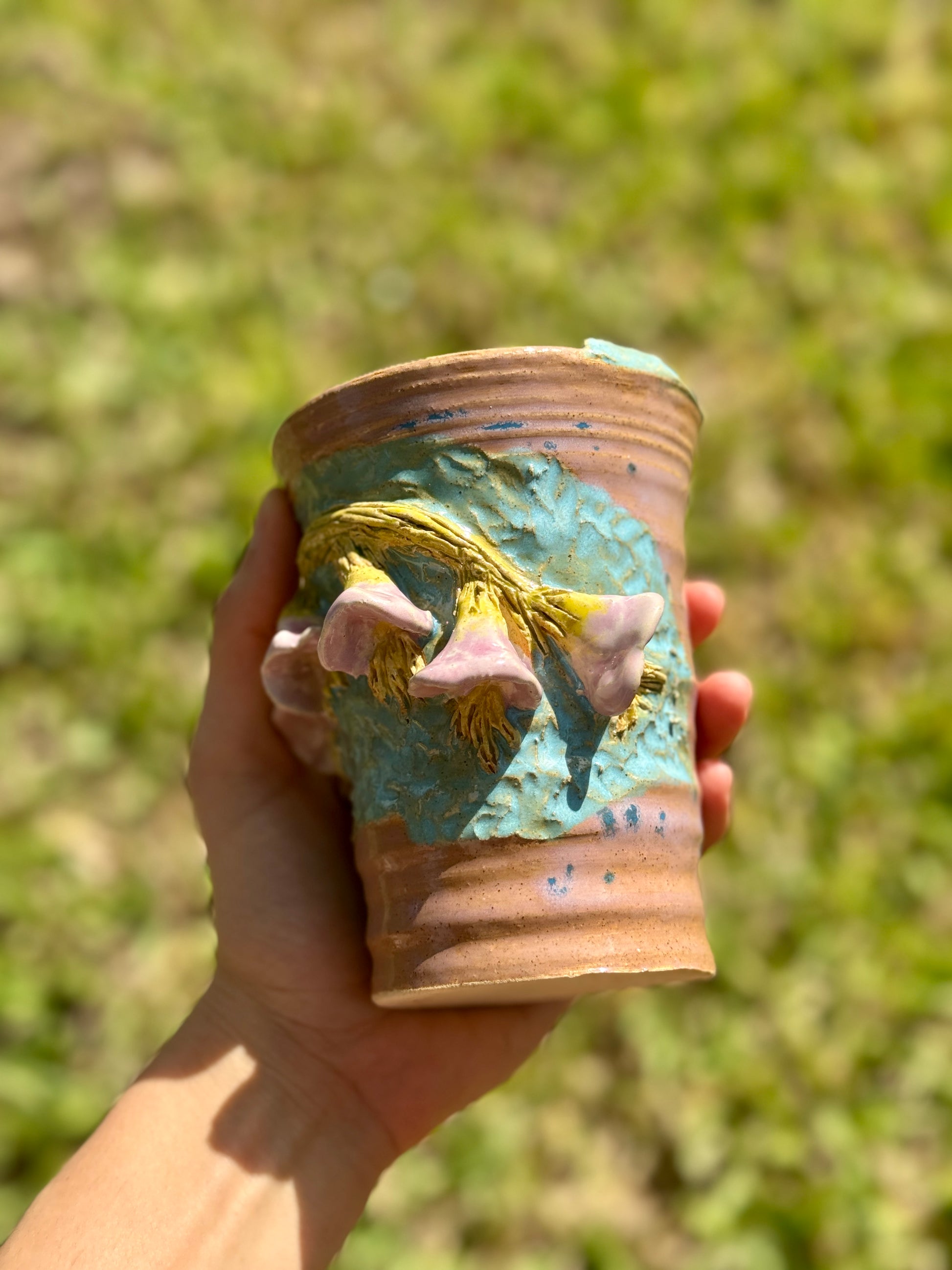 A to go mug adorned with delicate pink and purple bell flowers. Perfect for sipping in bloom wherever you go.