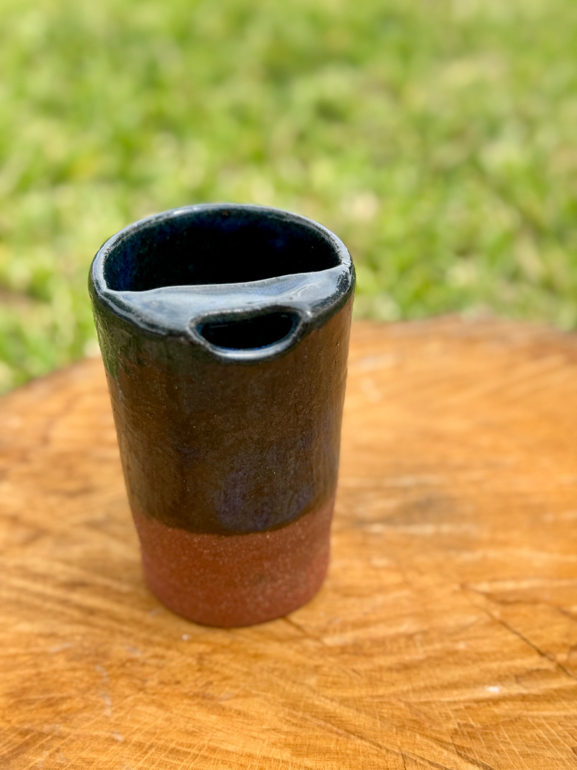 A dark blue travel mug on terracotta clay, blending rich, deep hues with the warm, earthy tones of the clay for a stylish, handcrafted look that’s perfect for your on-the-go drinks. Holds around 8-10oz
