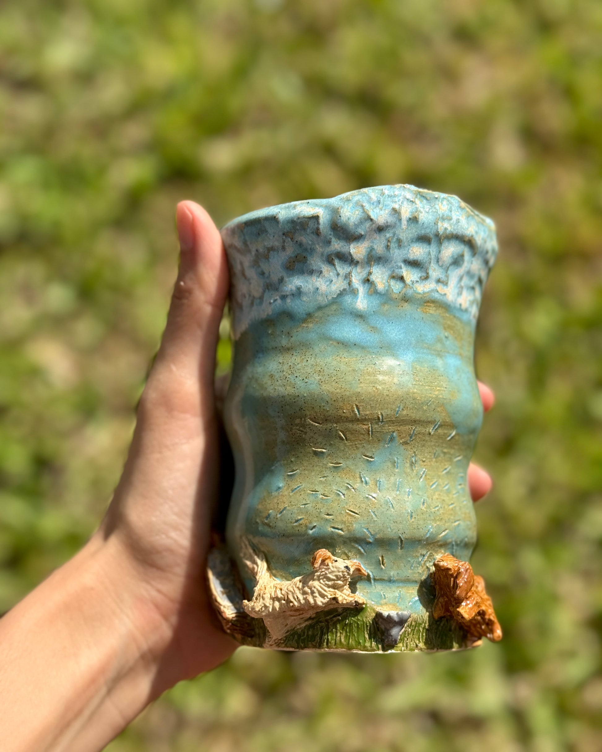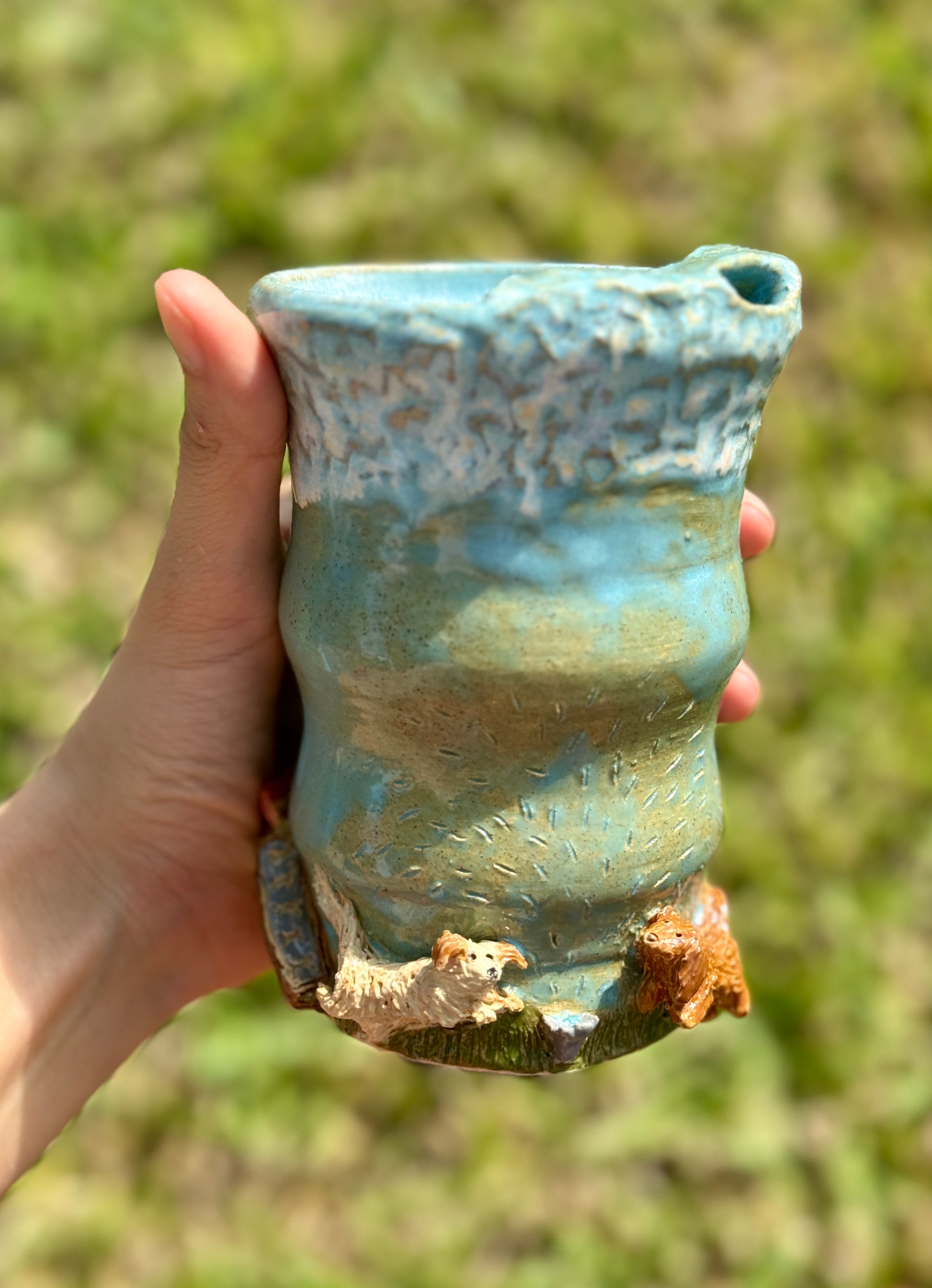 A fun to go mug featuring a lively dog playground scene with two playful pups, surrounded by toys, a bone, and other doggy details. Perfect for dog lovers on the move!