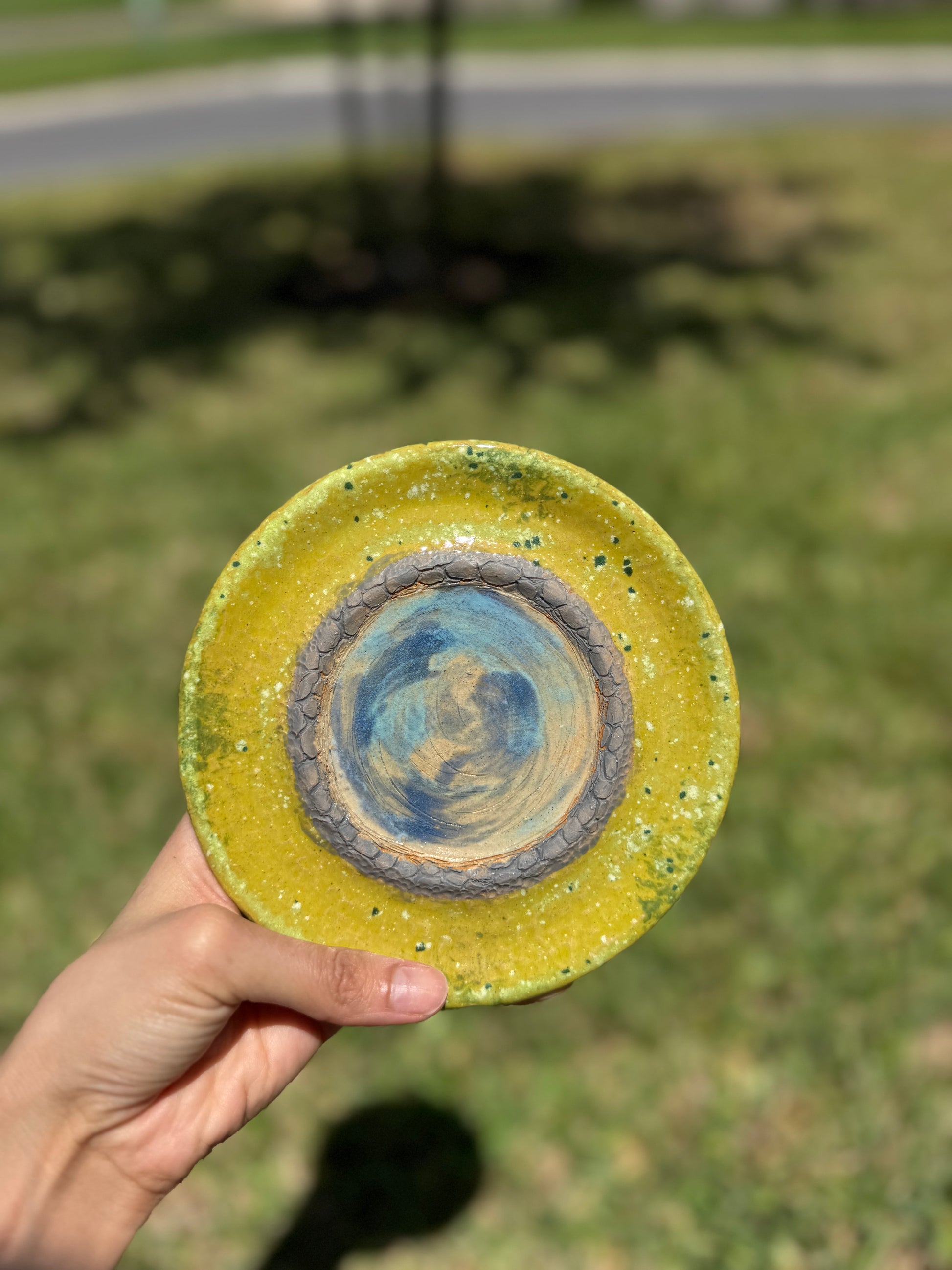 A fairy pond saucer plate featuring gentle ripples, sculpted details like stones and bringing the serene magic of a hidden woodland pond to your table.