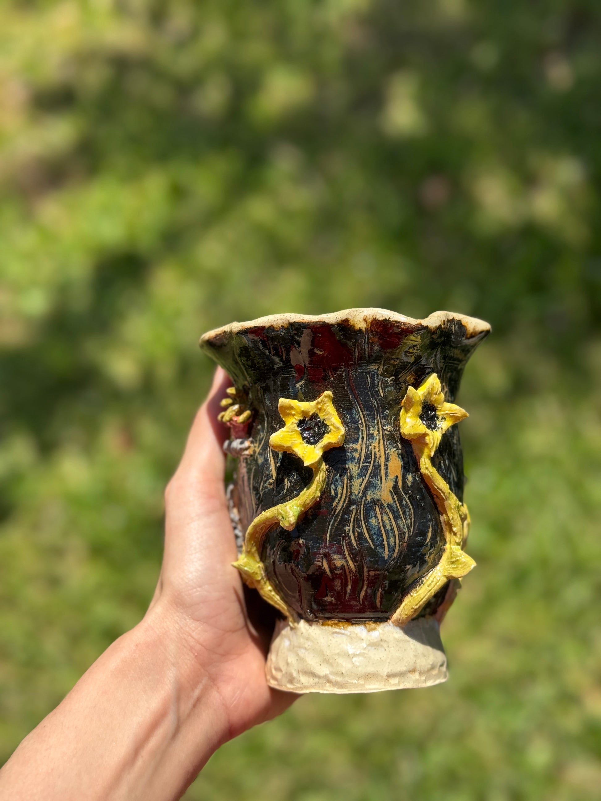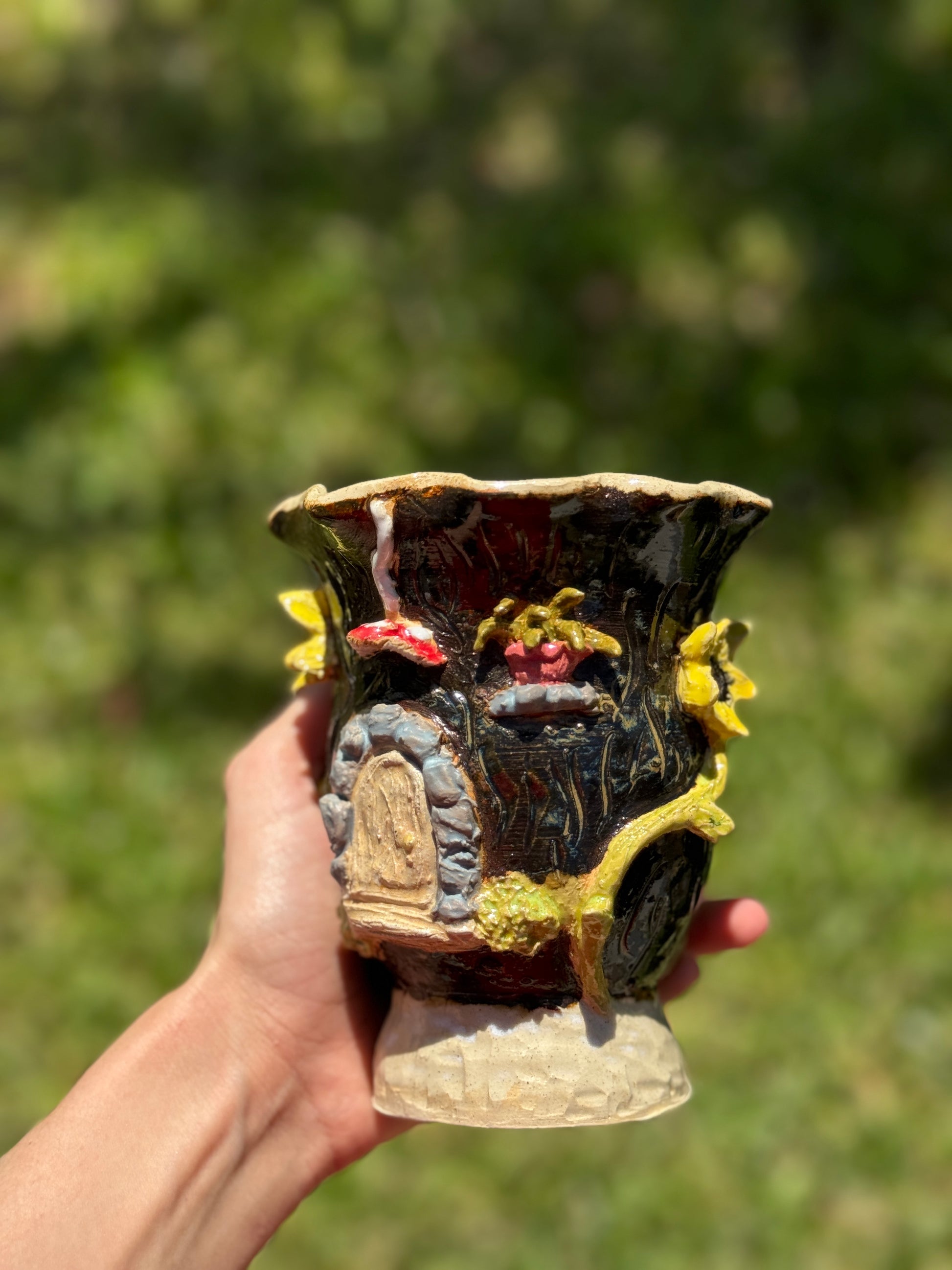 A charming fairy house vase designed to resemble a tiny enchanted cottage. Perfect for displaying flowers with a magical touch.