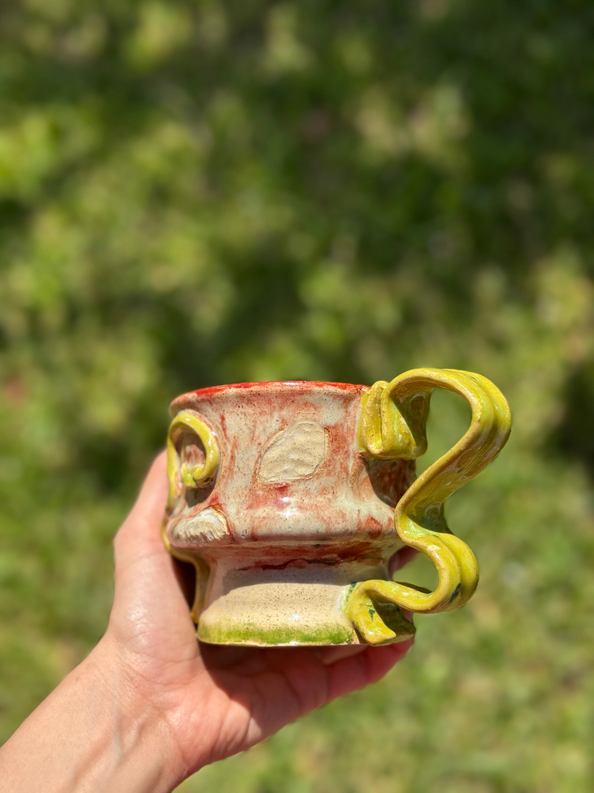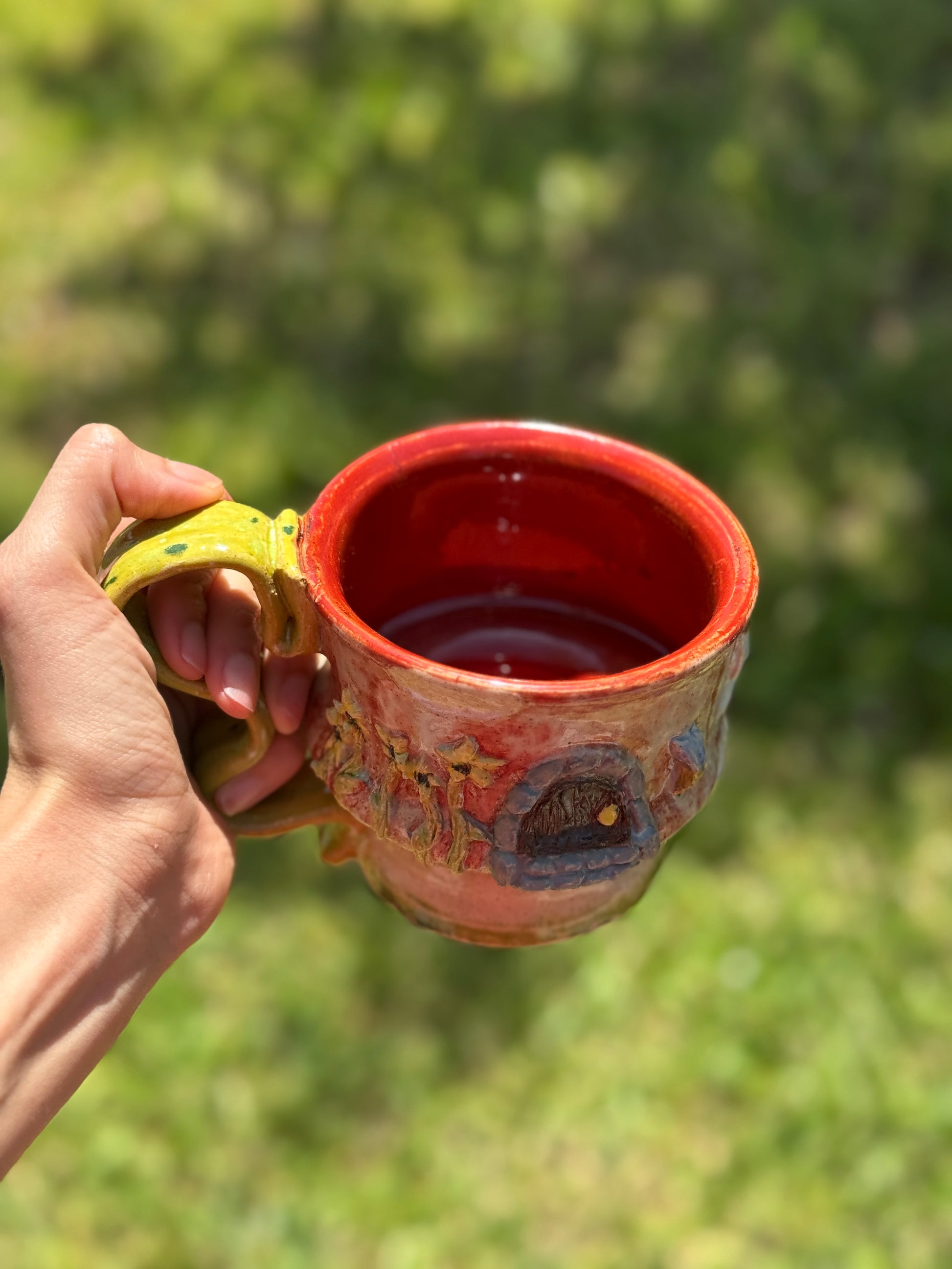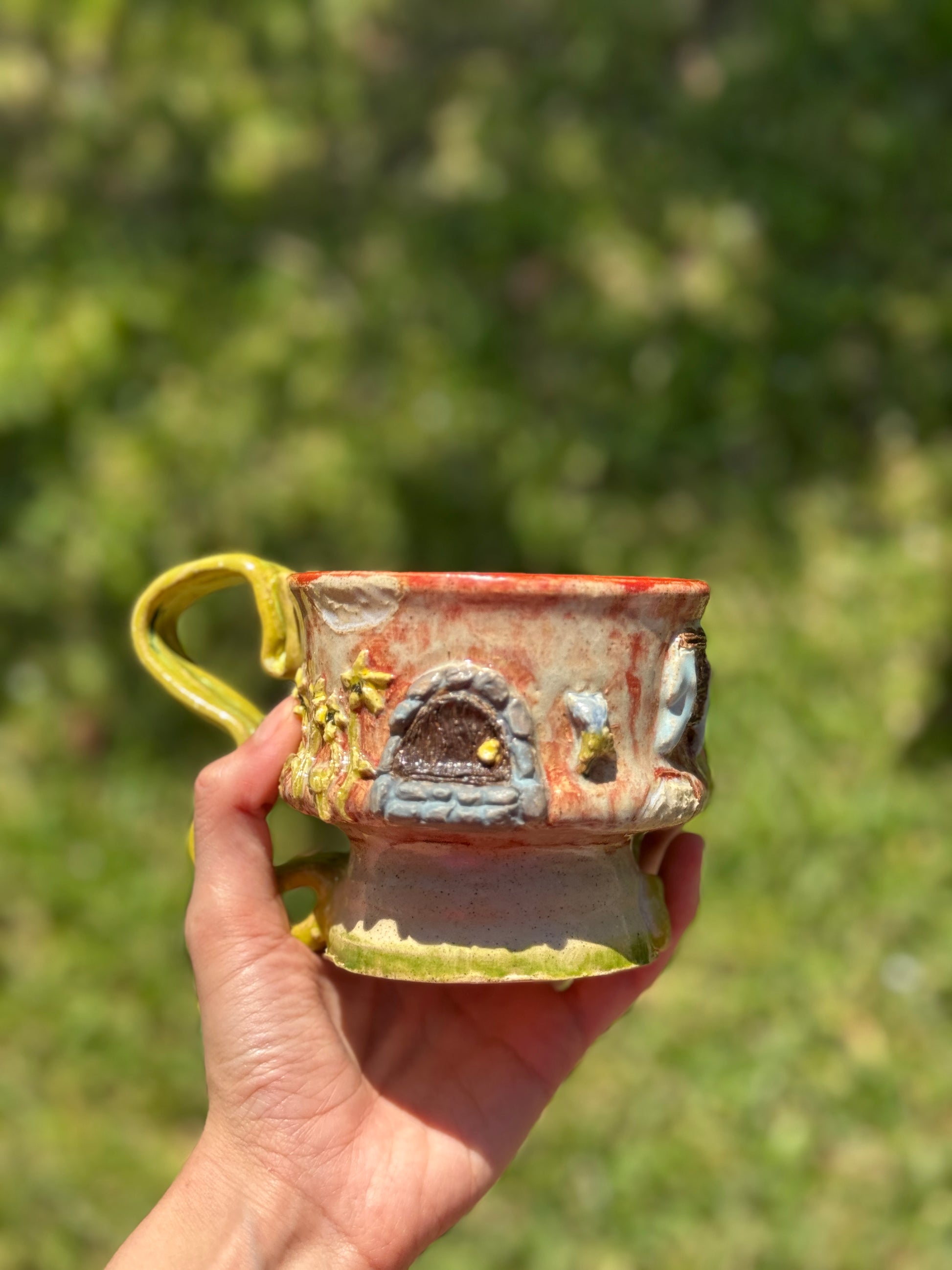 A whimsical mug shaped like a mushroom fairy house, complete with tiny windows and magical details! perfect for sipping in enchanted style.