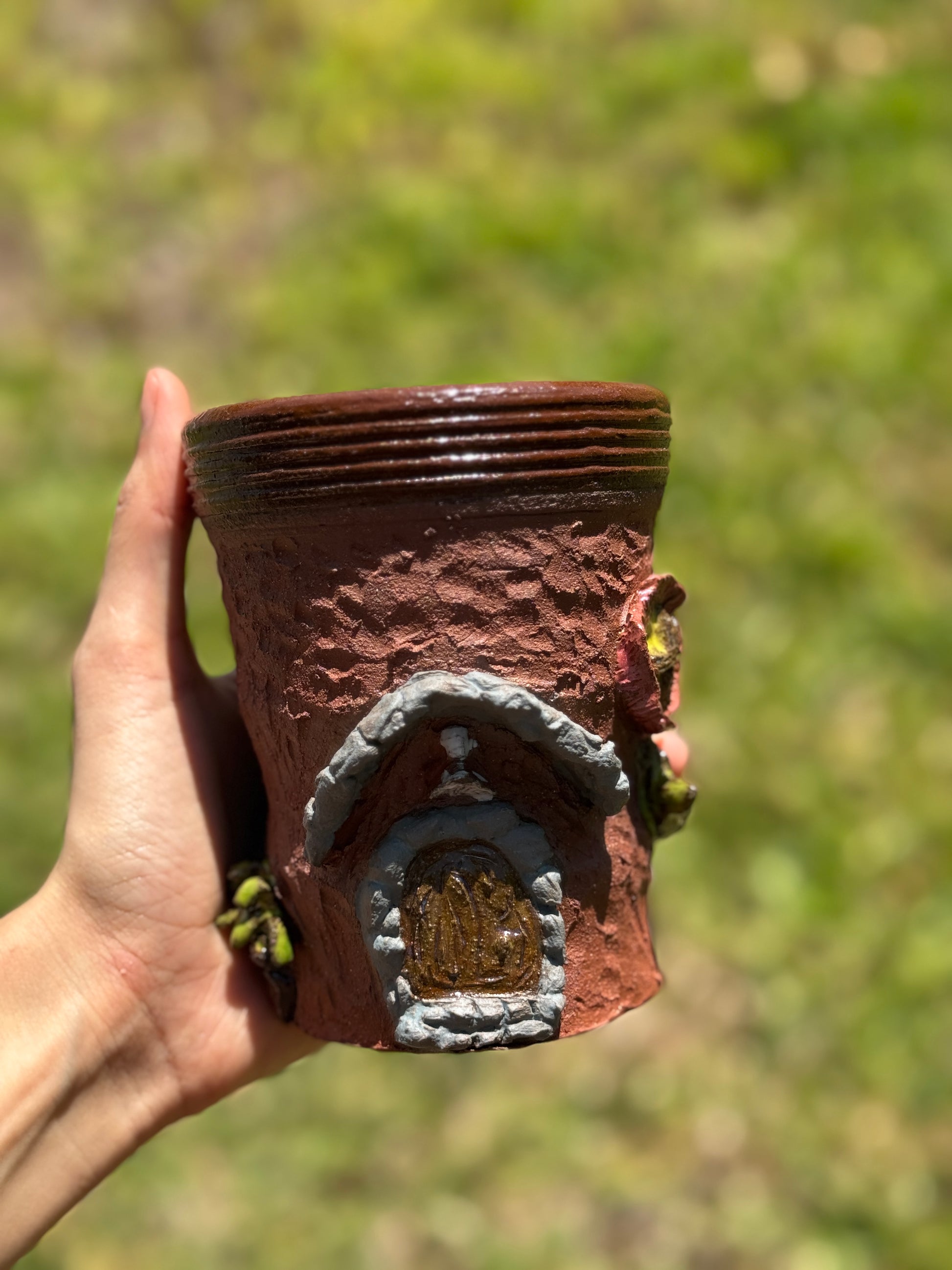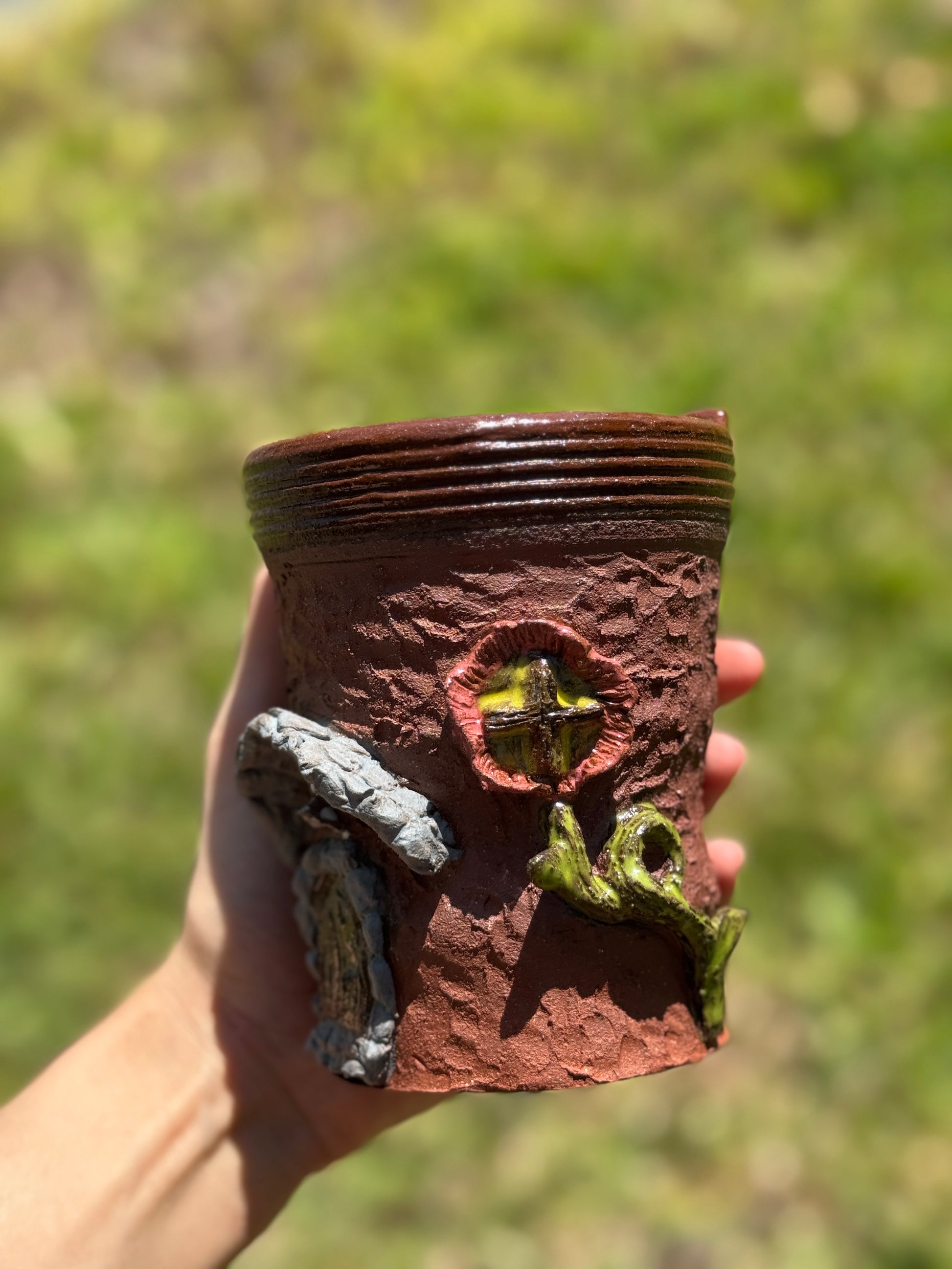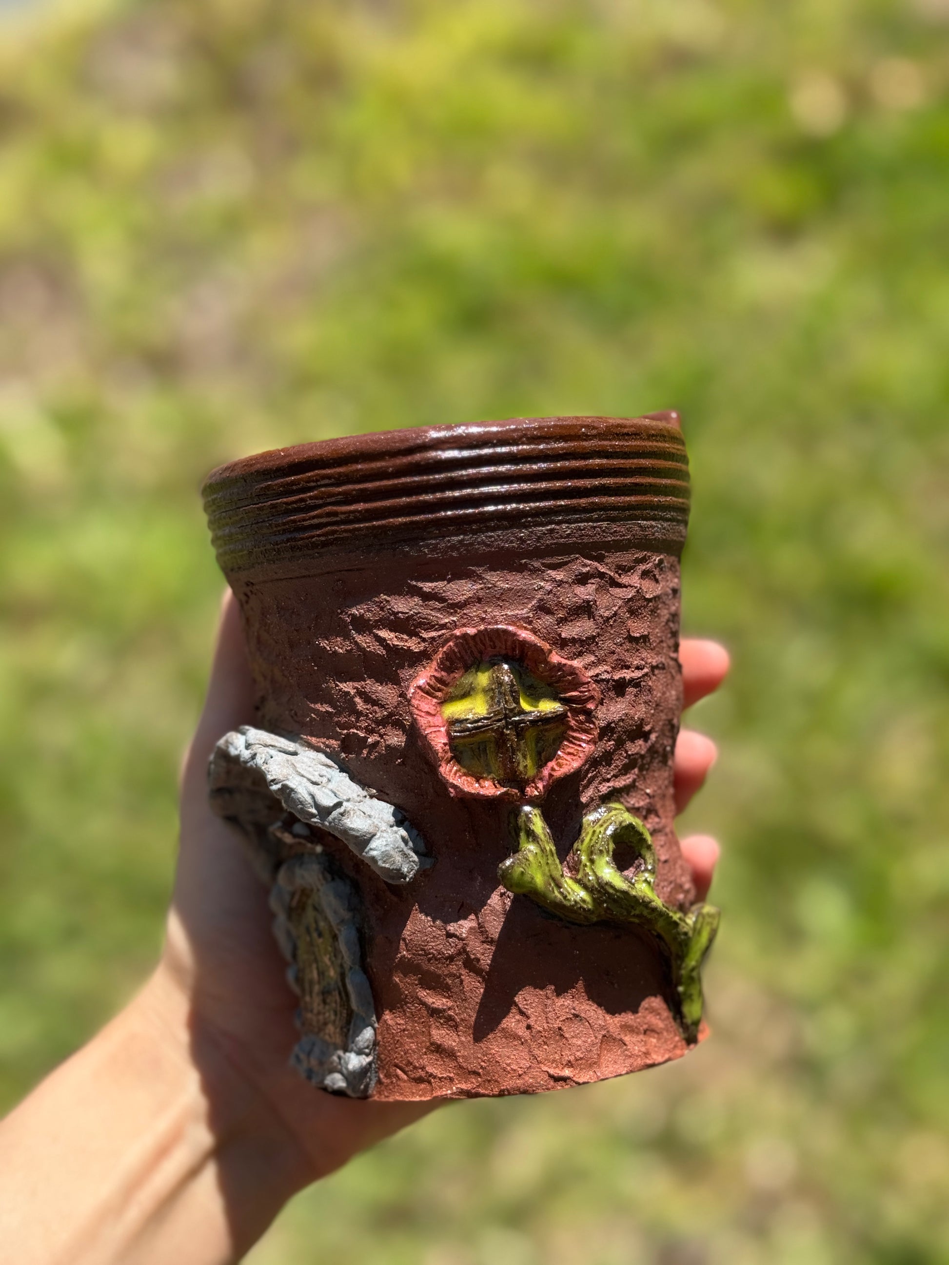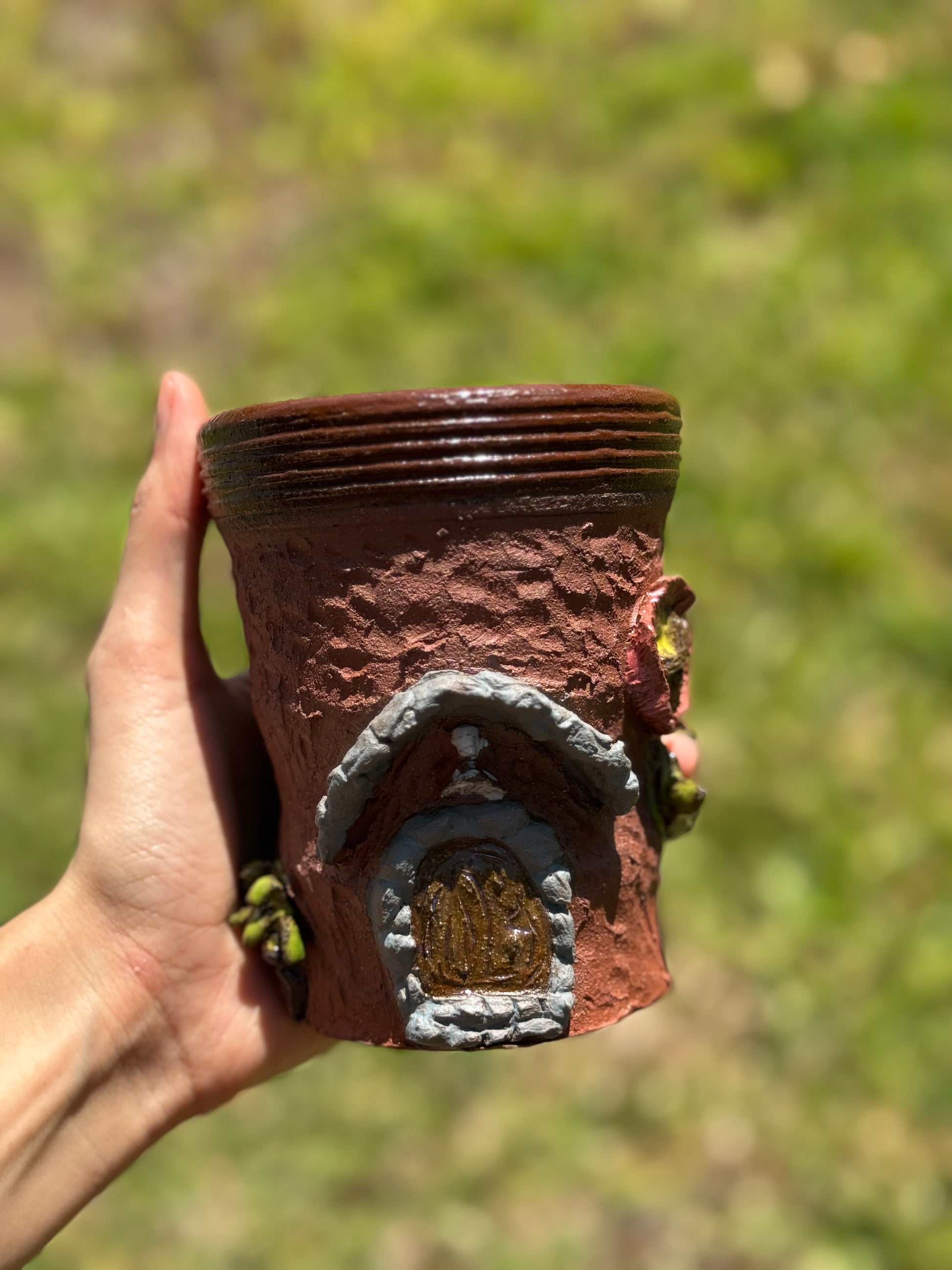 A fairy inspired wooden to go mug design featuring a flower shaped window. Combining natural charm with a touch of magic for your everyday adventures.