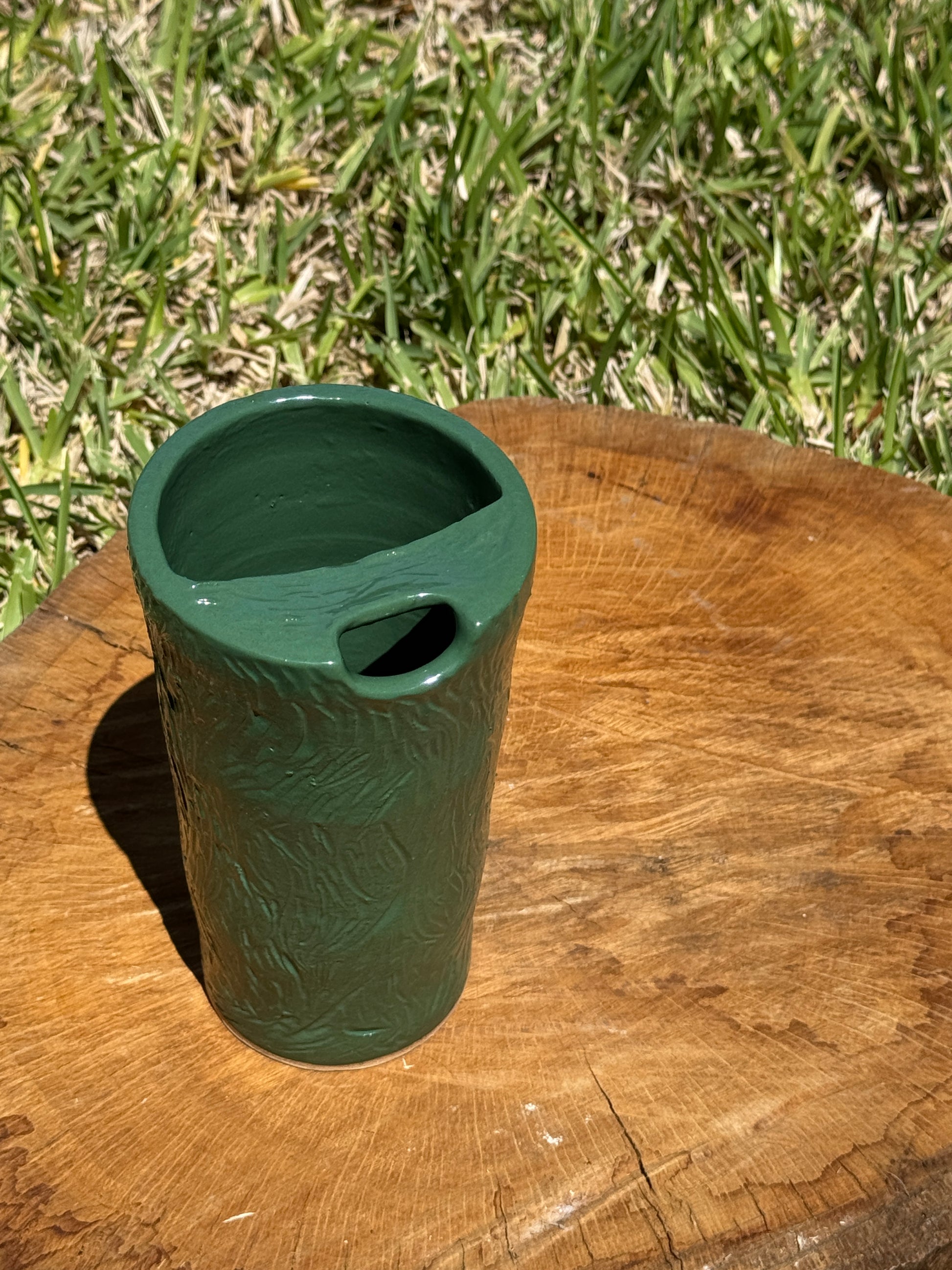 A glossy green travel mug with carved details, artisanal texture for a perfect balance of style and functionality on the go.