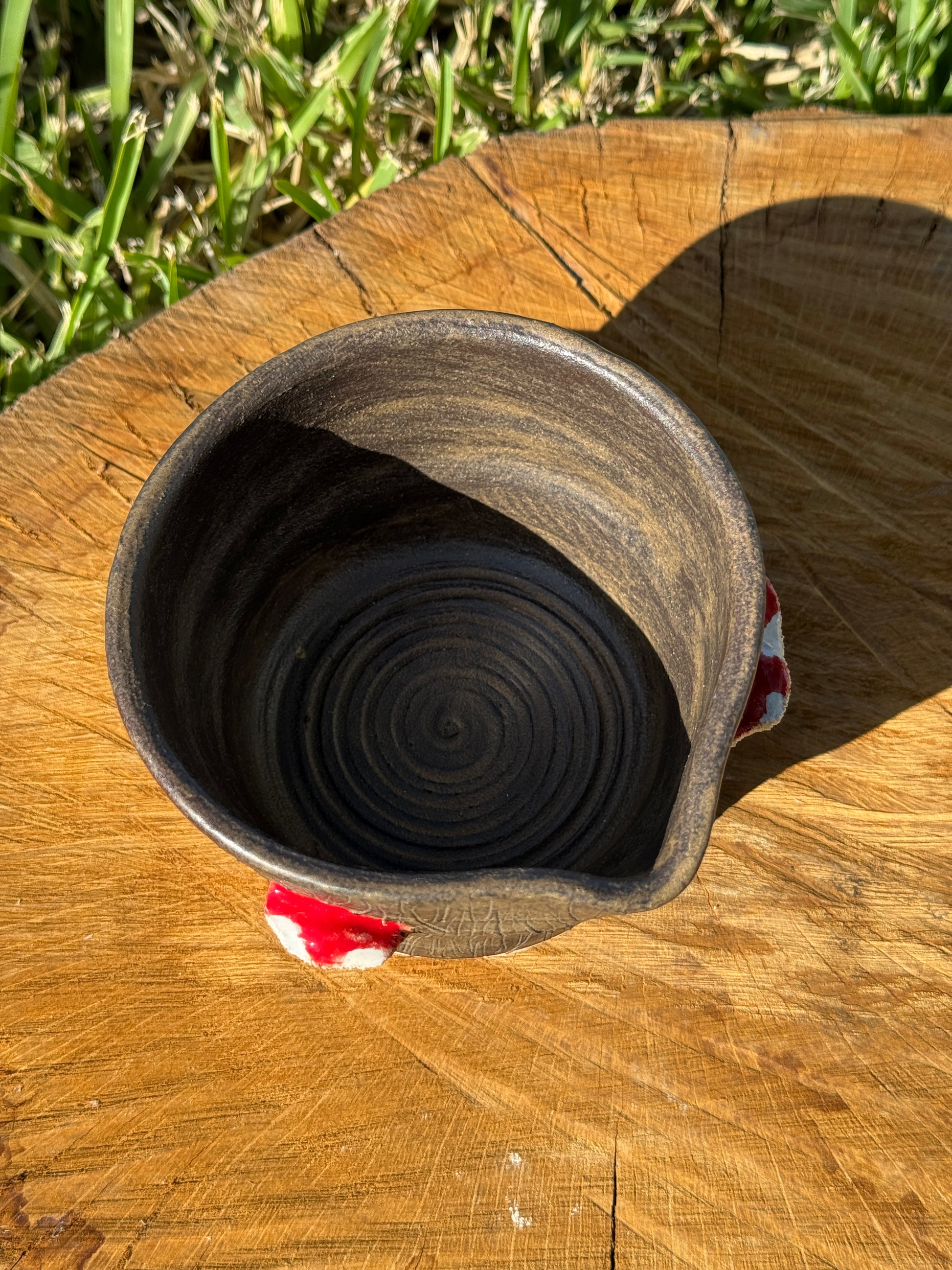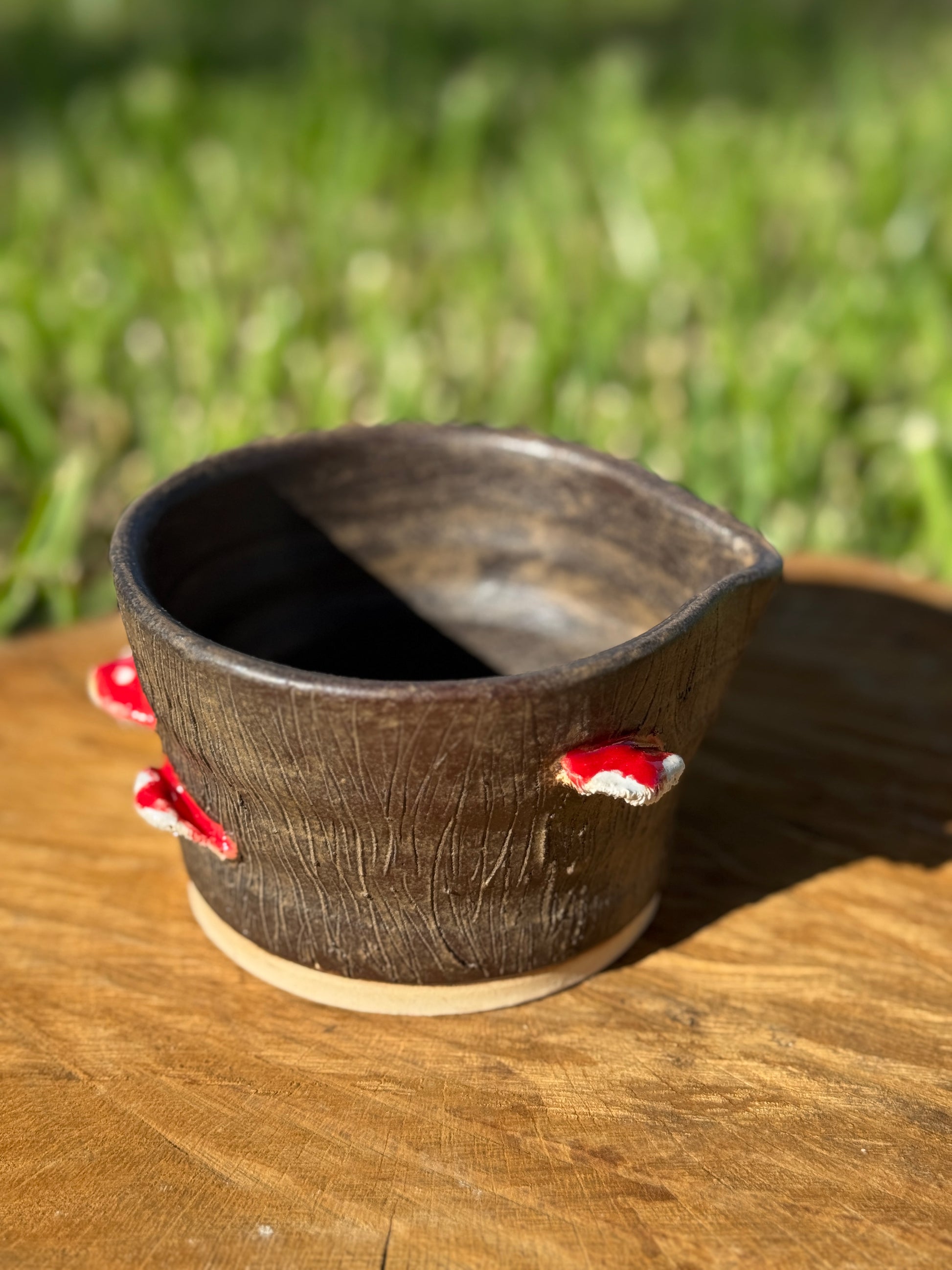 A mushroom themed ceramic matcha bowl with a wooden texture finish.