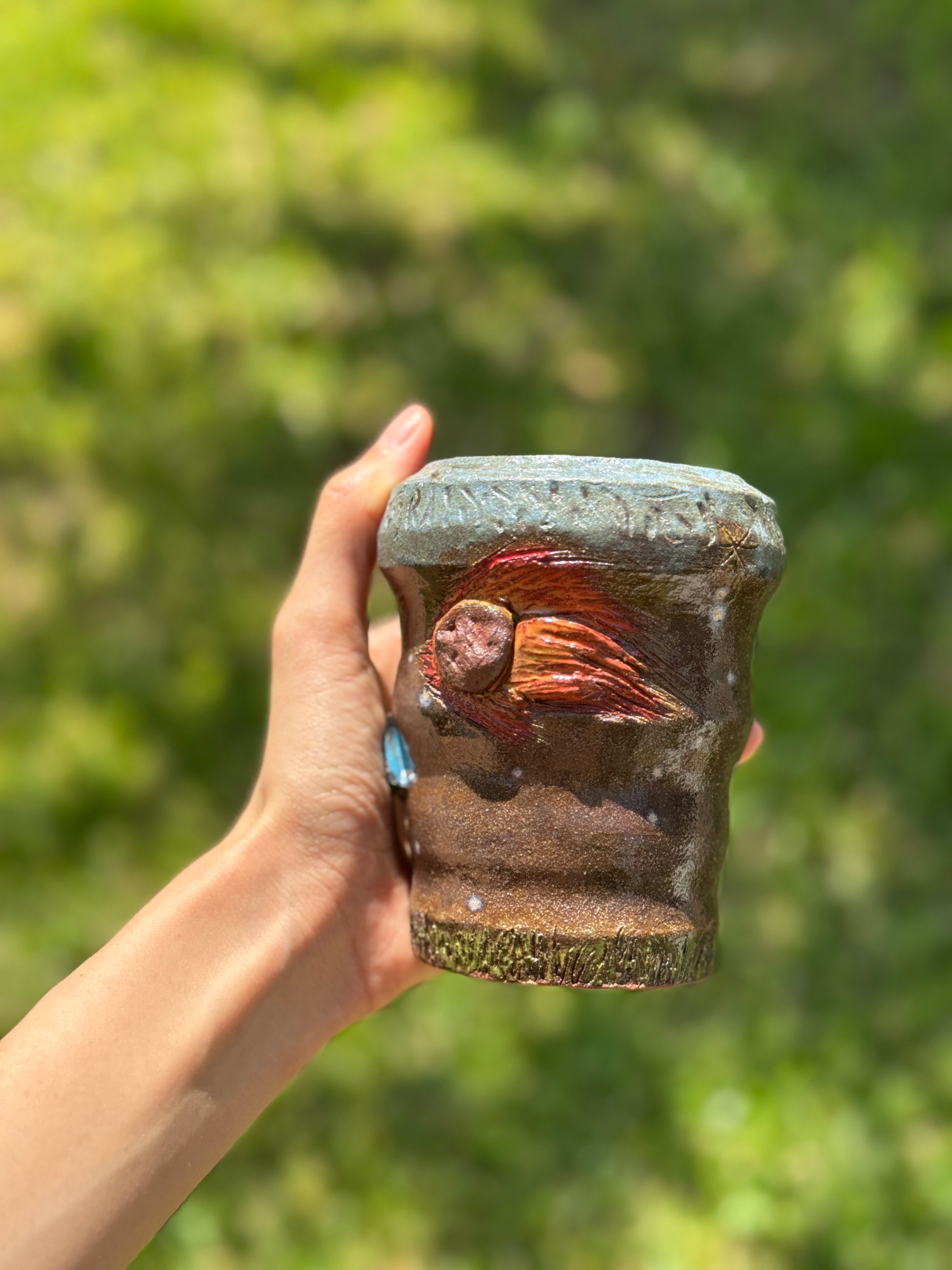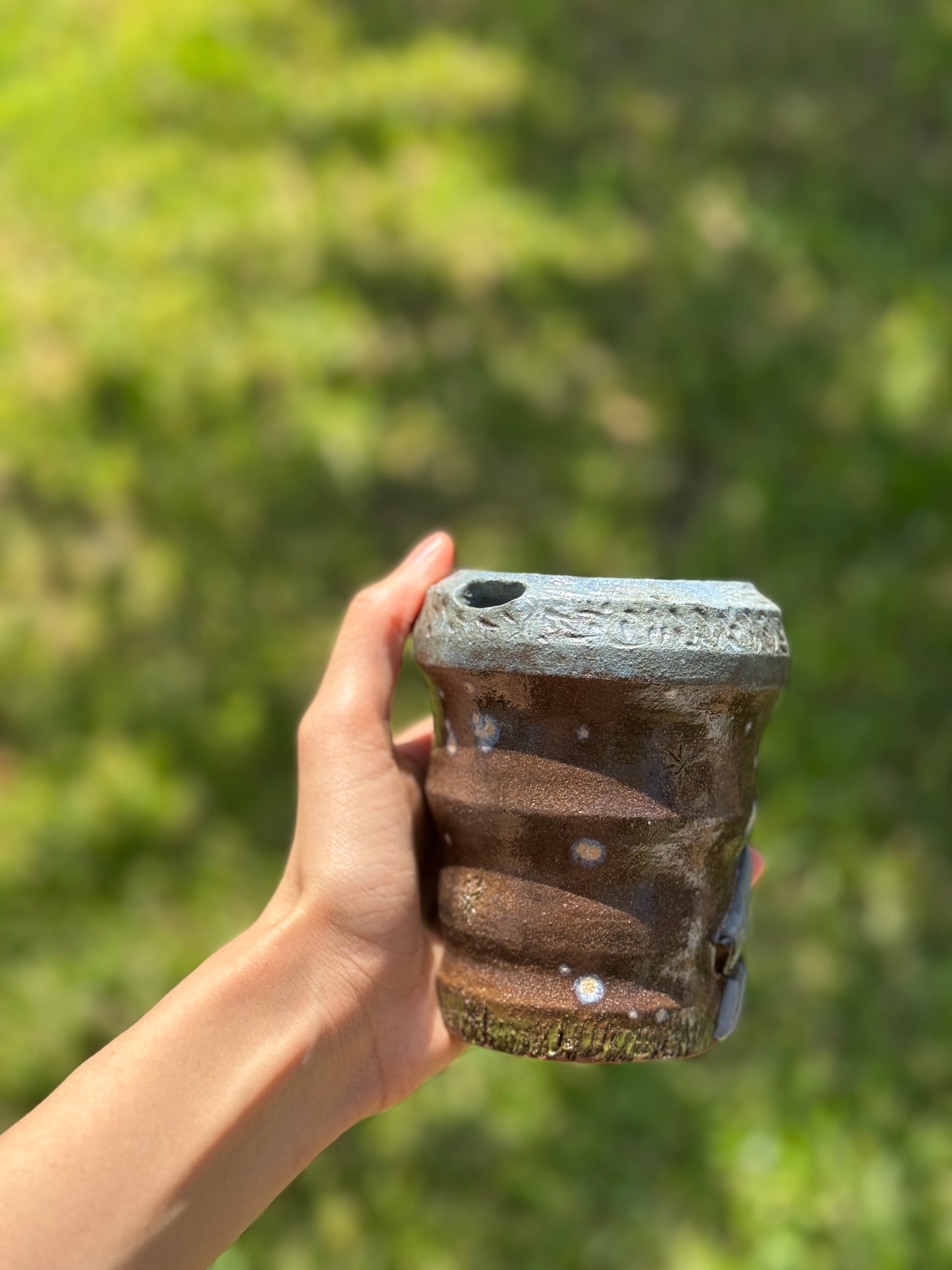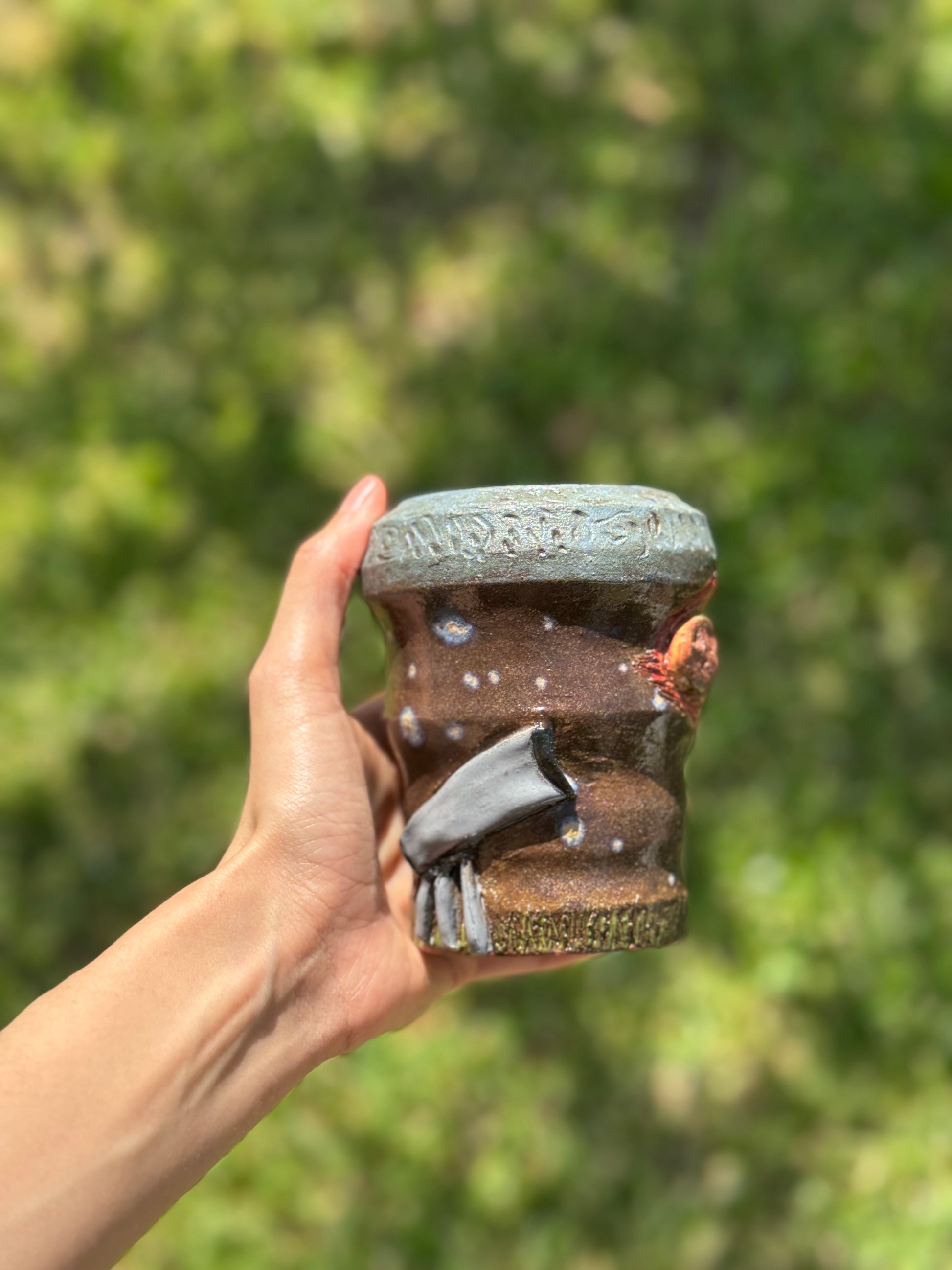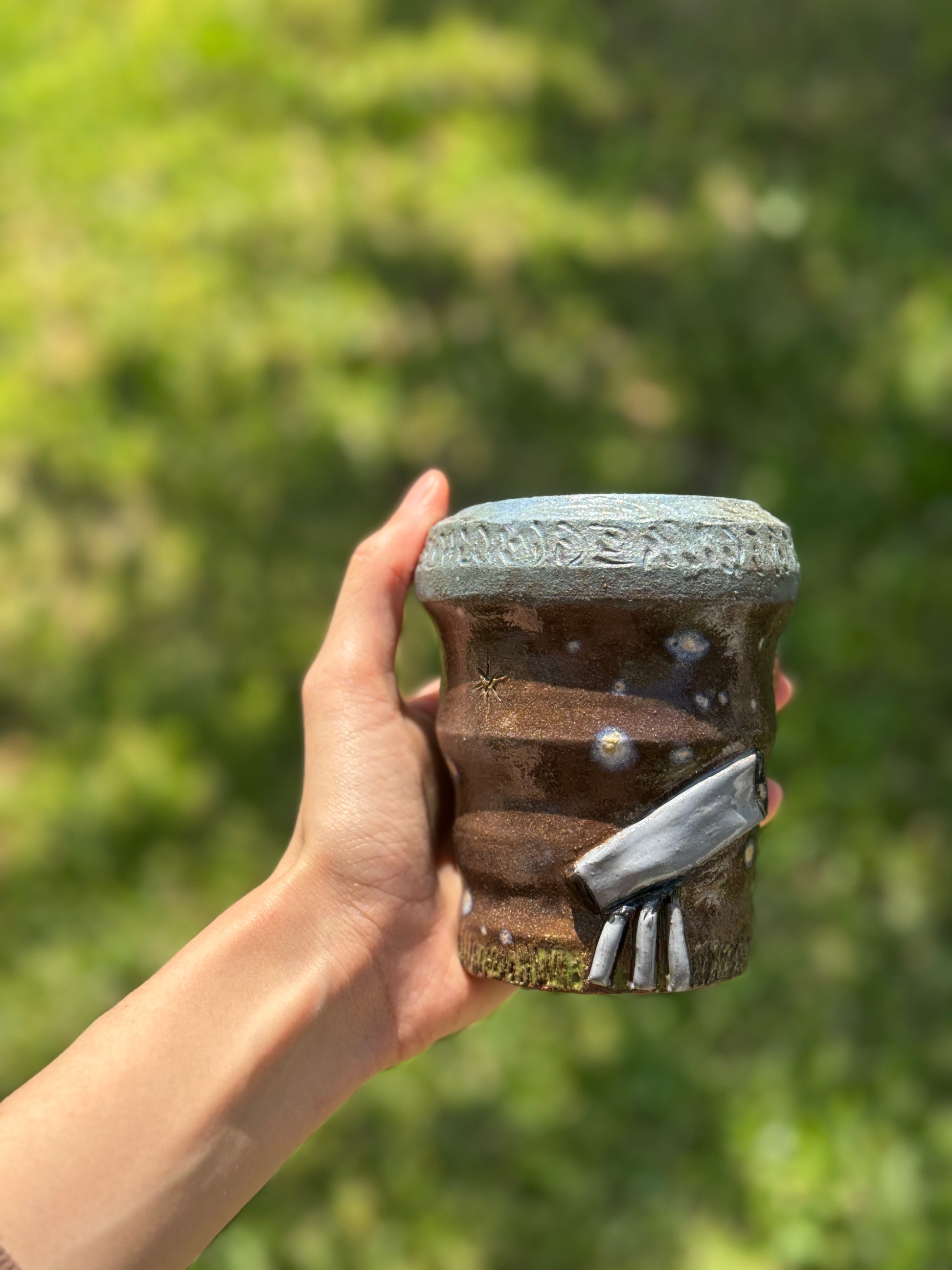 A to-go mug design with the moon at the top, a telescope pointed toward the stars, and a meteor streaking across the sky! perfect for stargazers on the move.