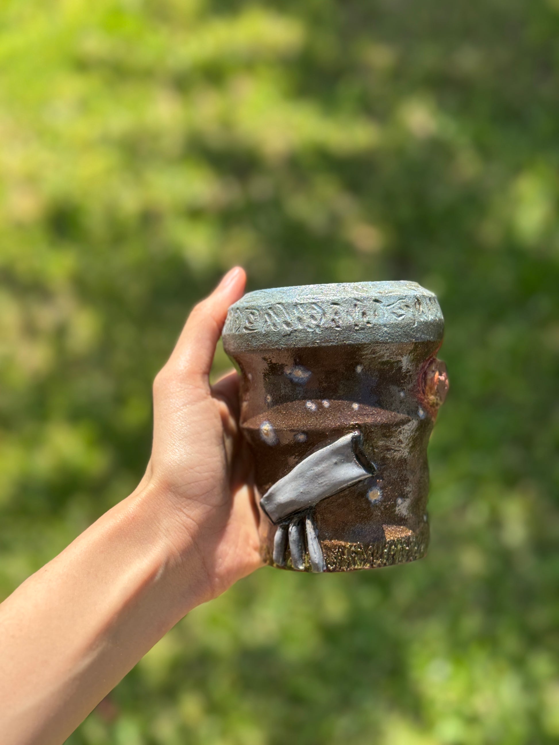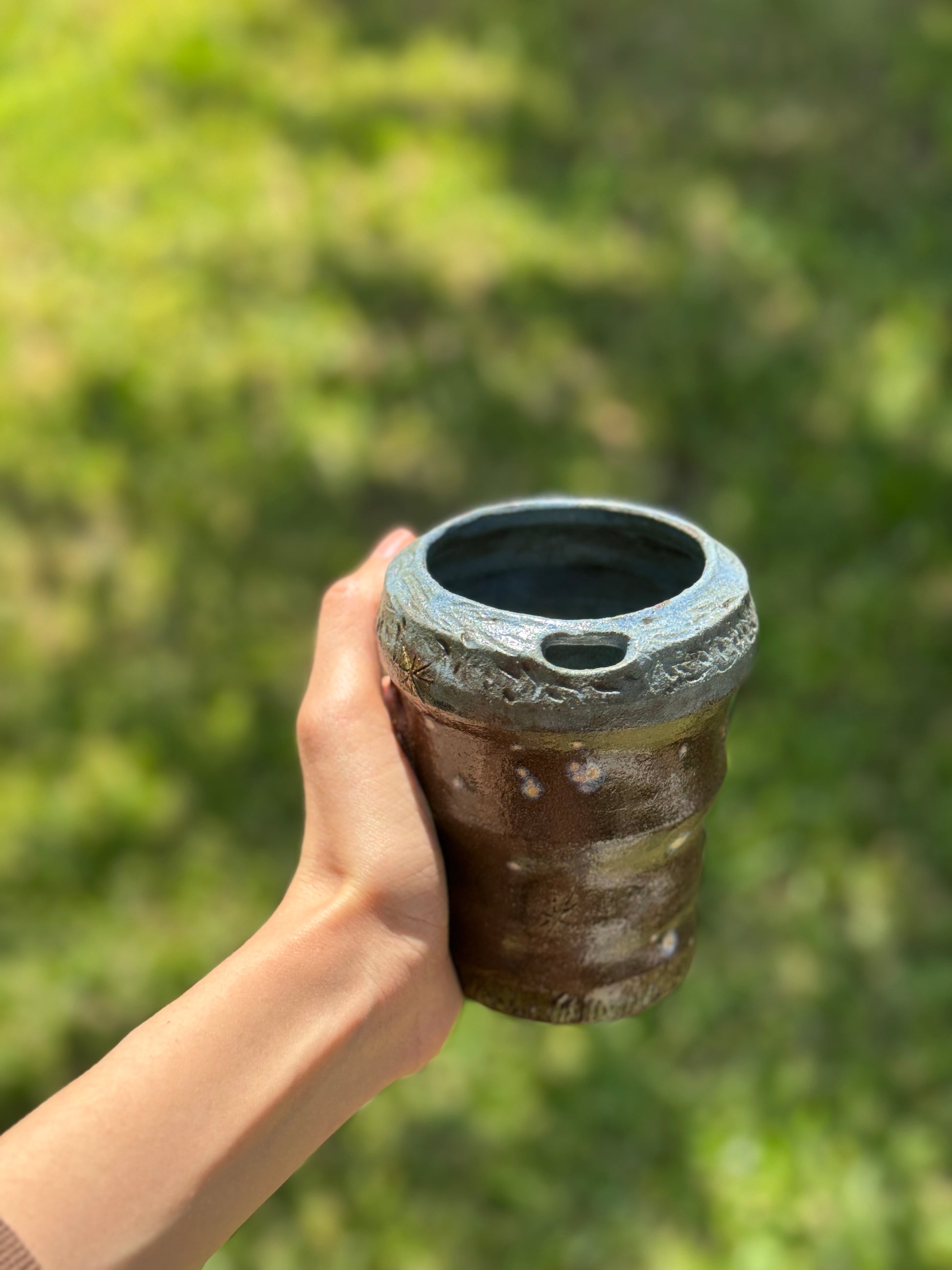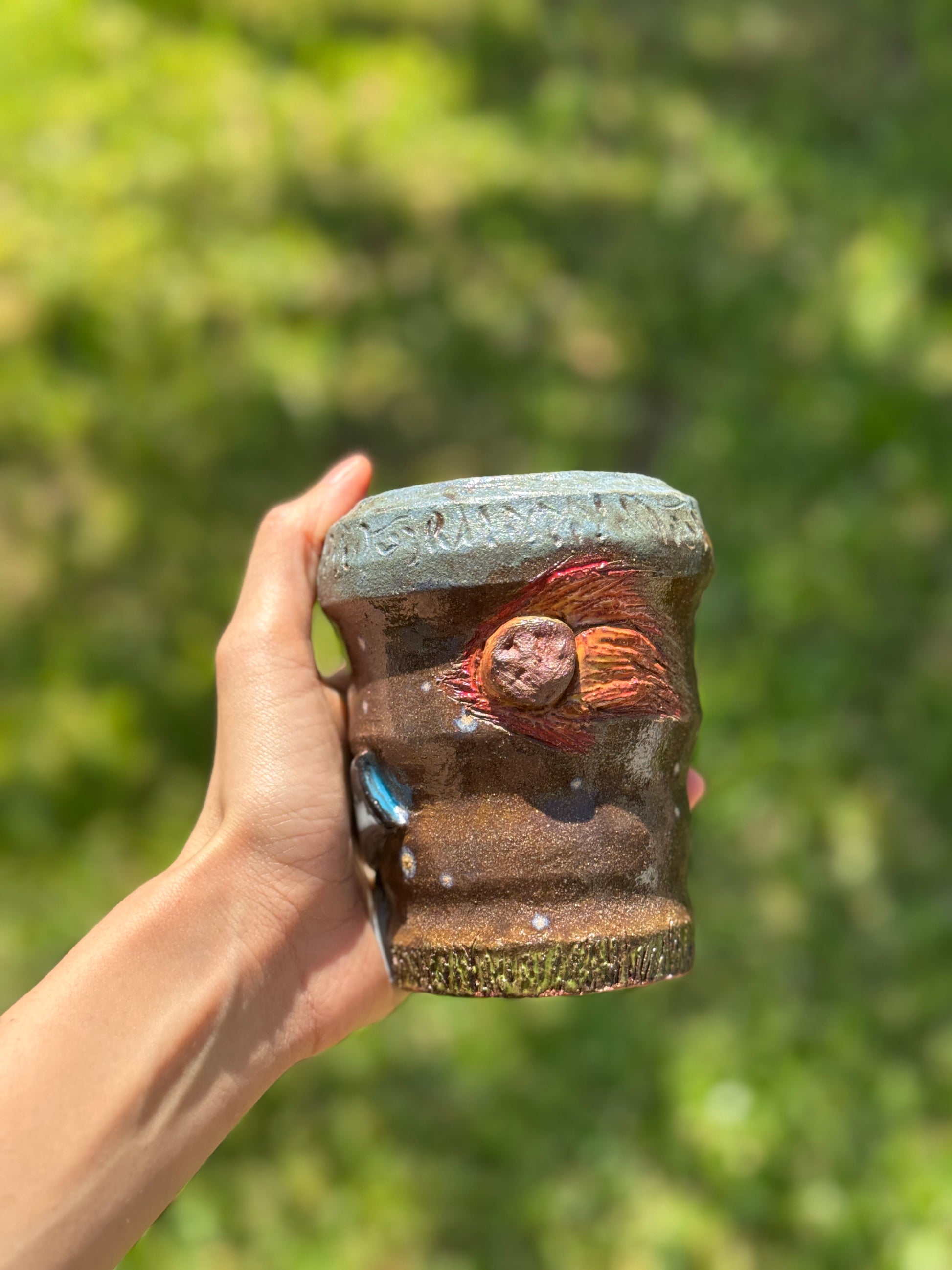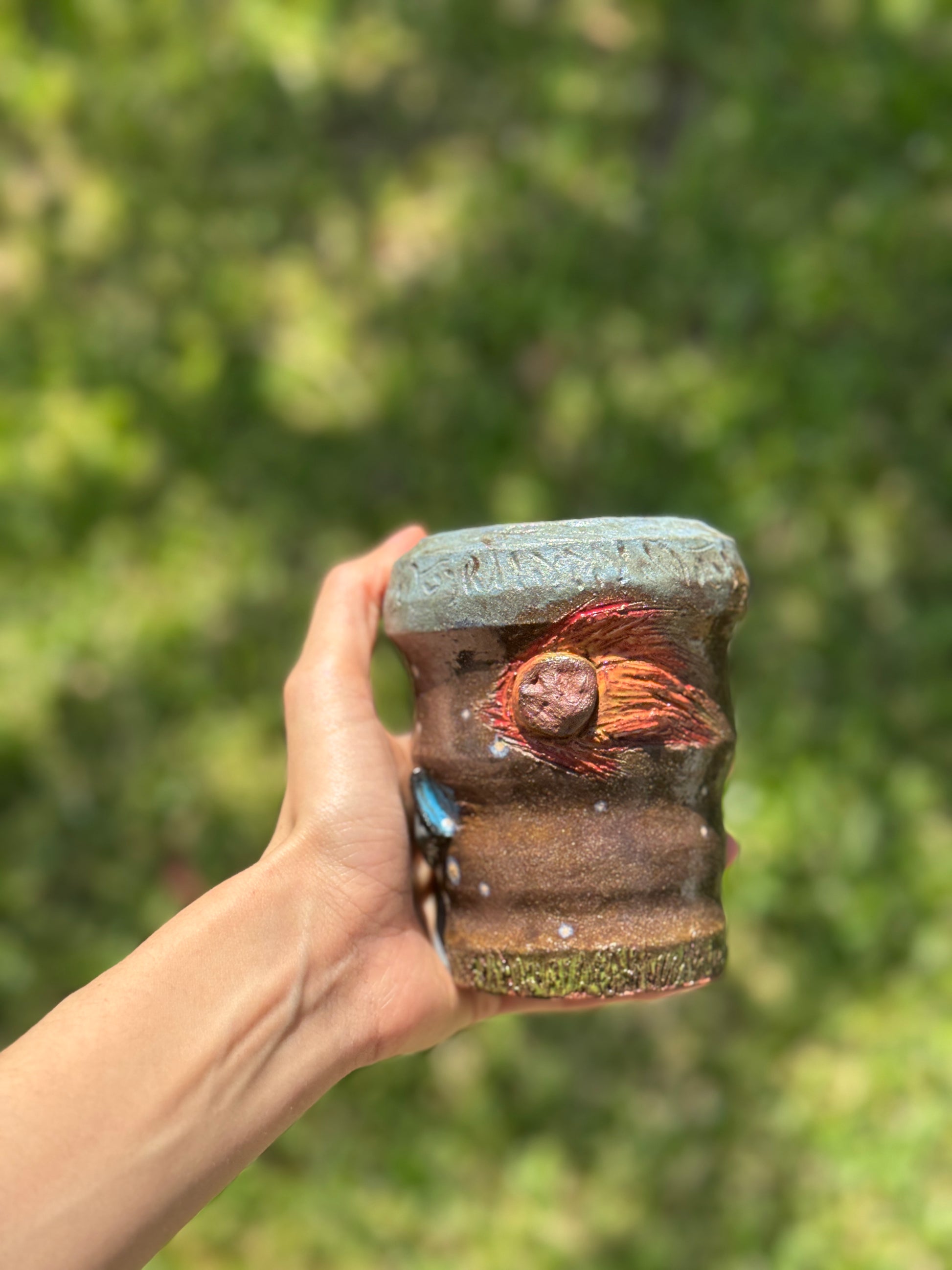 A to-go mug design with the moon at the top, a telescope pointed toward the stars, and a meteor streaking across the sky! perfect for stargazers on the move.