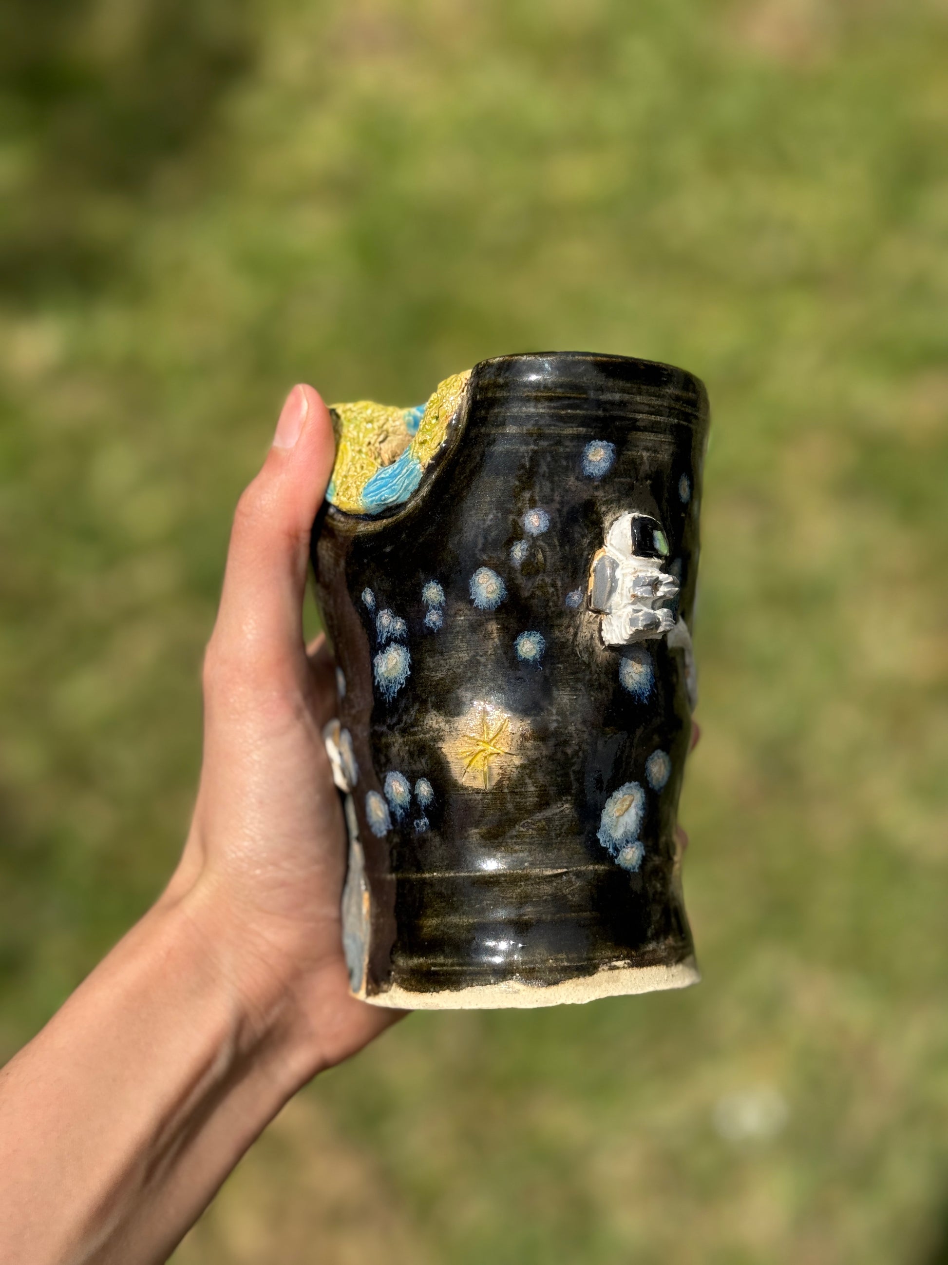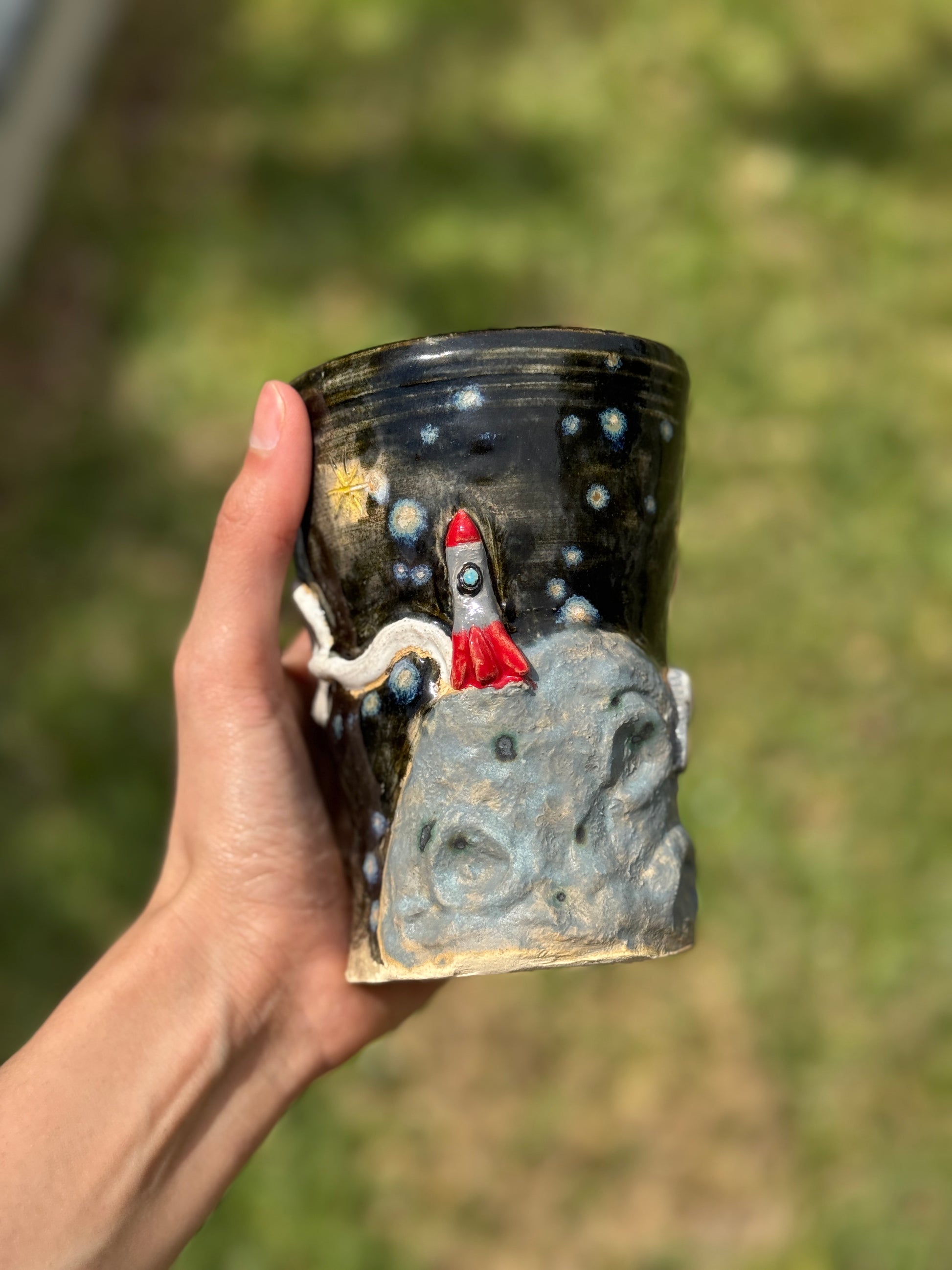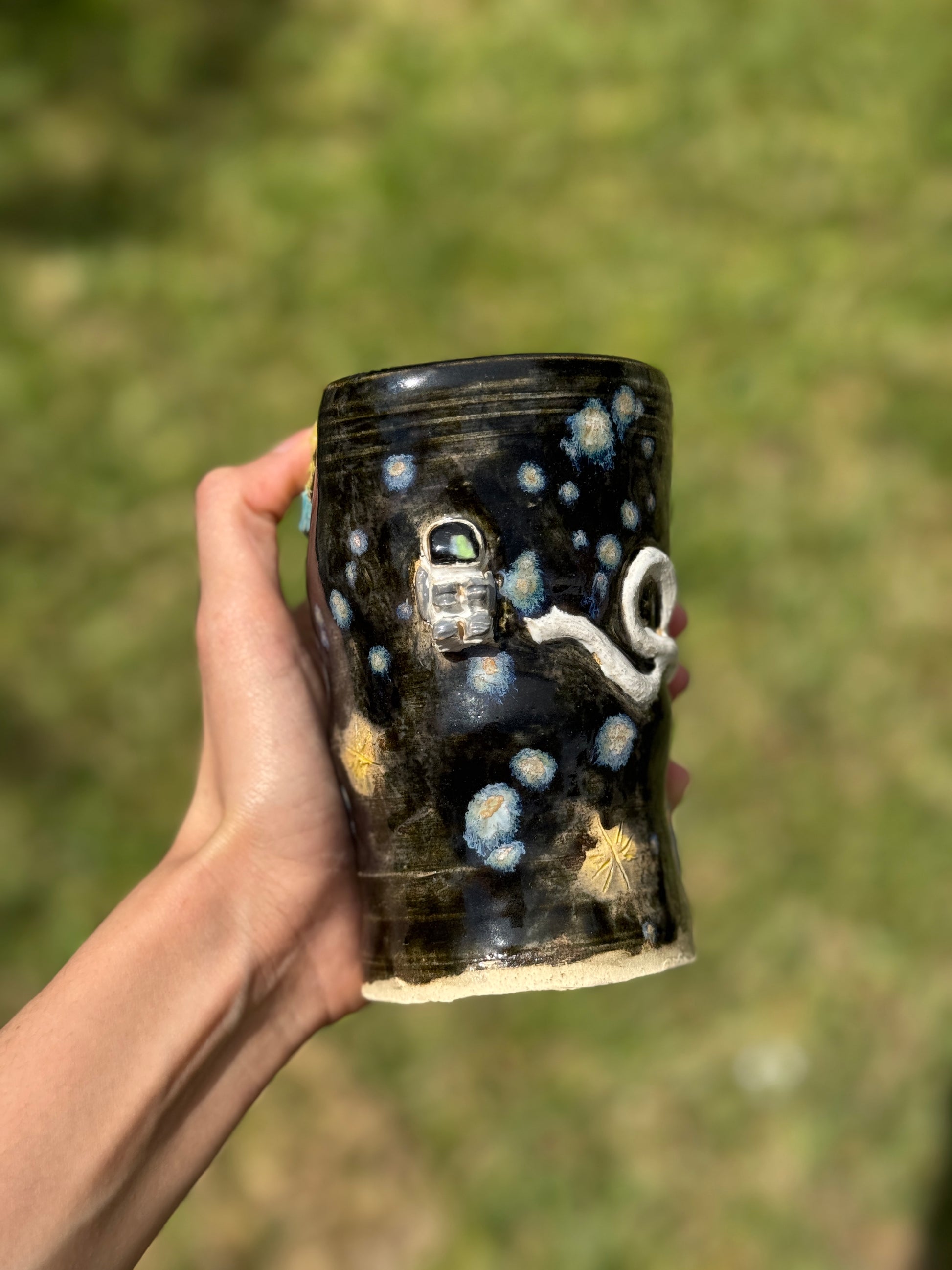 A to go straw mug featuring an astronaut on the moon, gazing at Earth in the distance. A dreamy space scene that brings the cosmos to every sip.