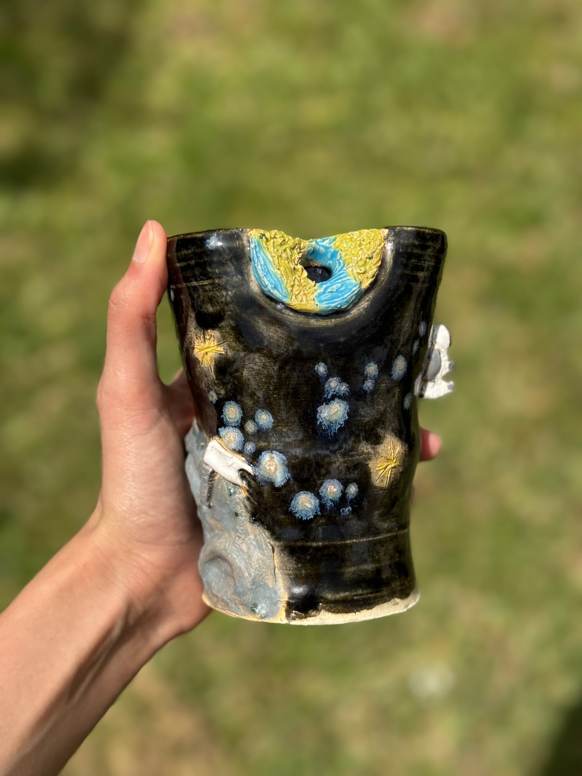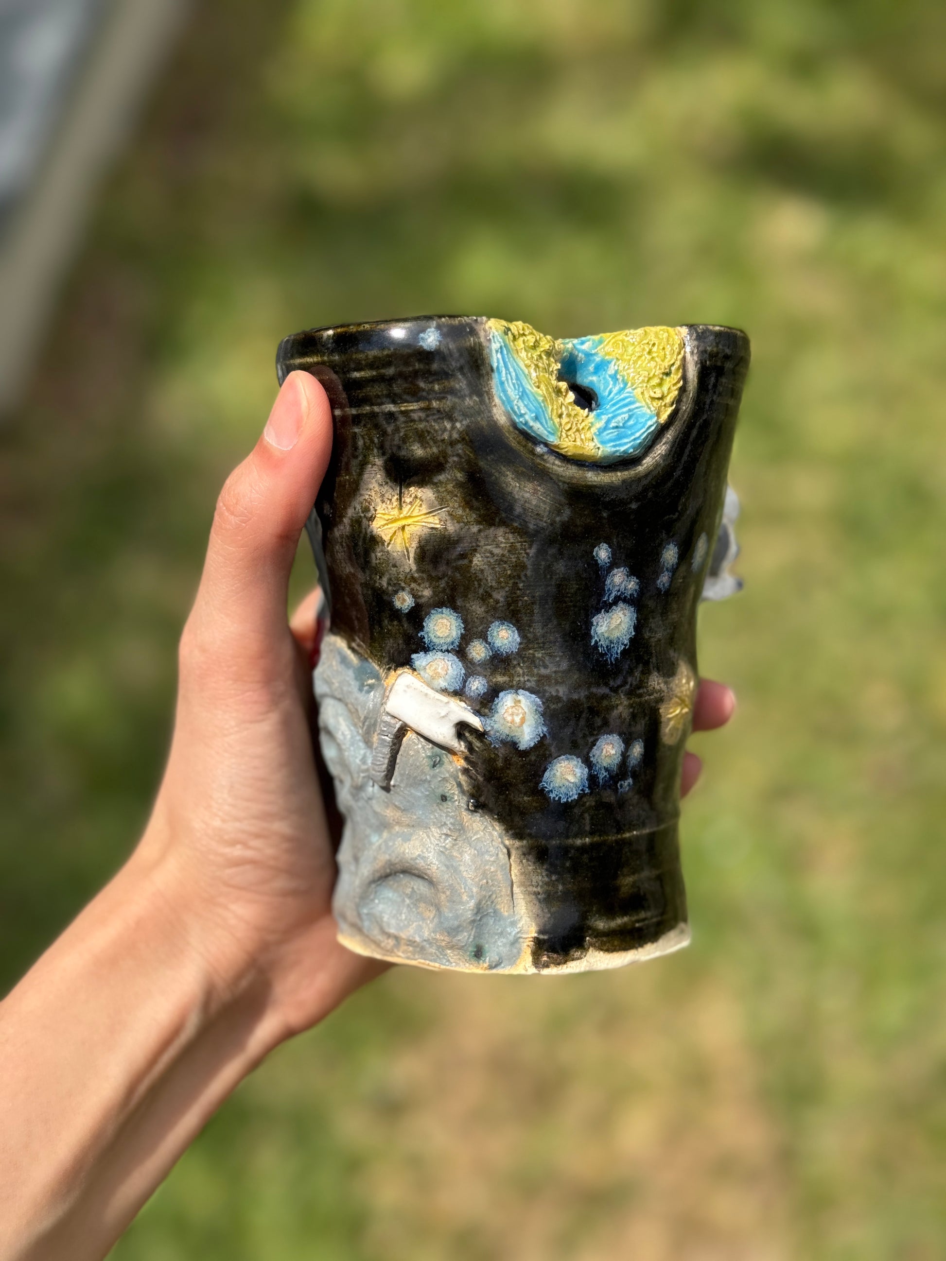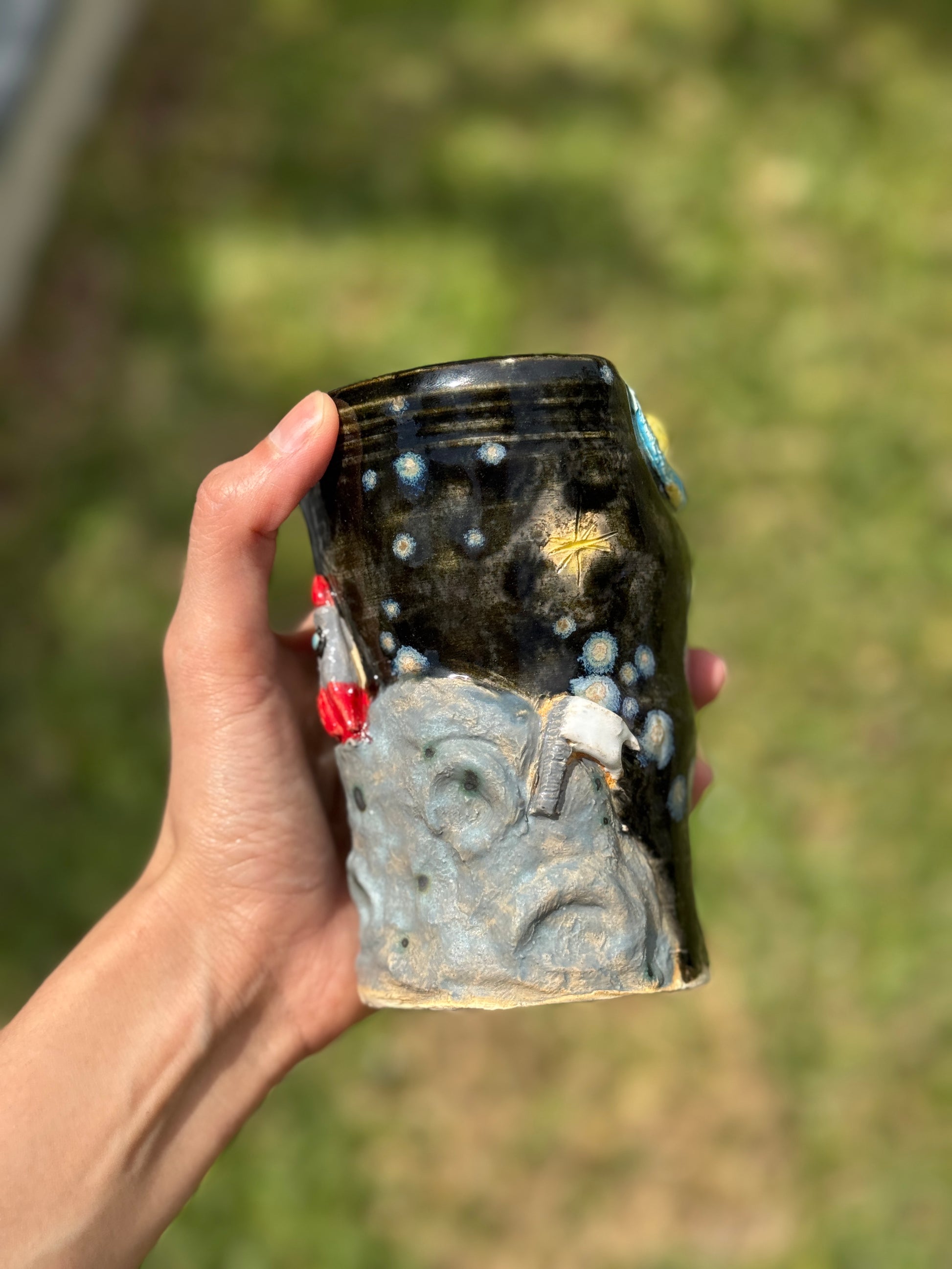 A to go straw mug featuring an astronaut on the moon, gazing at Earth in the distance. A dreamy space scene that brings the cosmos to every sip.