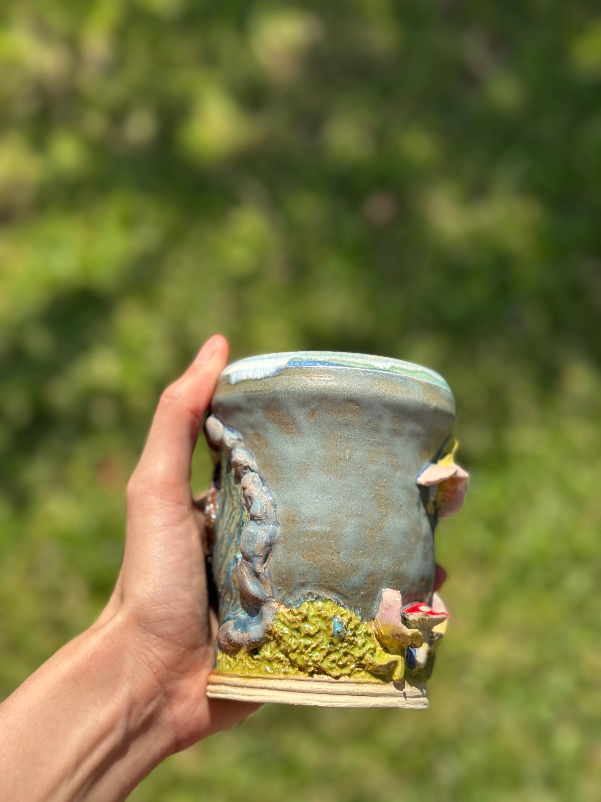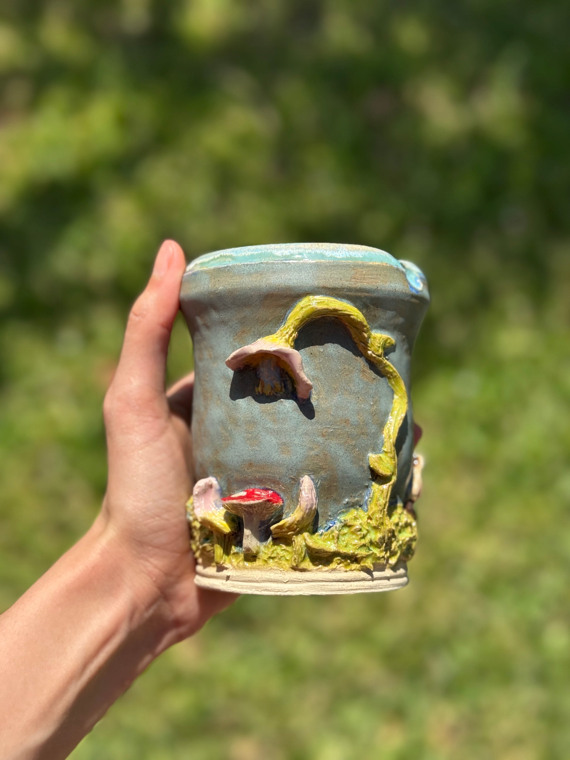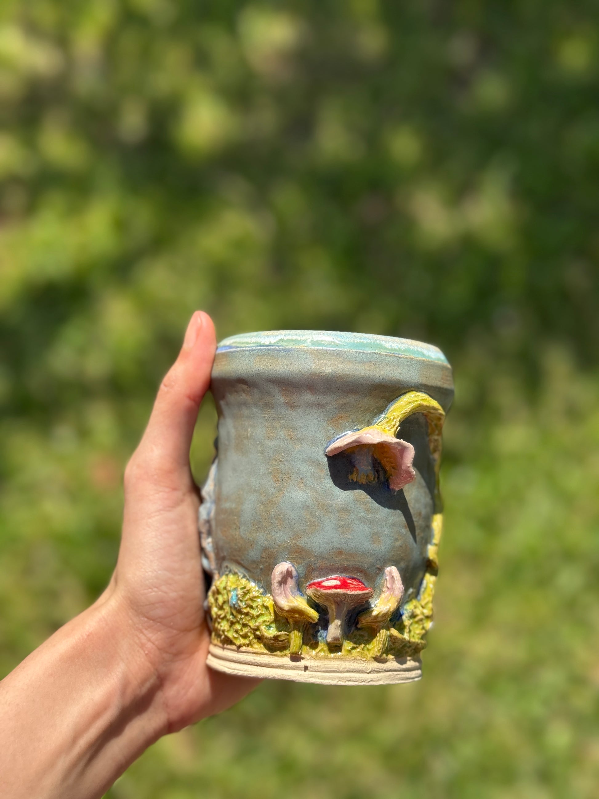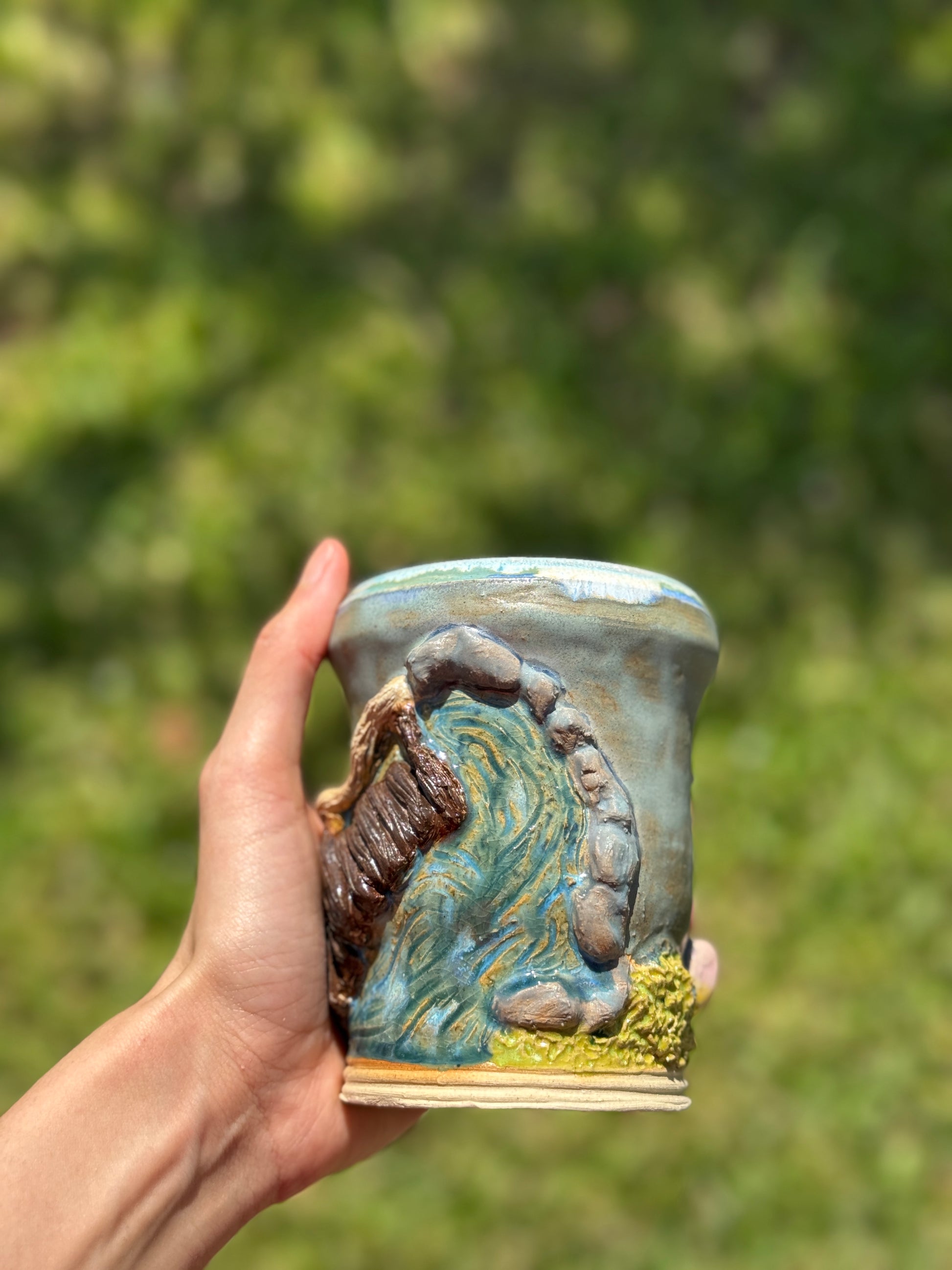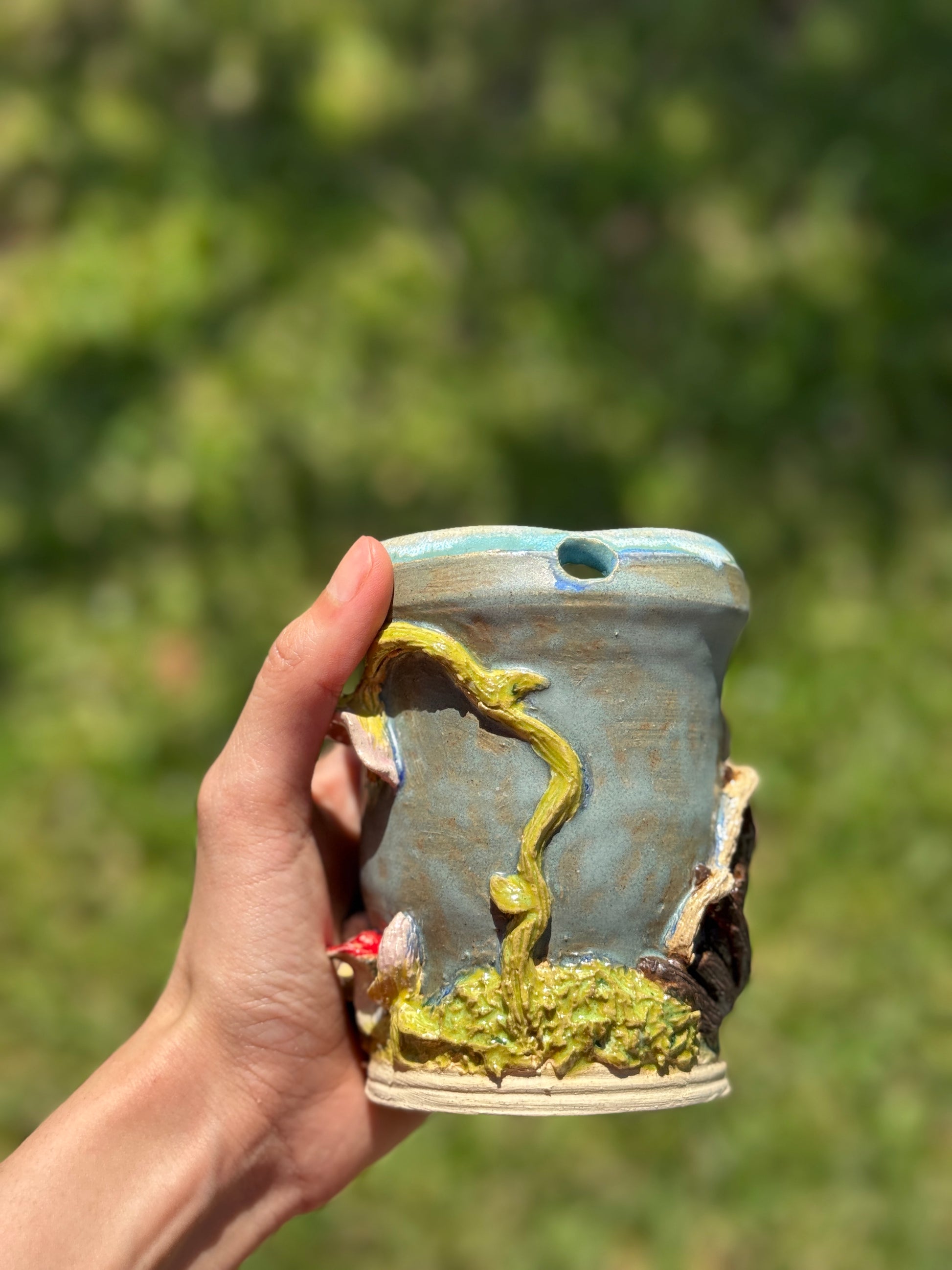 A whimsical to go mug piece depicting a serene river beside a magical dinner scene complete with a mushroom table and seats made of flowers. Capturing the charm of a fairytale feast in nature.