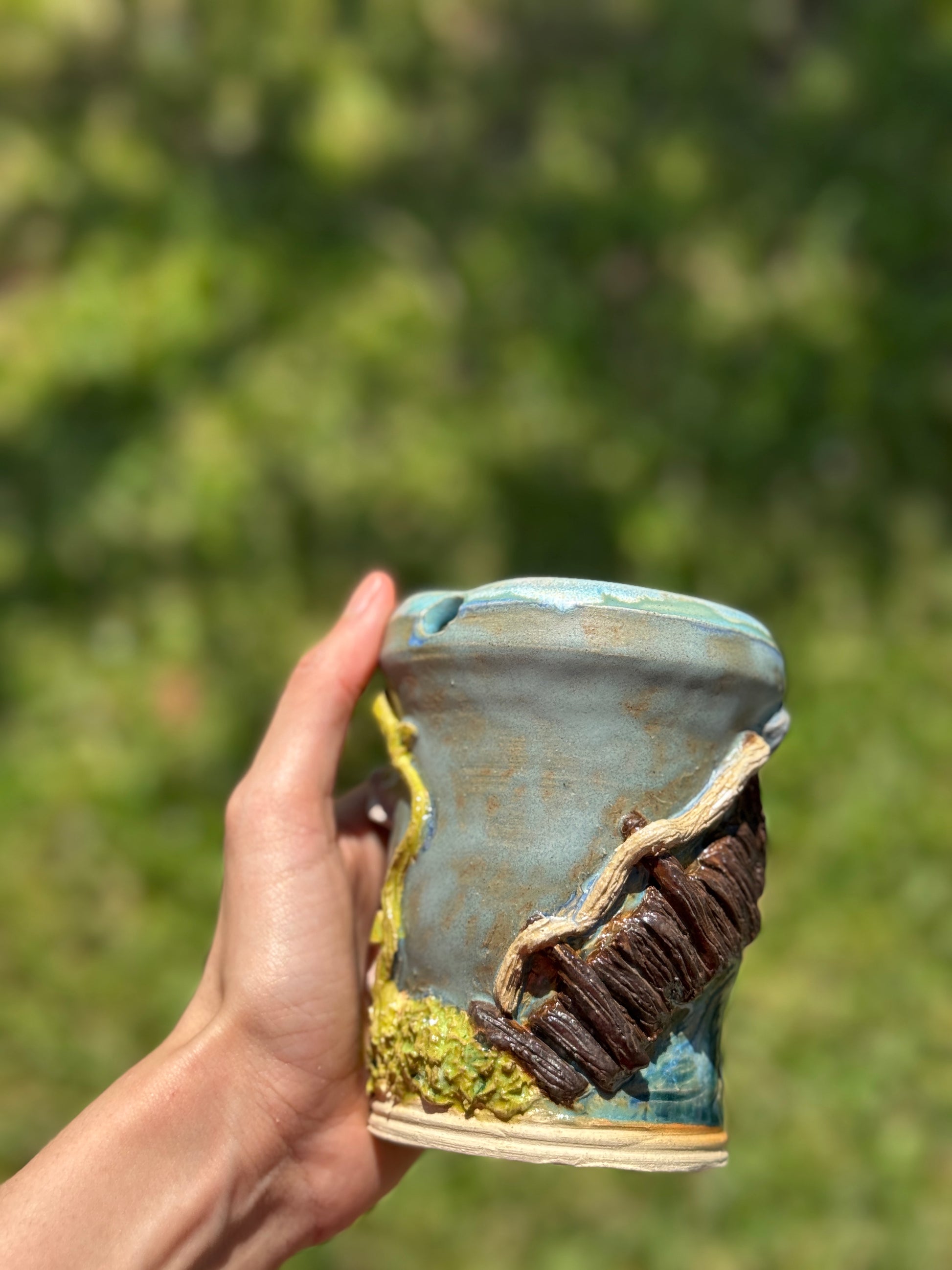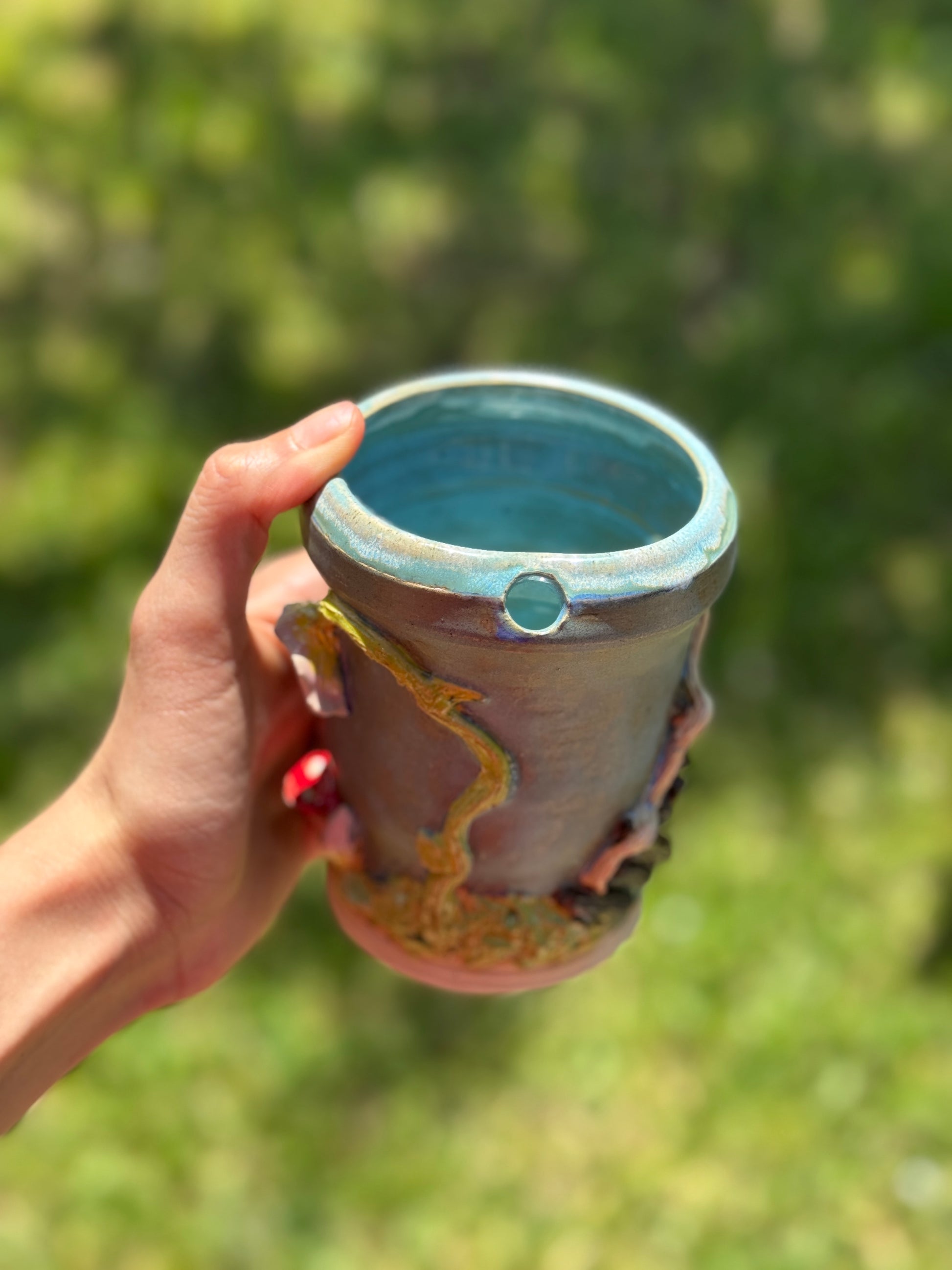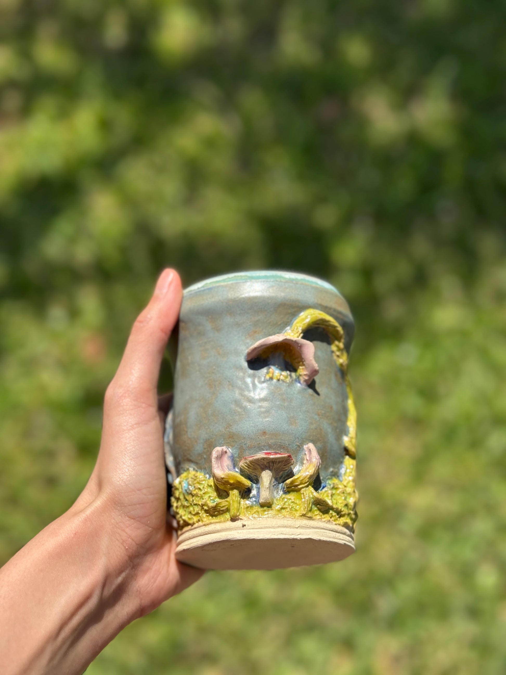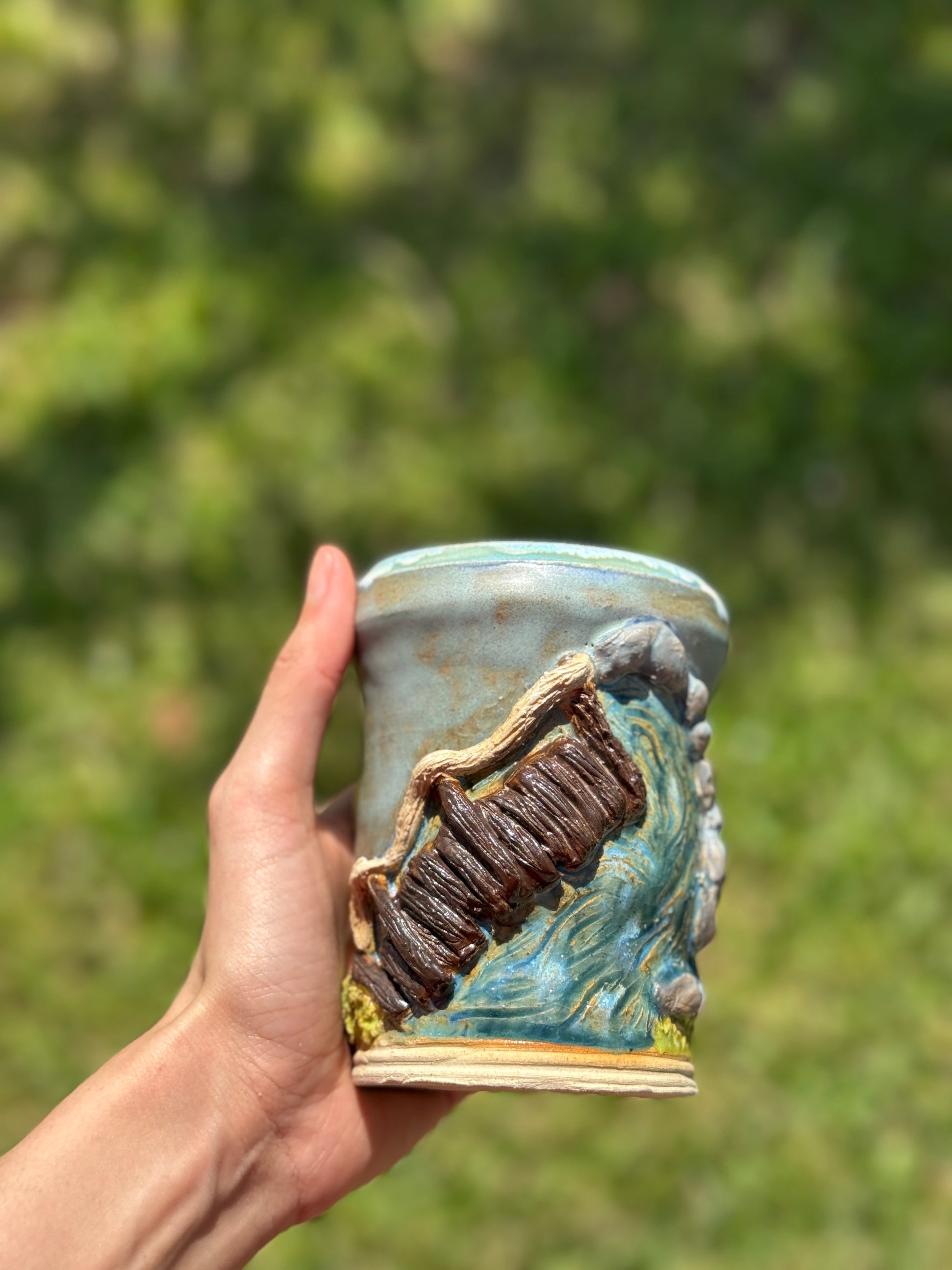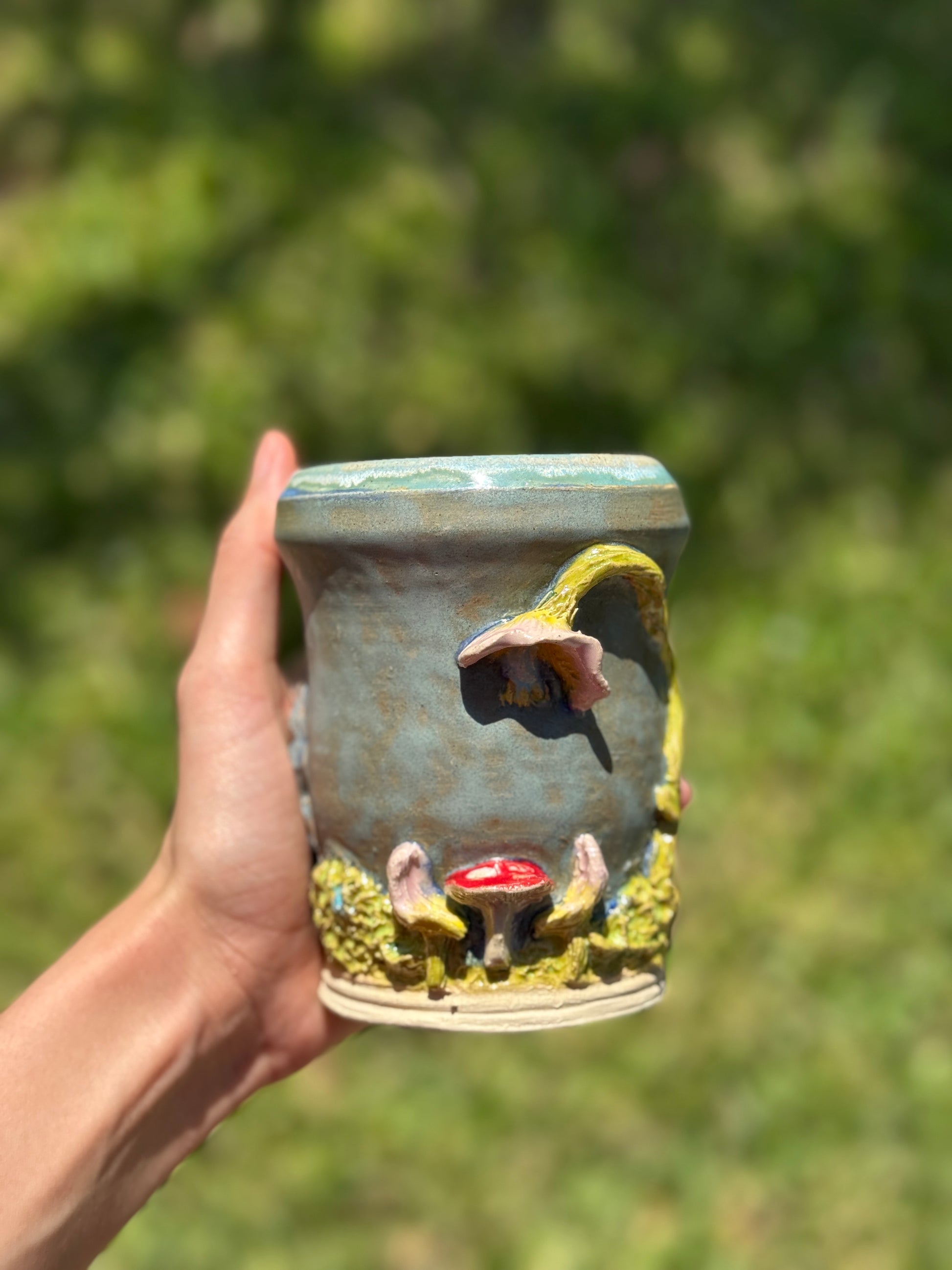 A whimsical to go mug piece depicting a serene river beside a magical dinner scene complete with a mushroom table and seats made of flowers. Capturing the charm of a fairytale feast in nature.