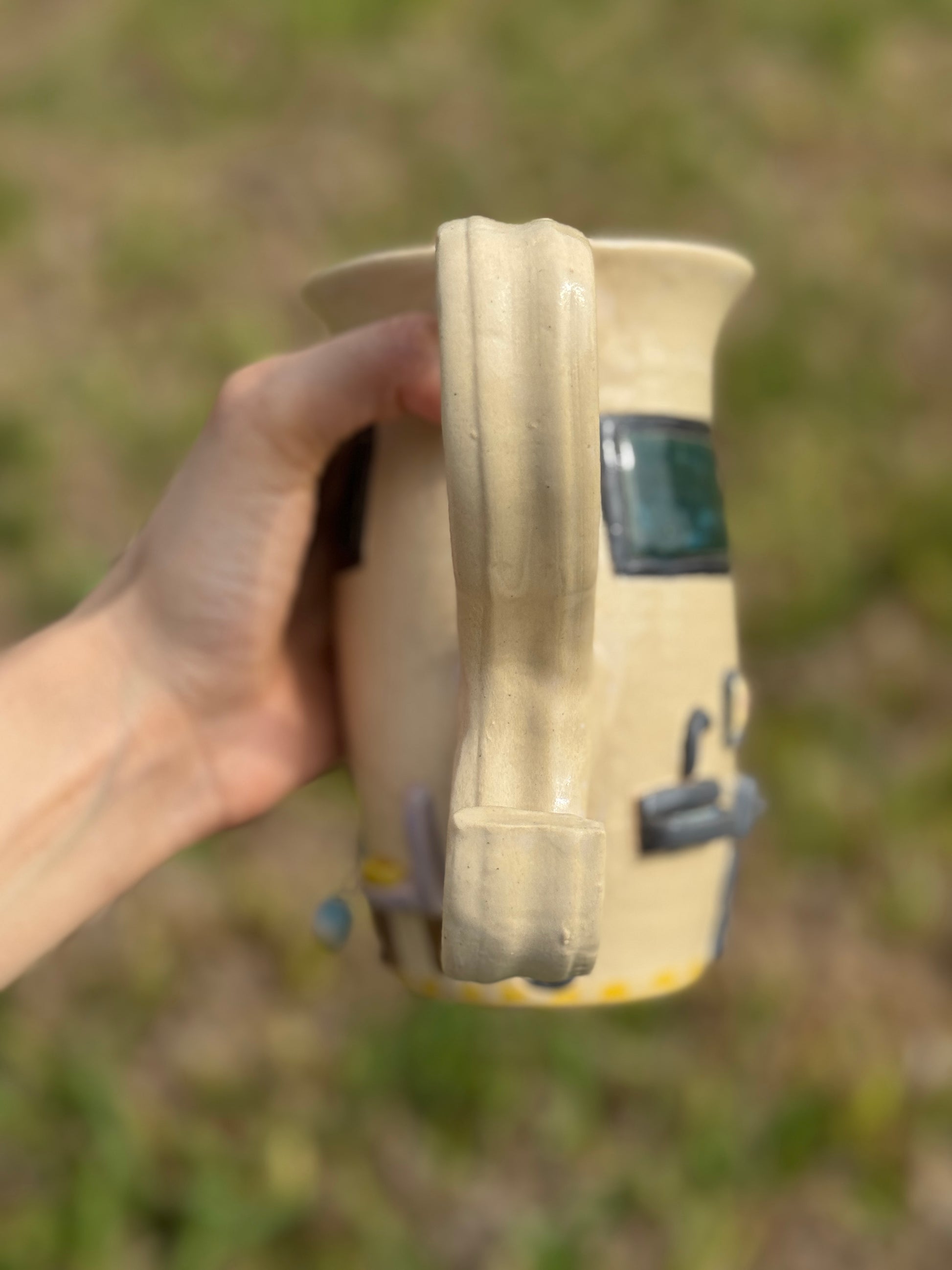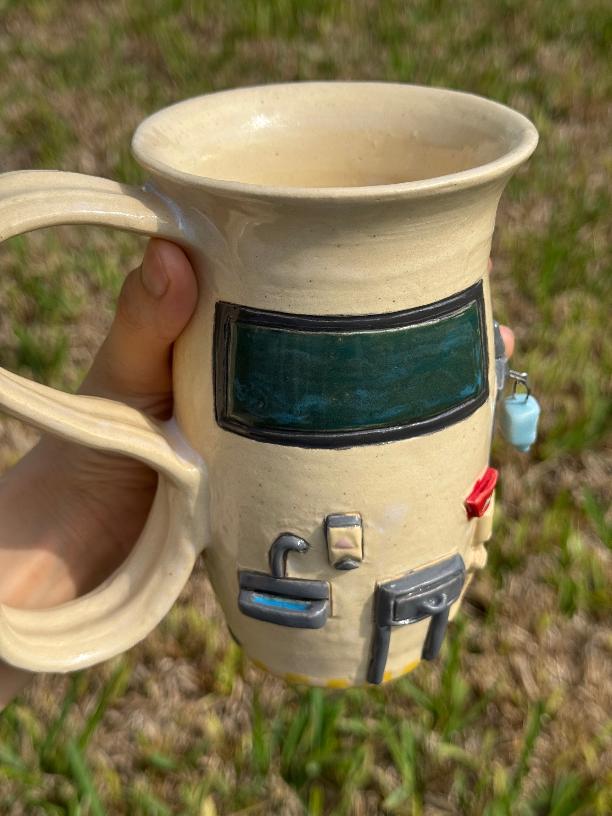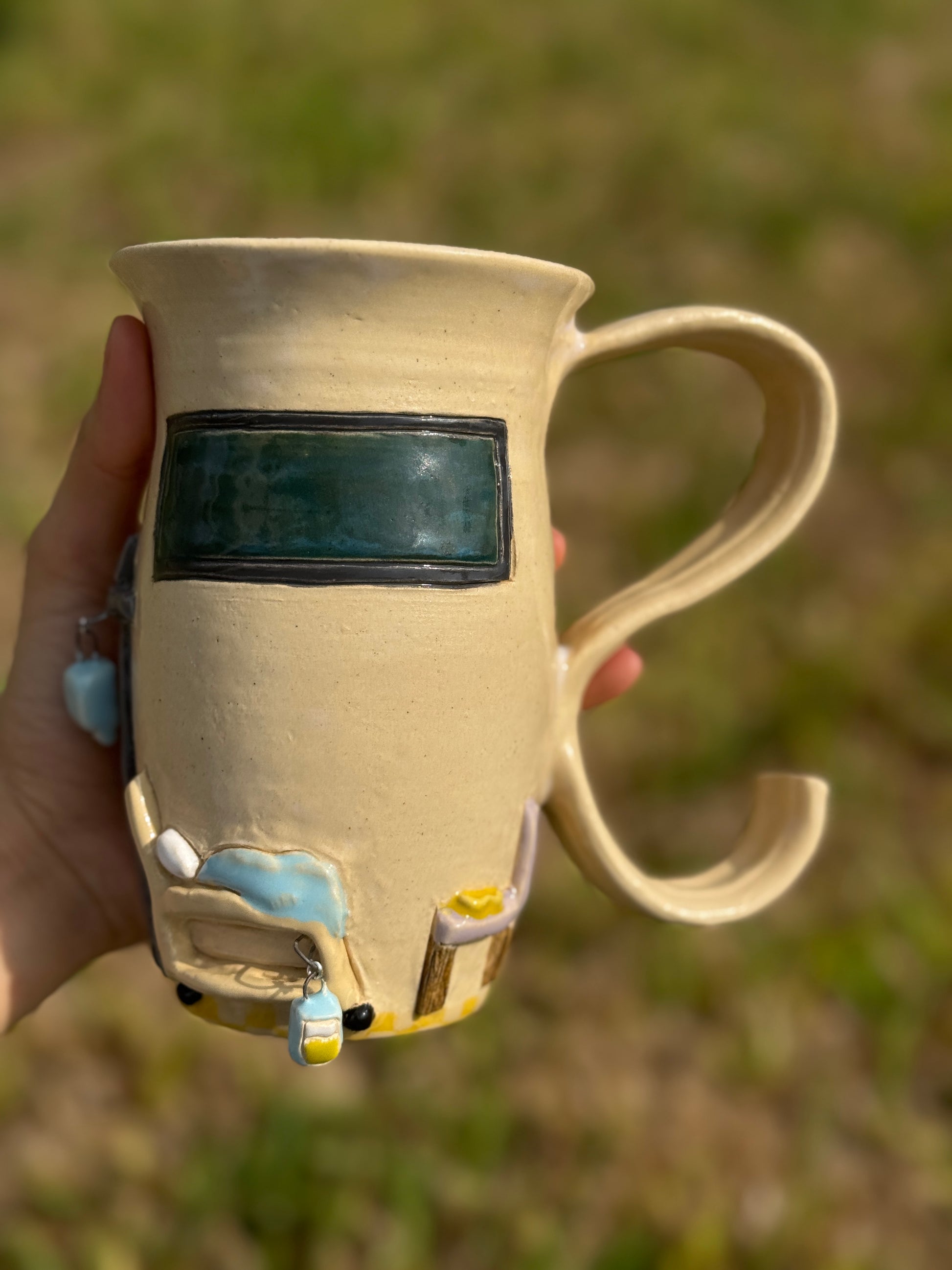 A unique, hand-sculpted mug depicting a hospital room, complete with delicate handcrafted details like an IV pole, bed, and side chair. Thoughtfully designed to honor resilience and healing, this mug transforms a powerful personal experience into a meaningful, artistic keepsake.