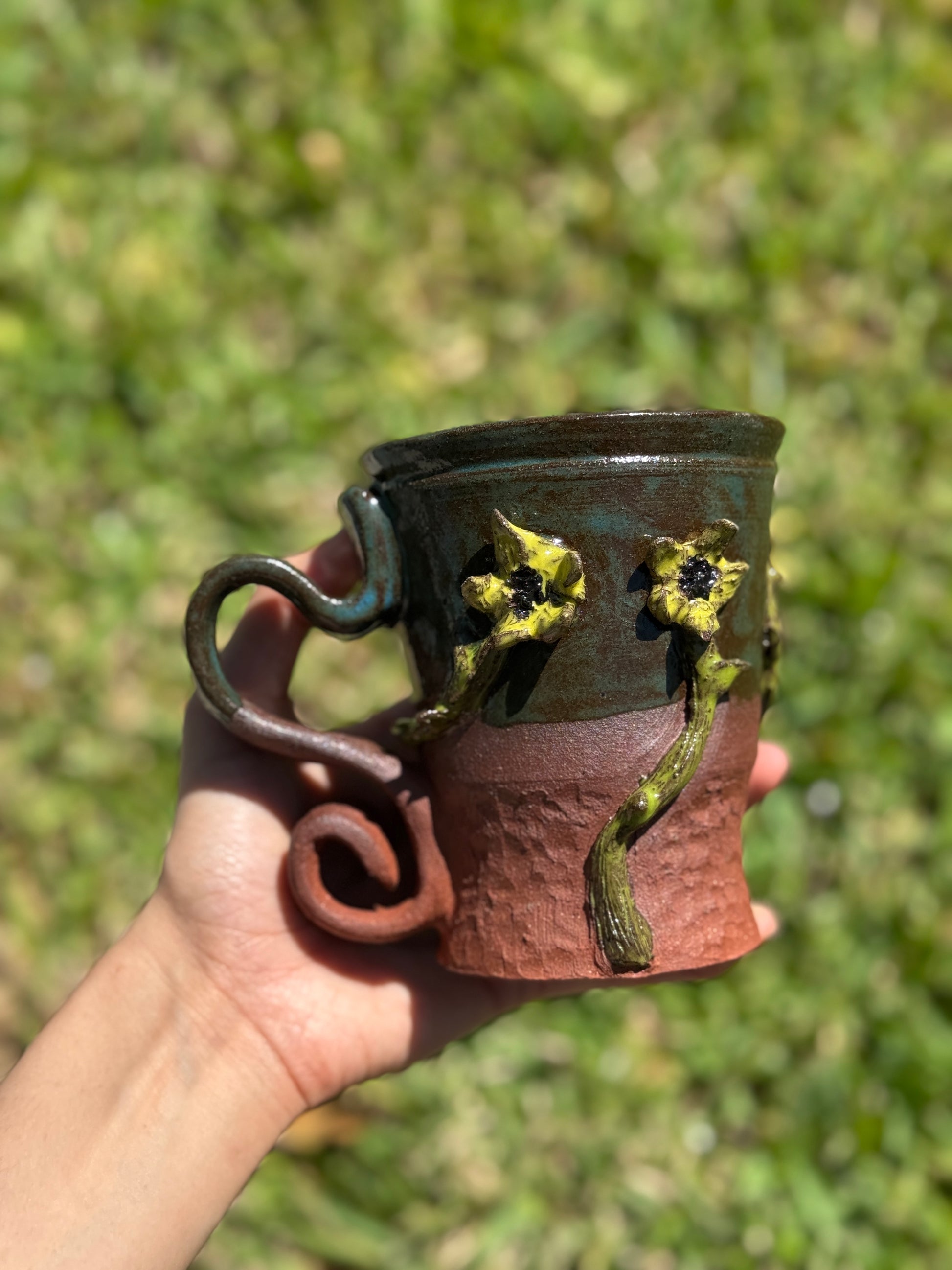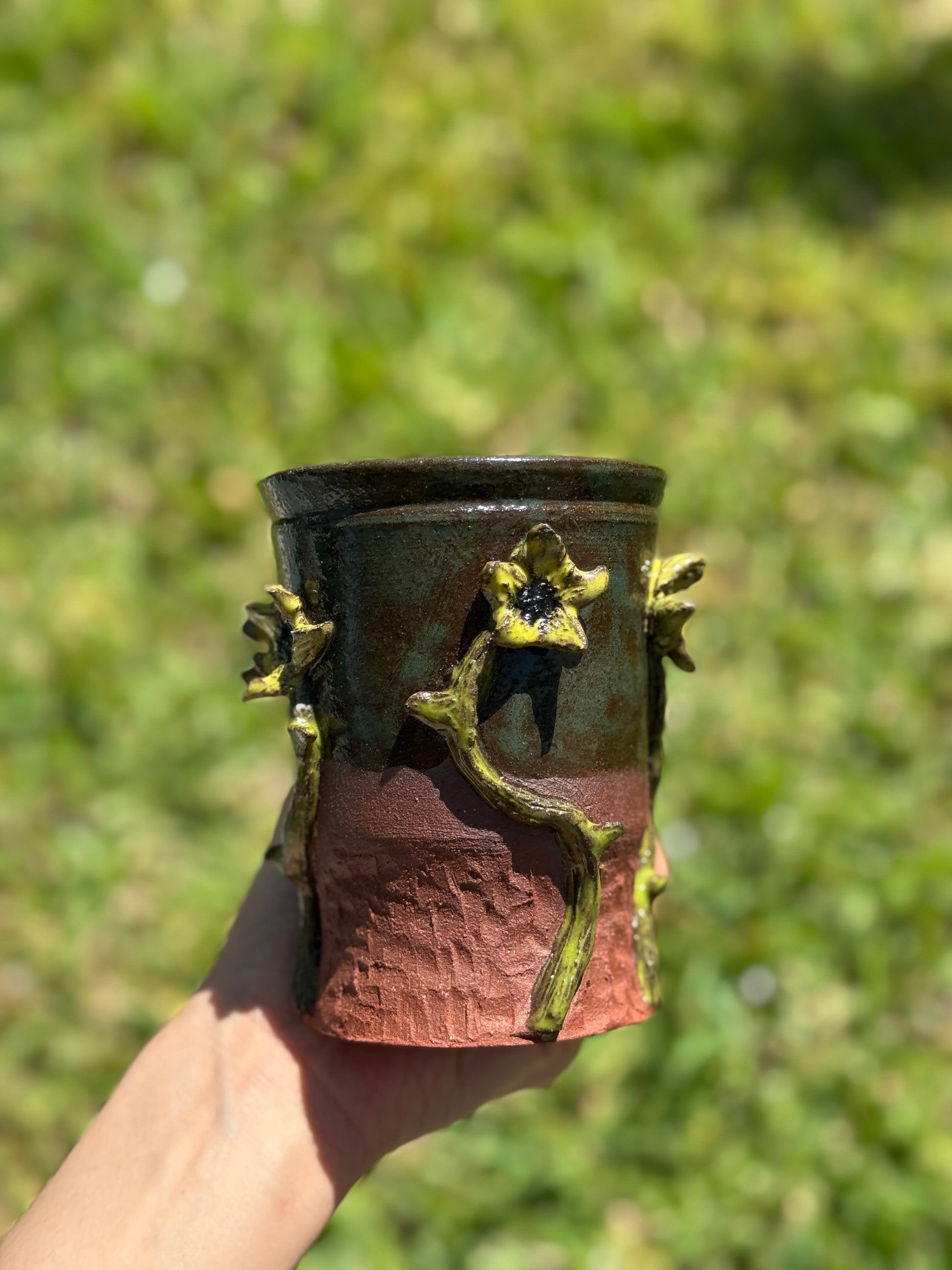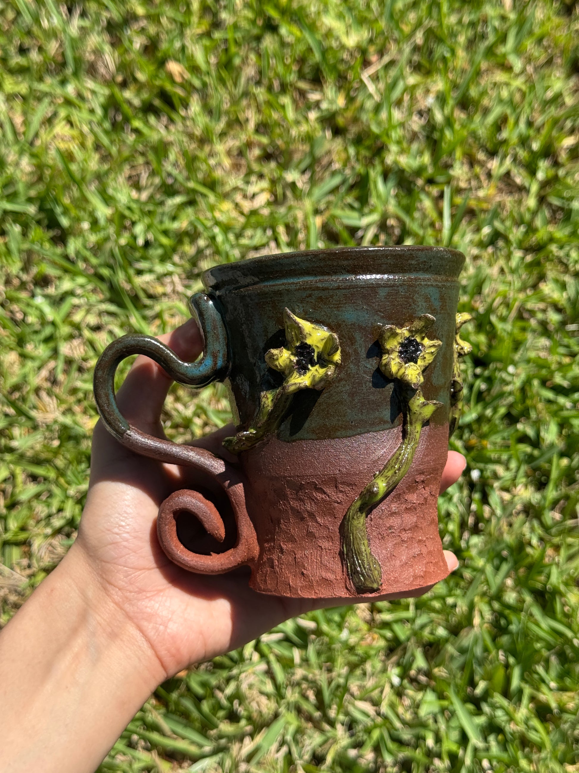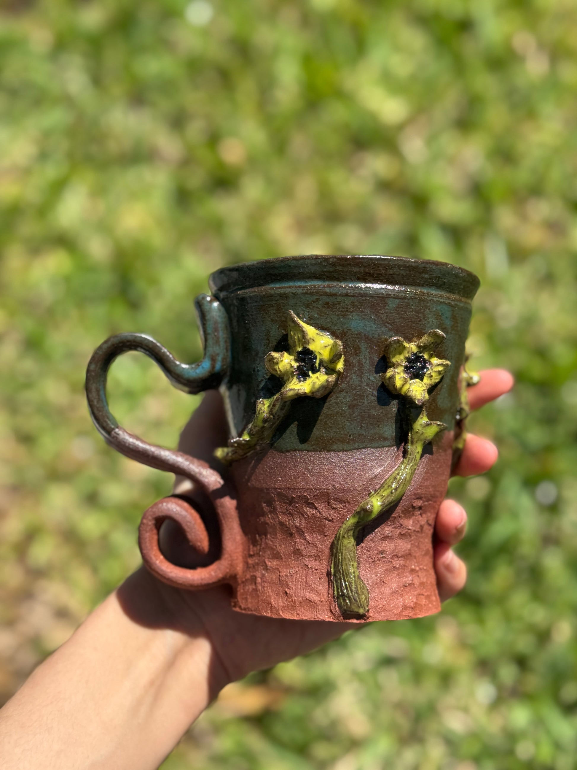 A handcrafted red clay mug adorned with sunflowers. Rustic, warm, and full of natural charm