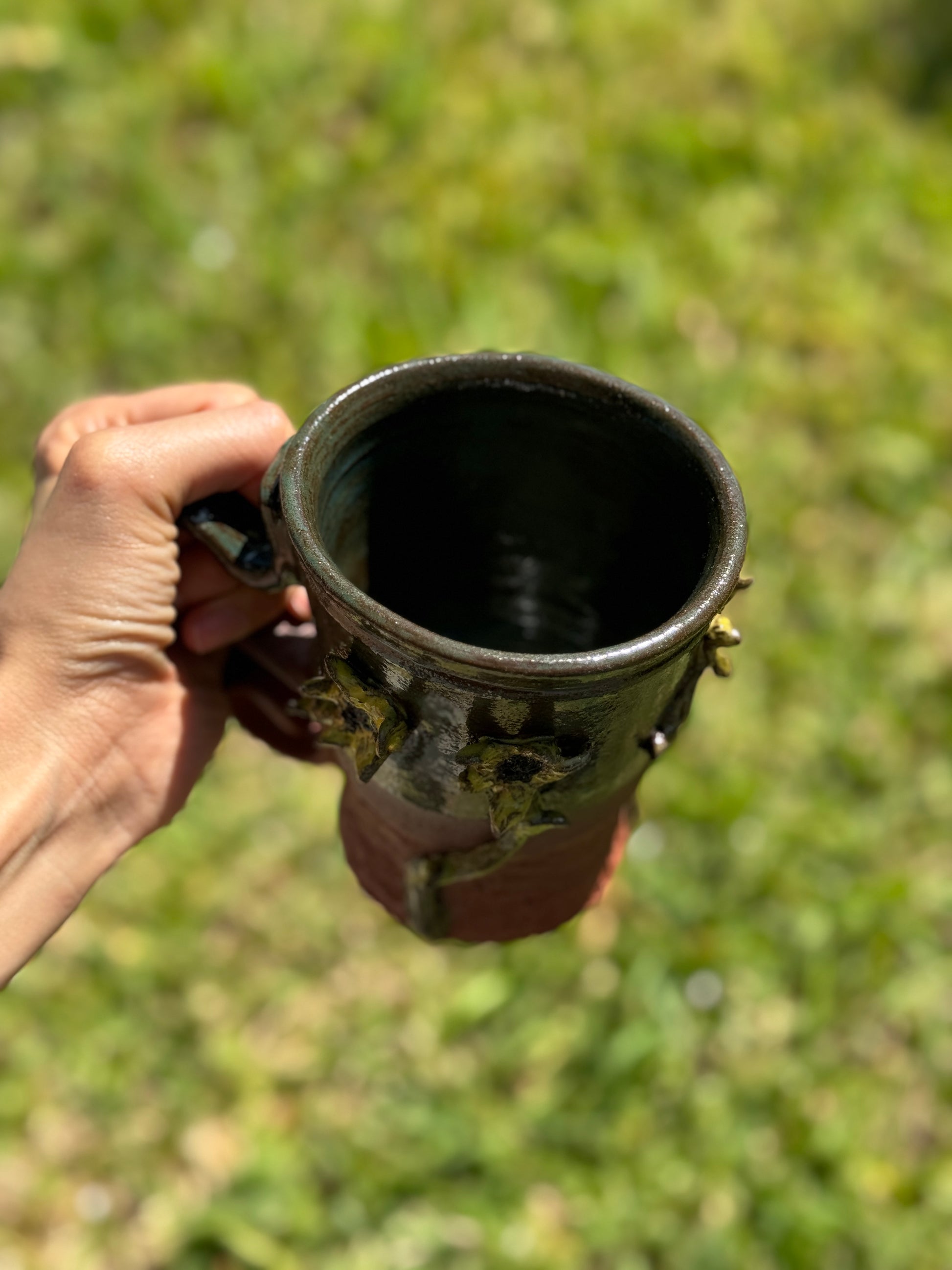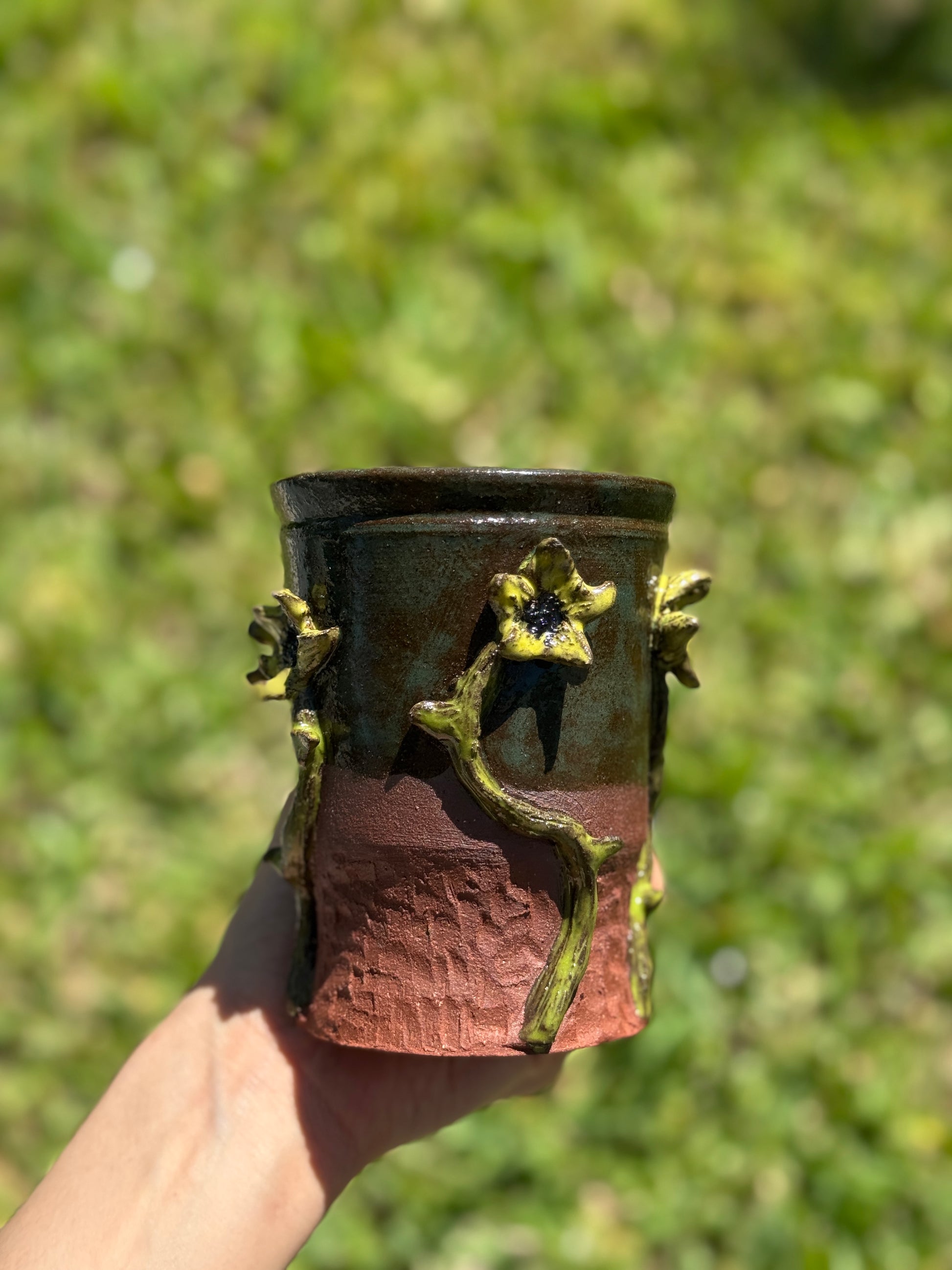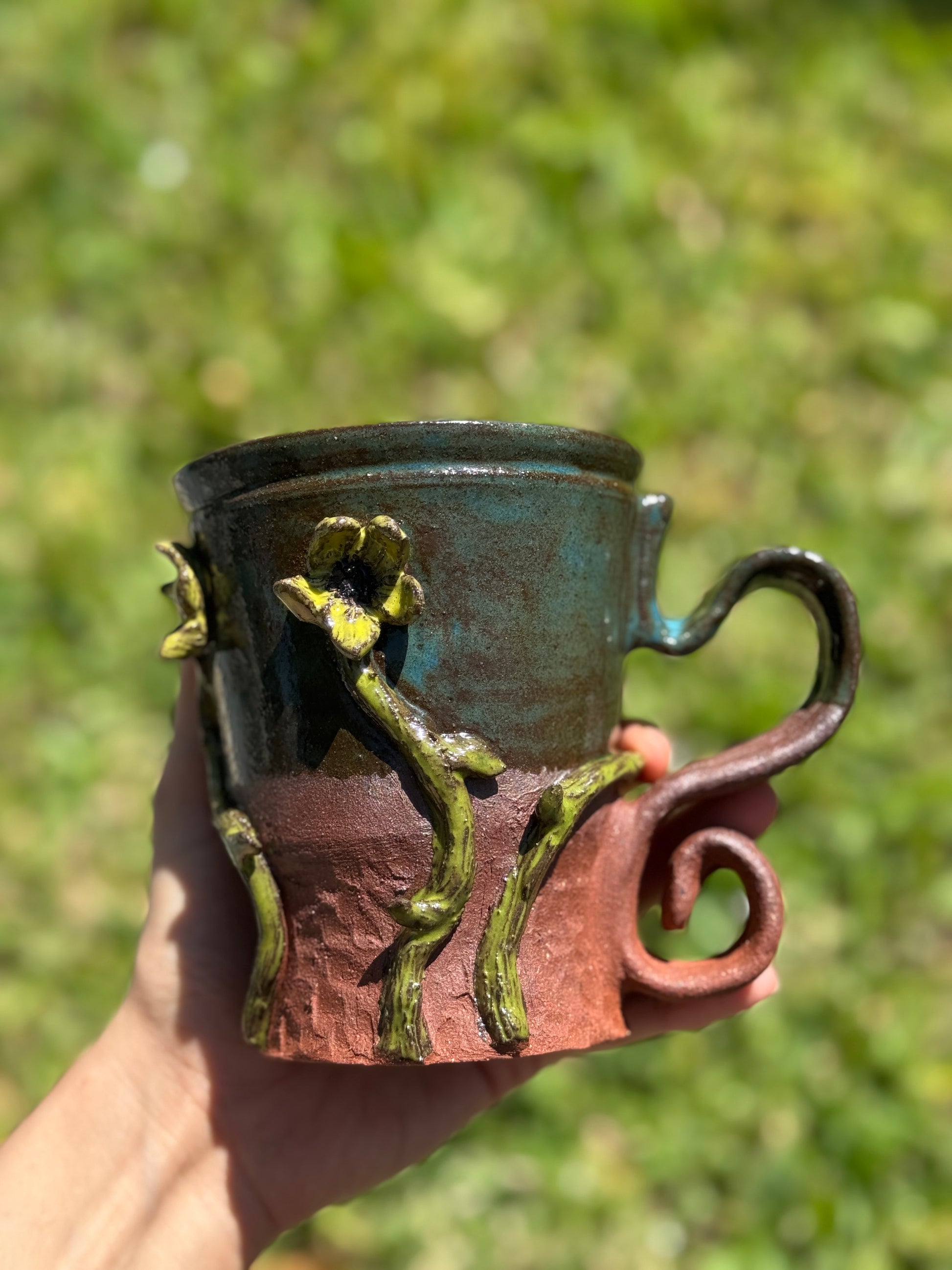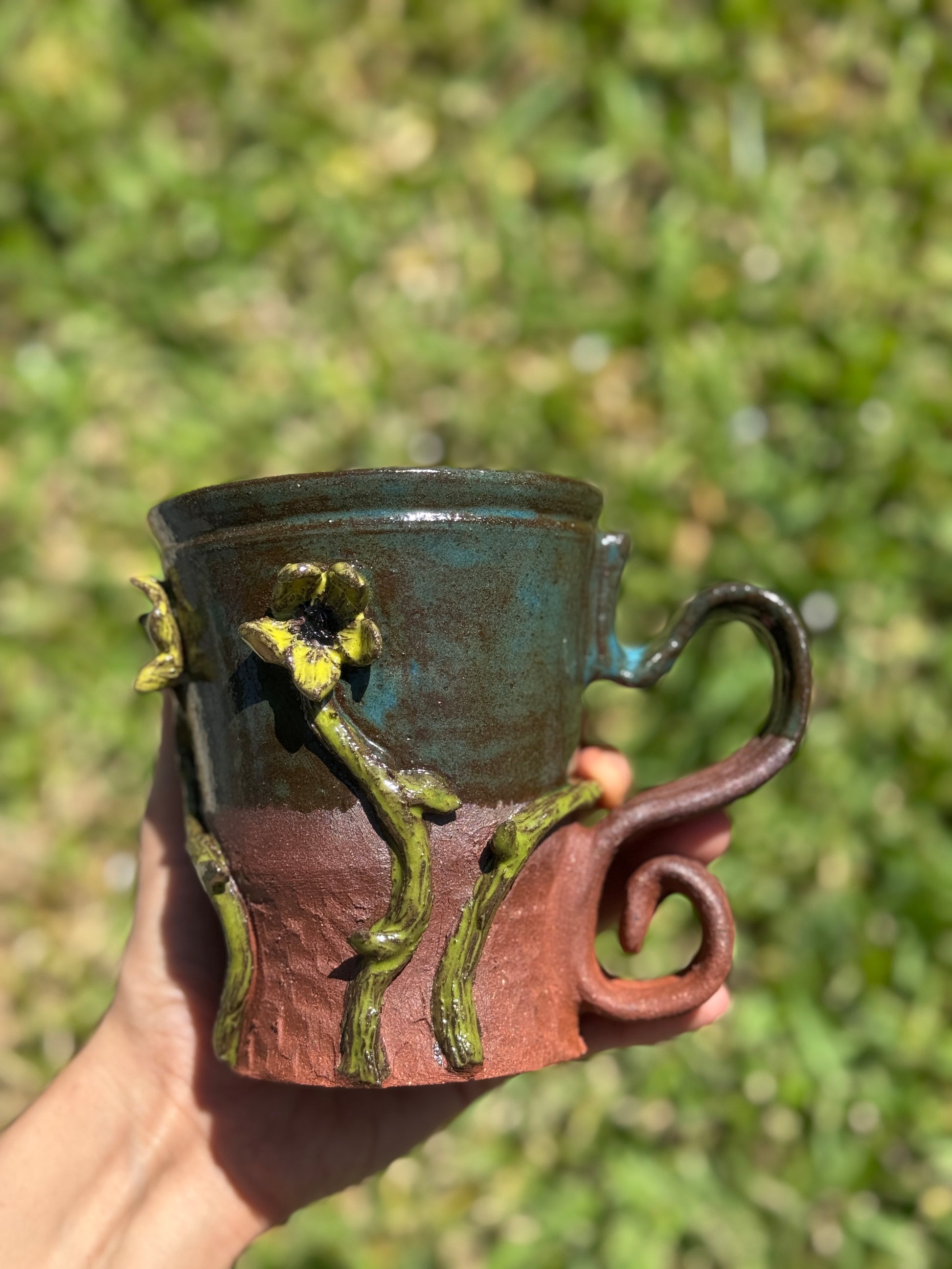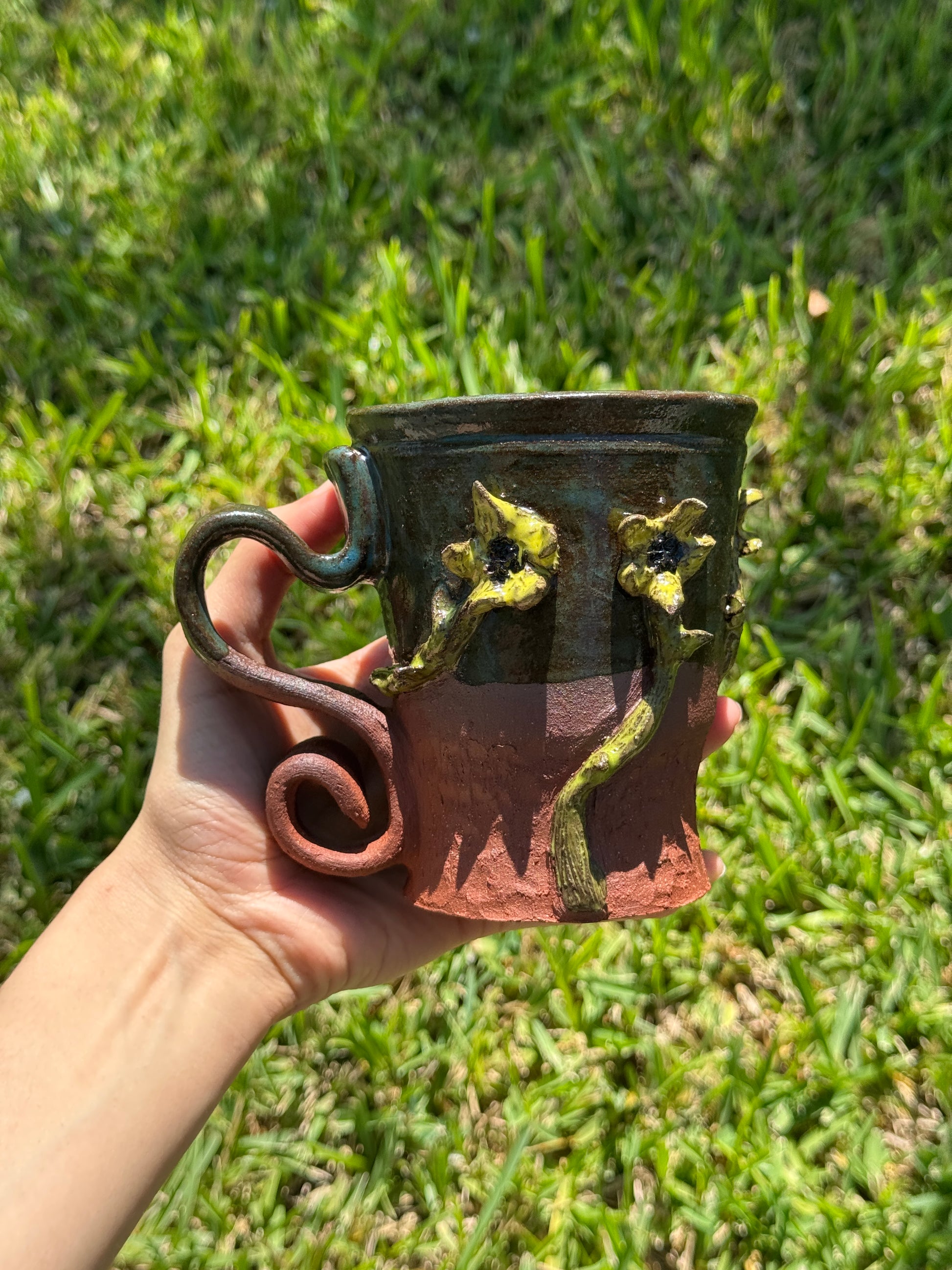 A handcrafted red clay mug adorned with sunflowers. Rustic, warm, and full of natural charm