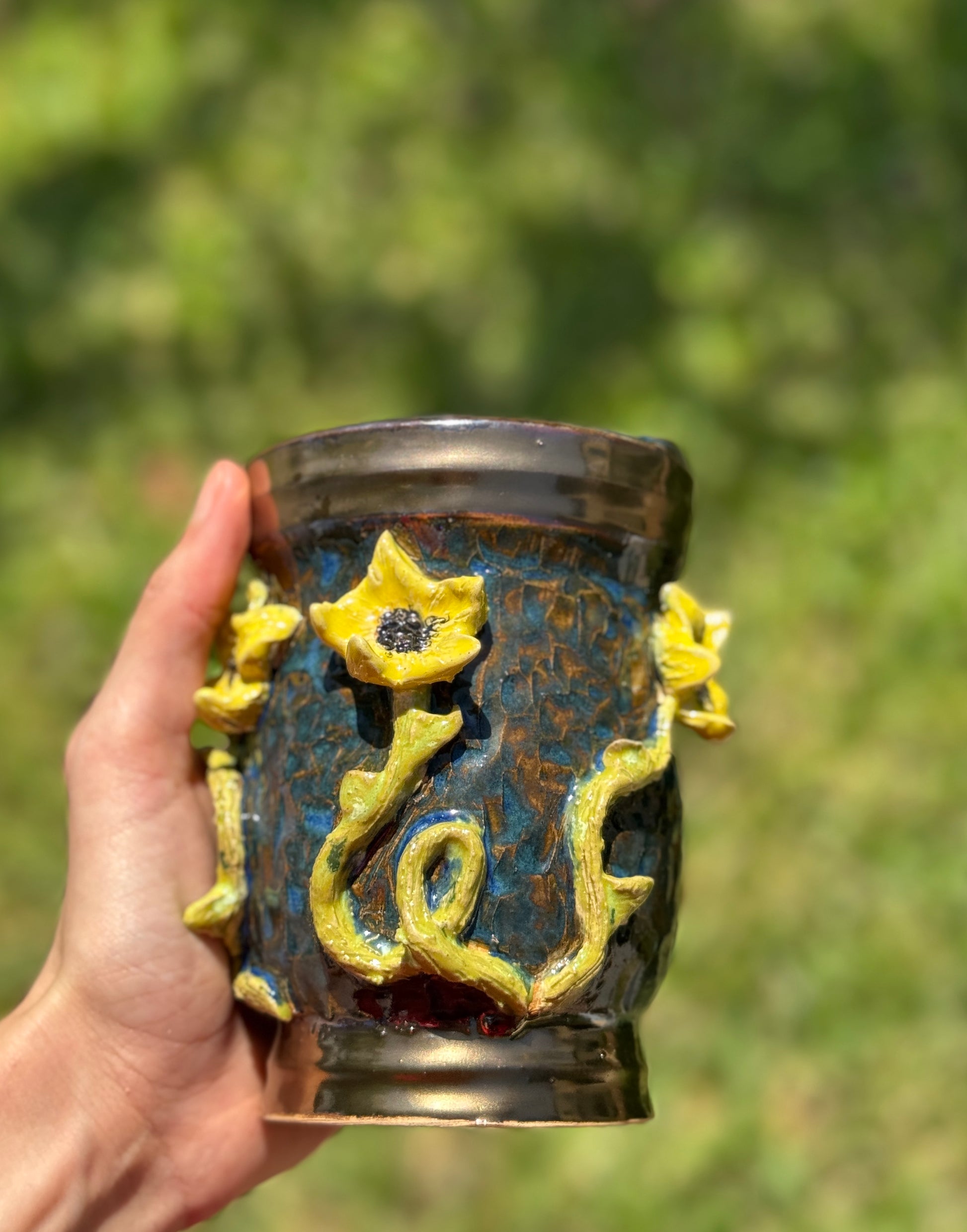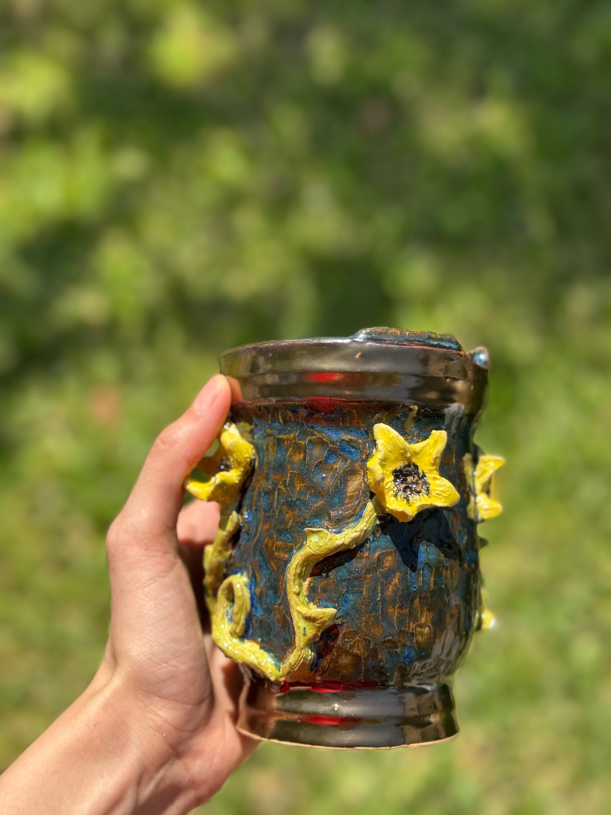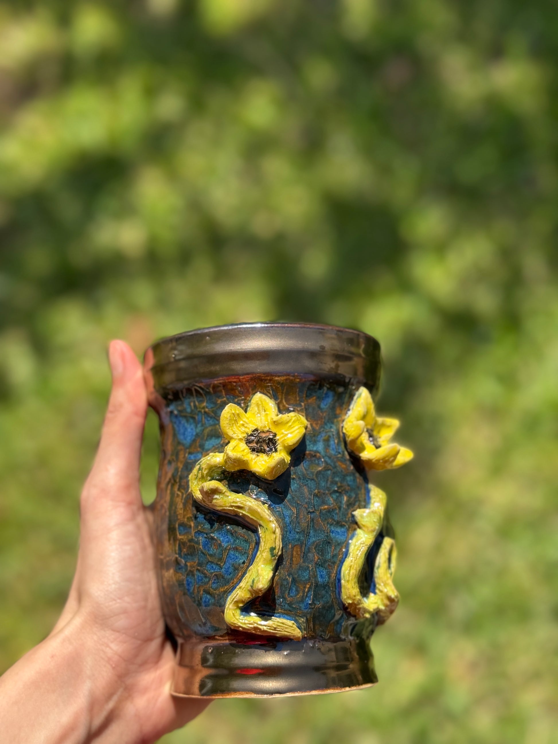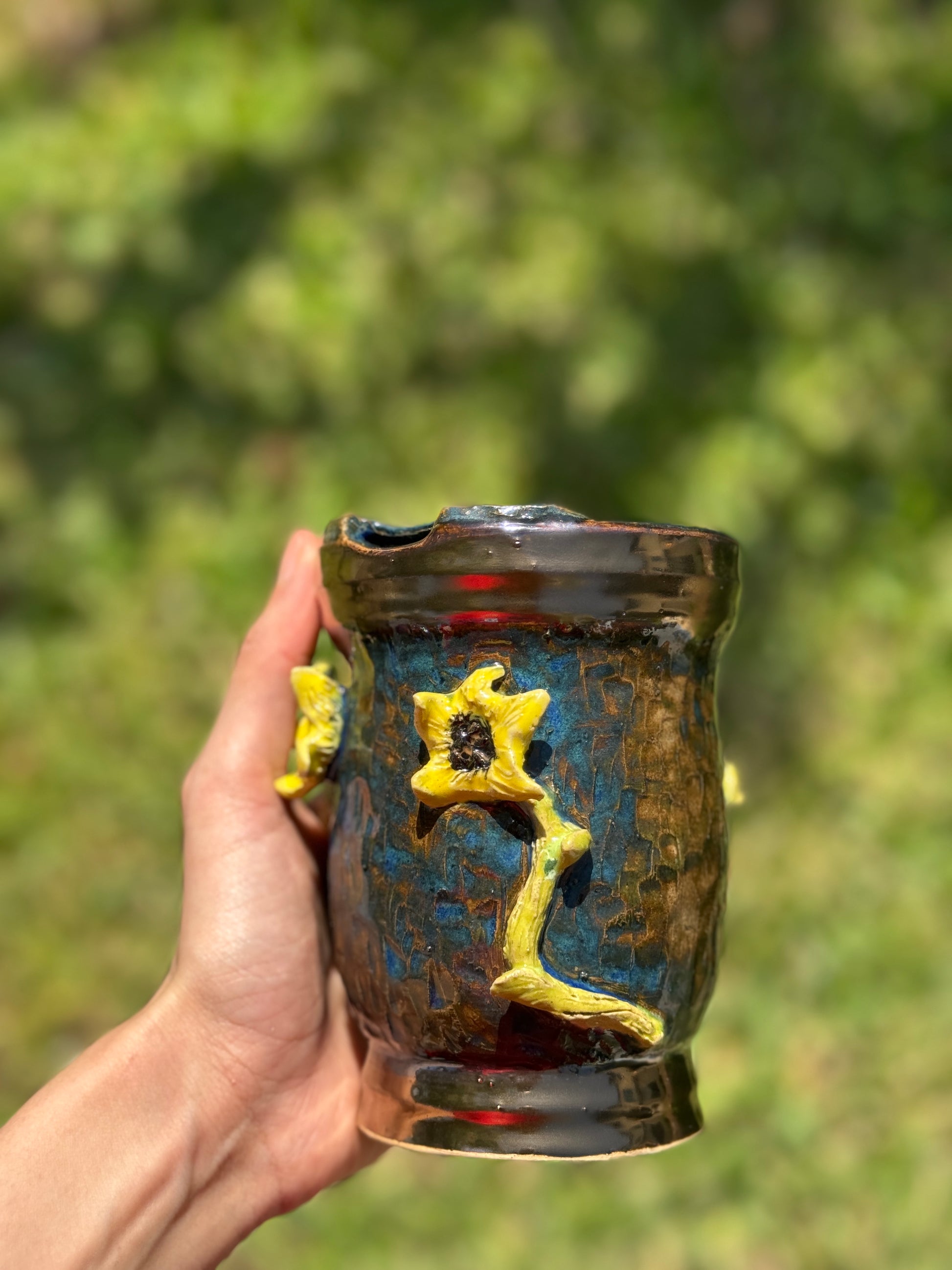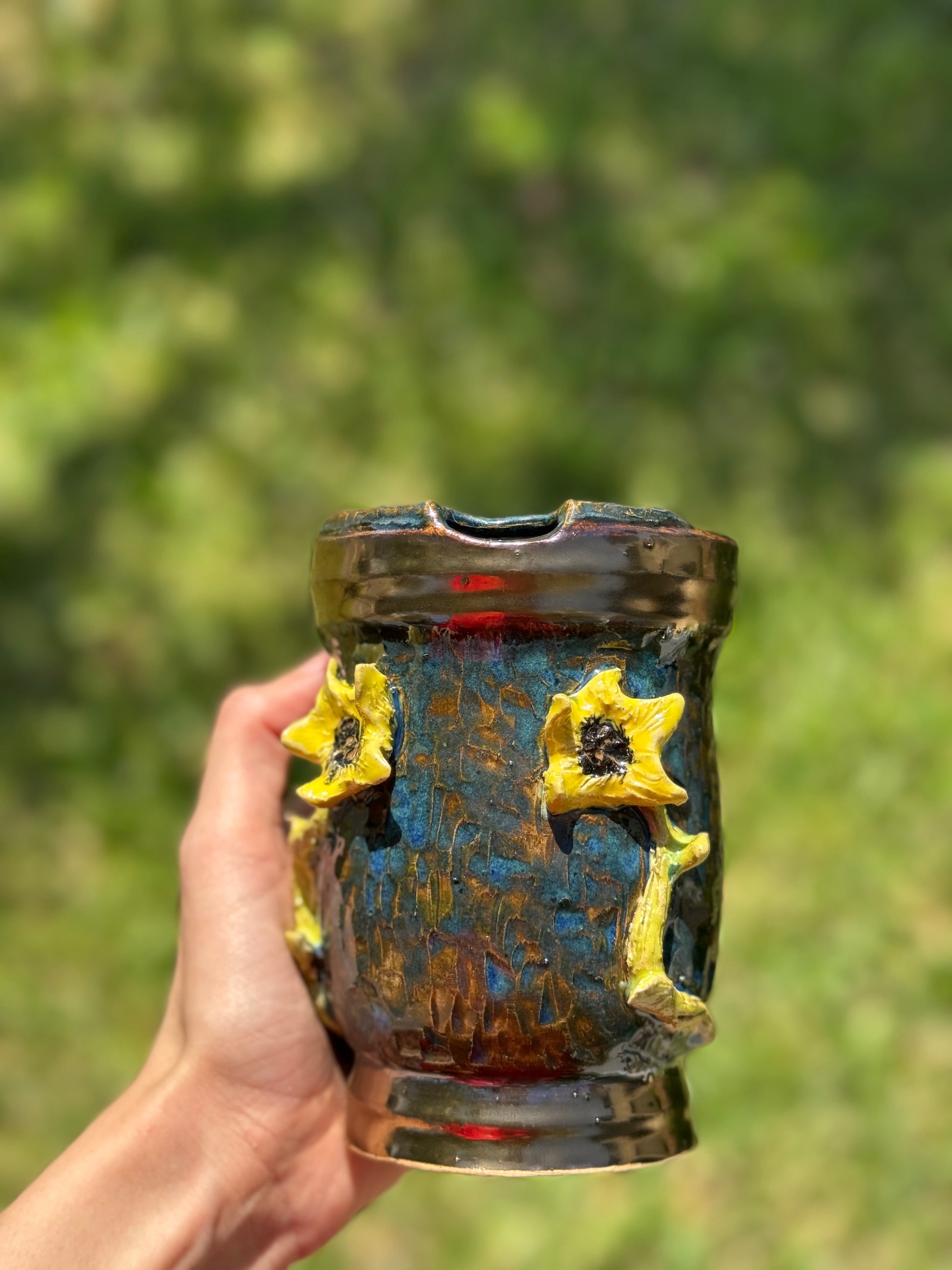 A to go mug showcasing sunflowers glowing softly against a night sky, accented with elegant gold details.