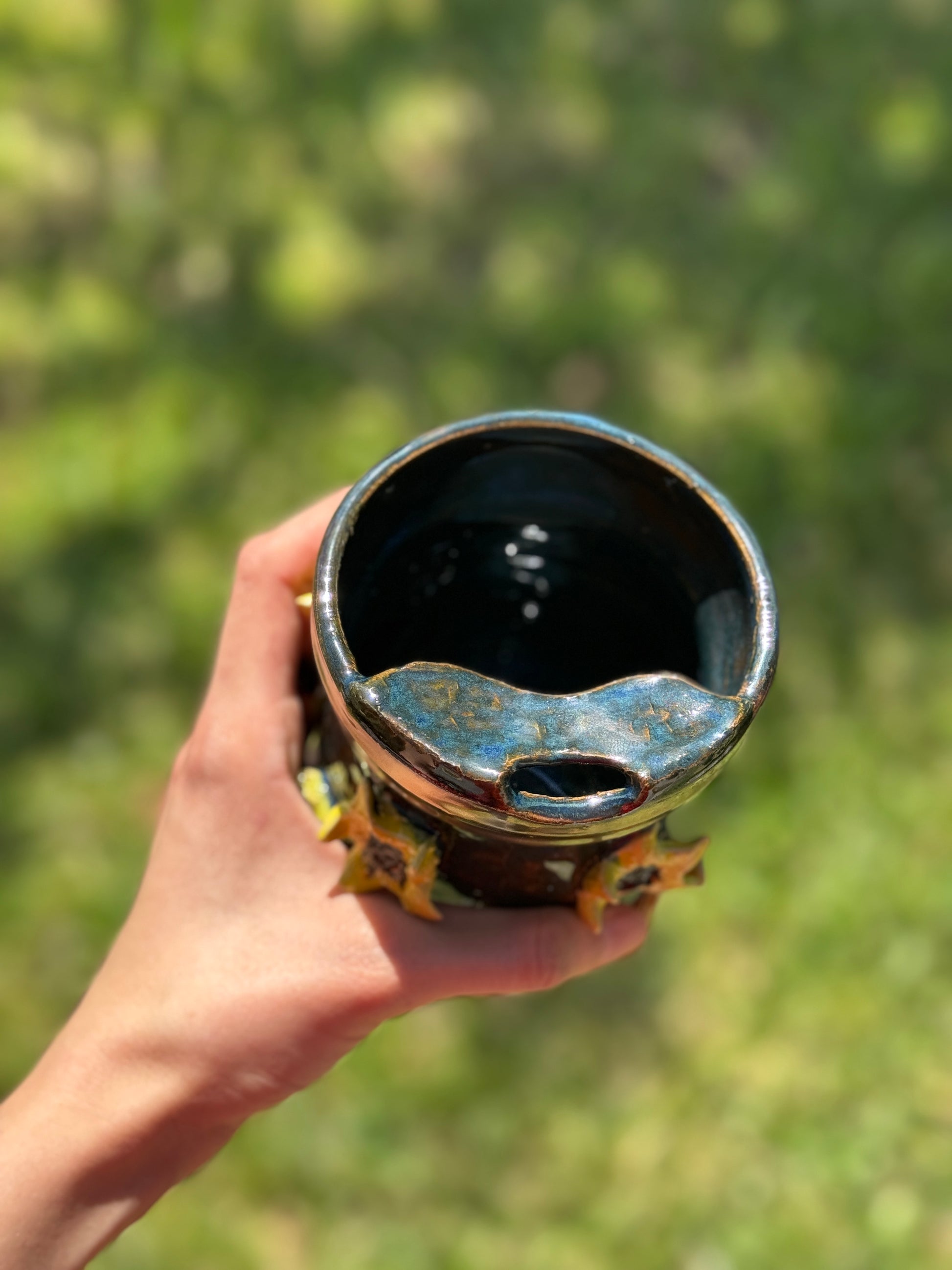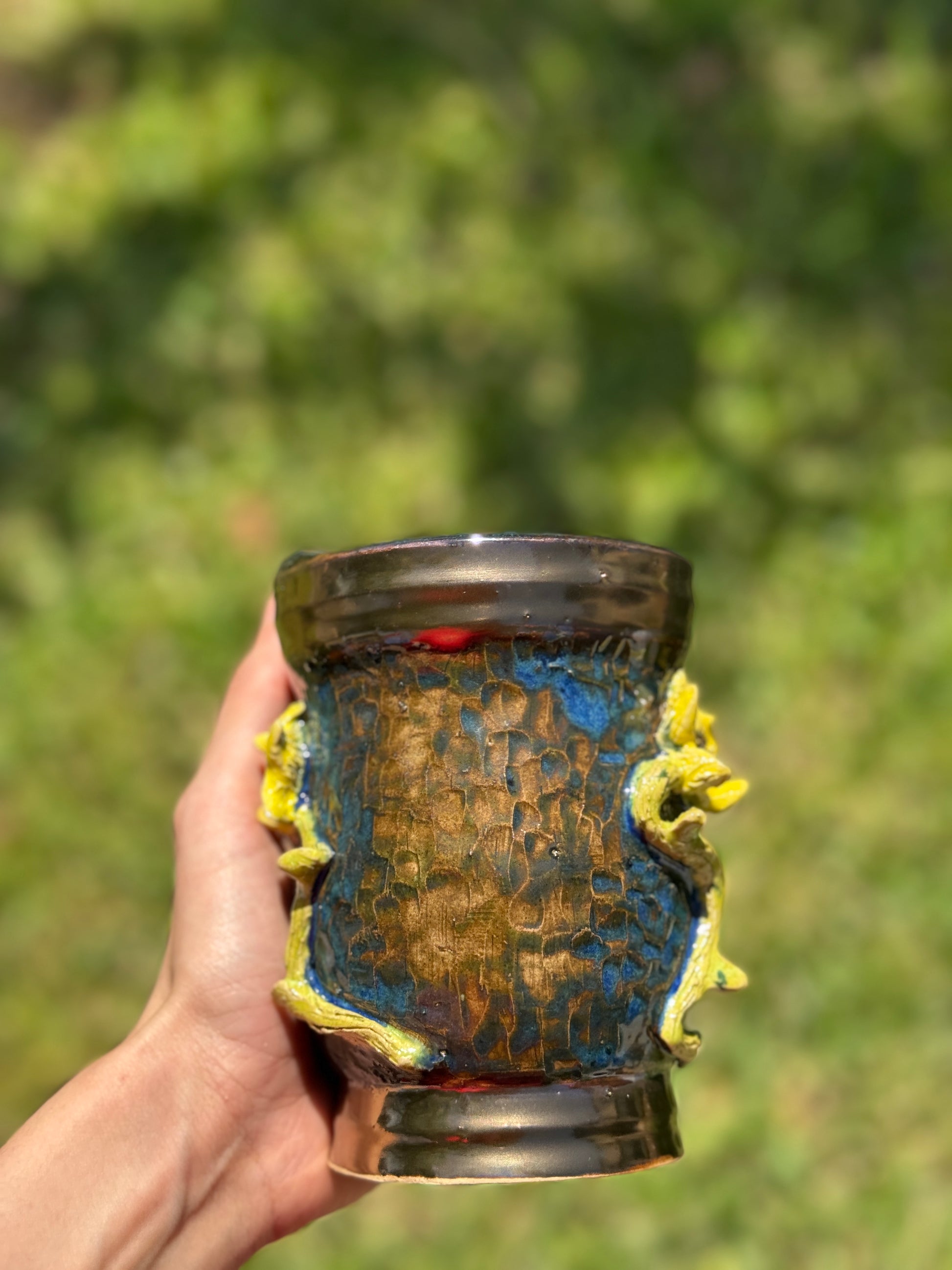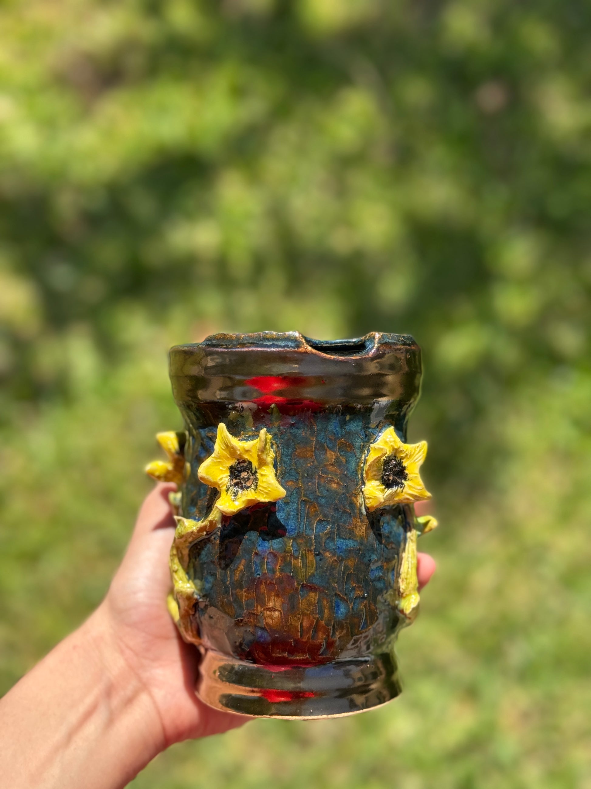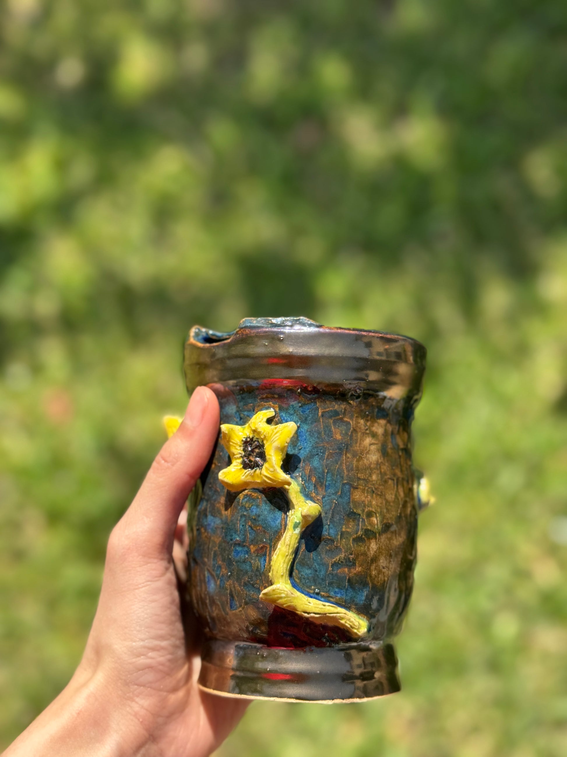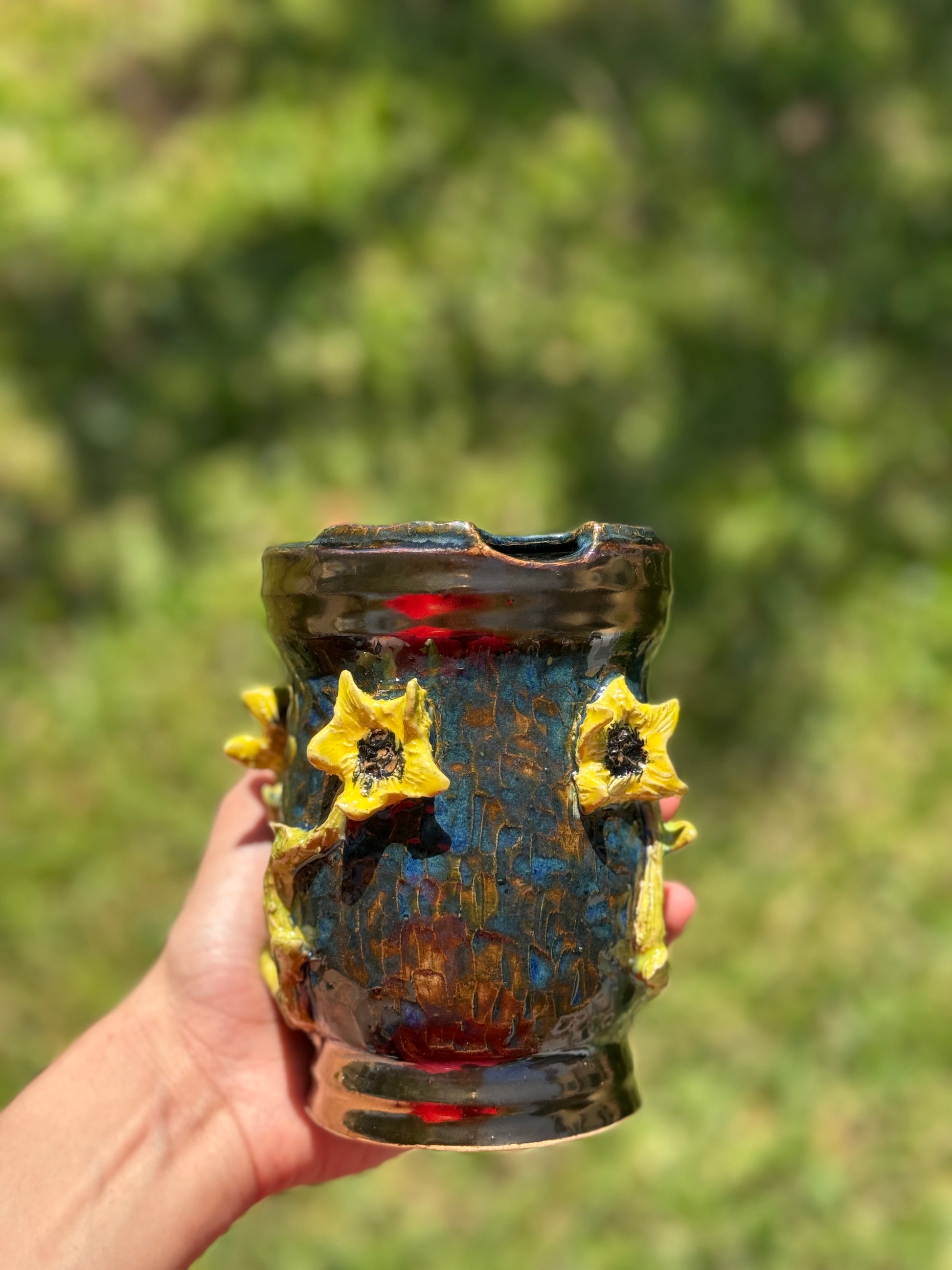 A to go mug showcasing sunflowers glowing softly against a night sky, accented with elegant gold details.
