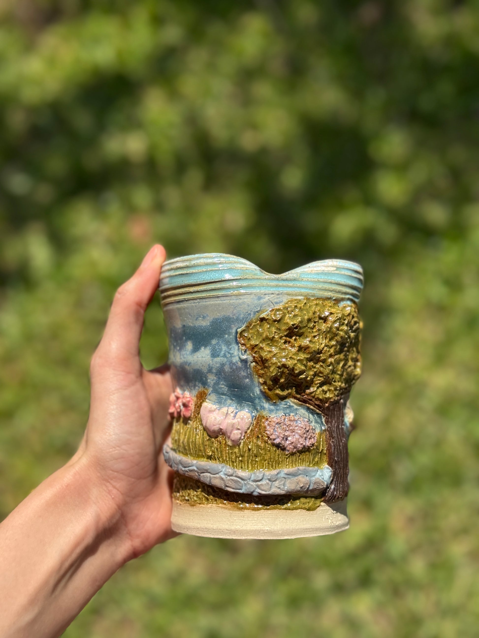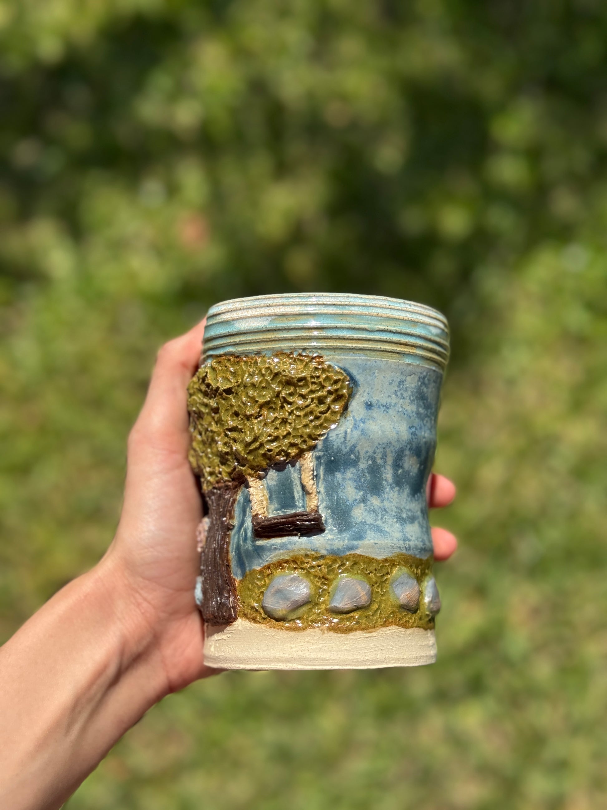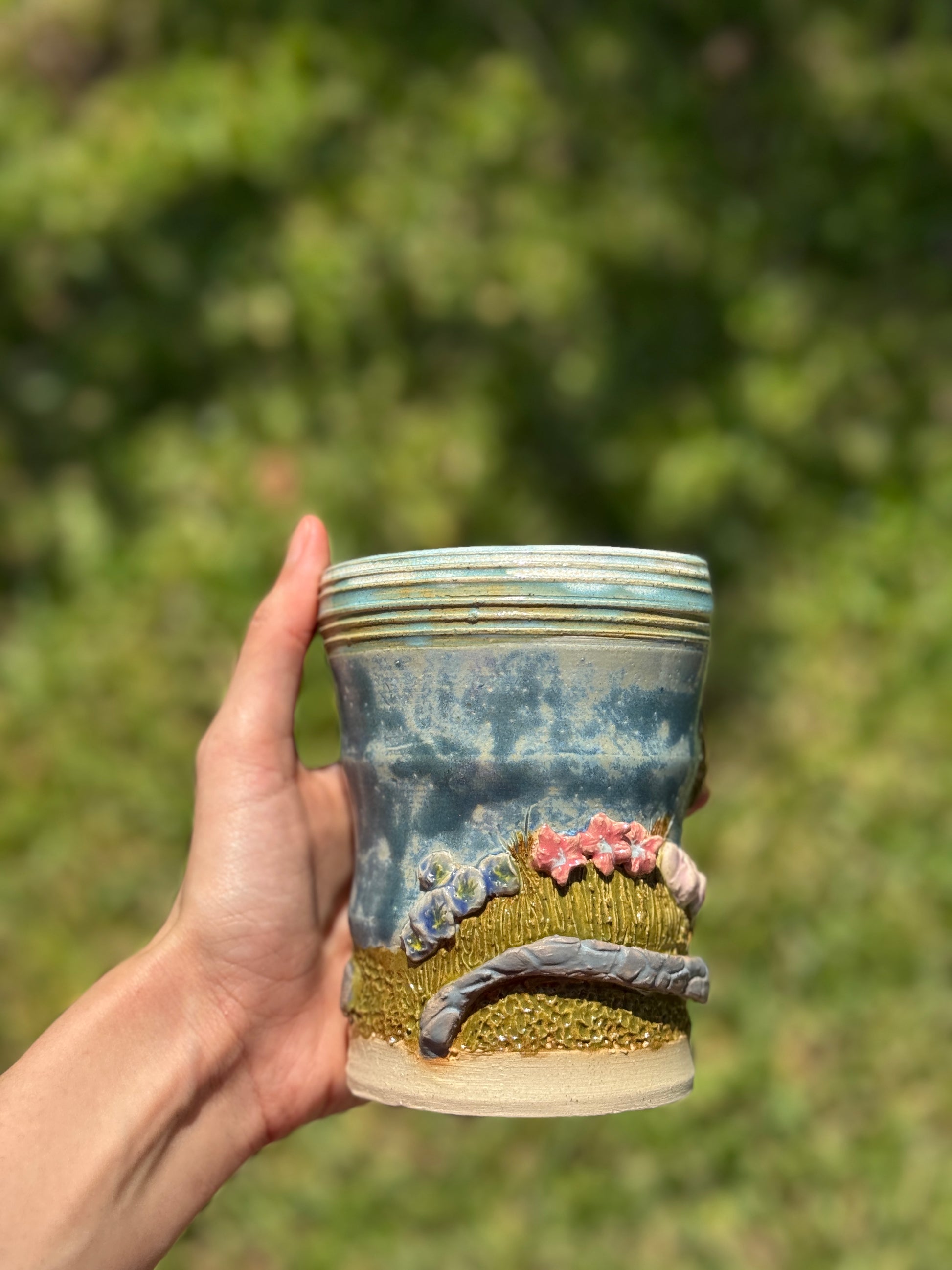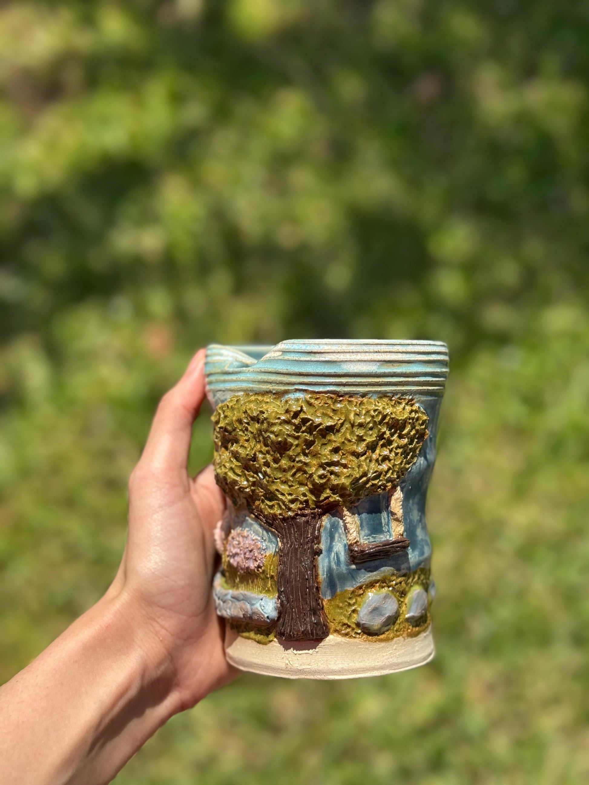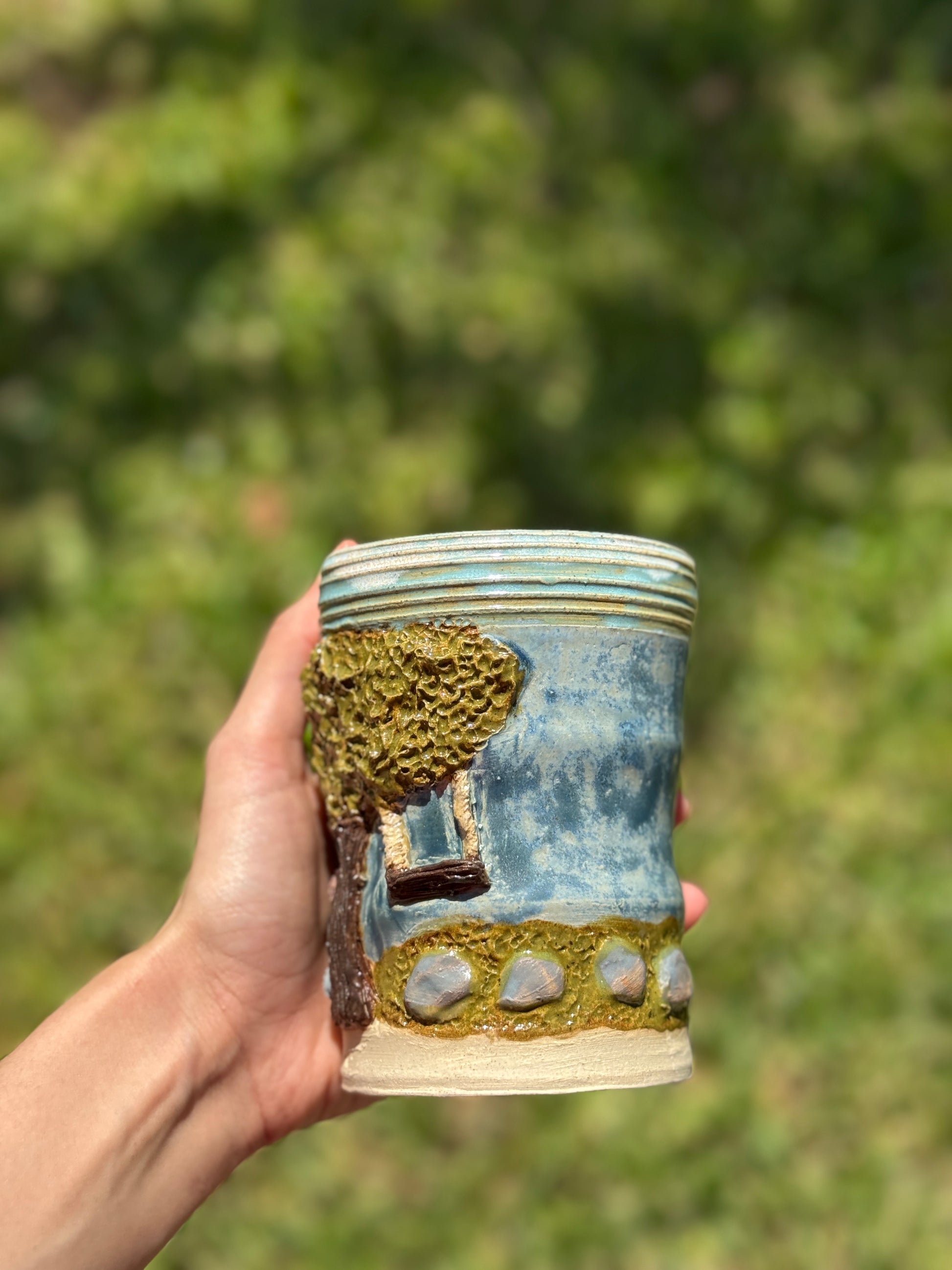 A to go mug featuring a peaceful scene of a swing hanging from a tree, with a winding path lined with blooming flowers.