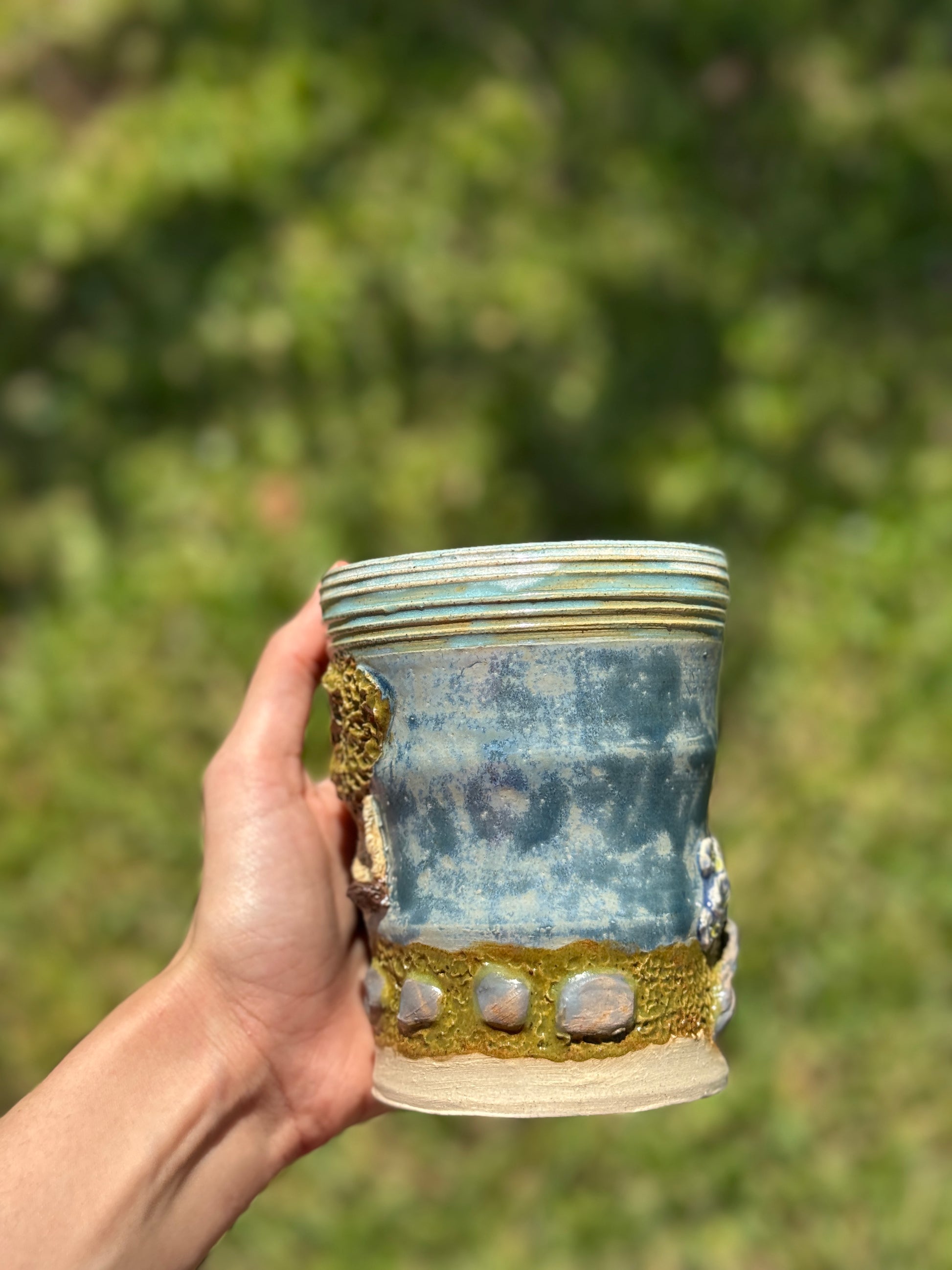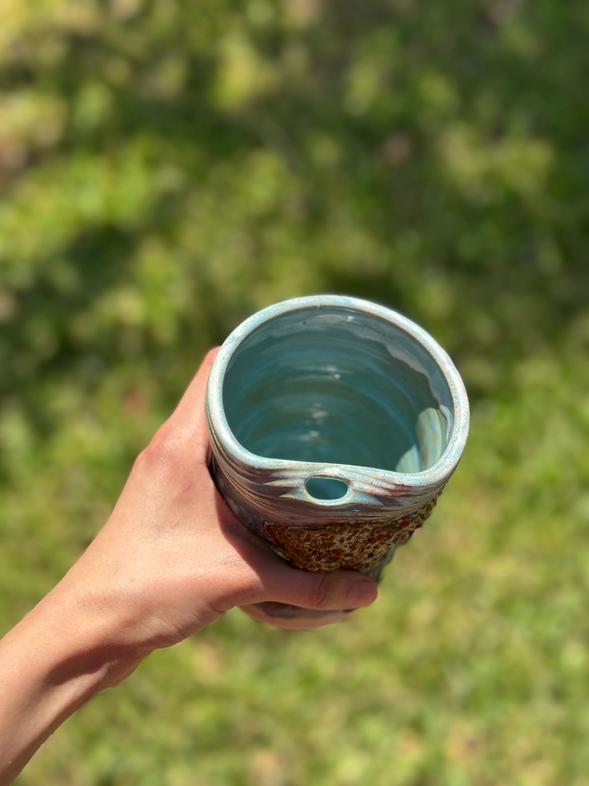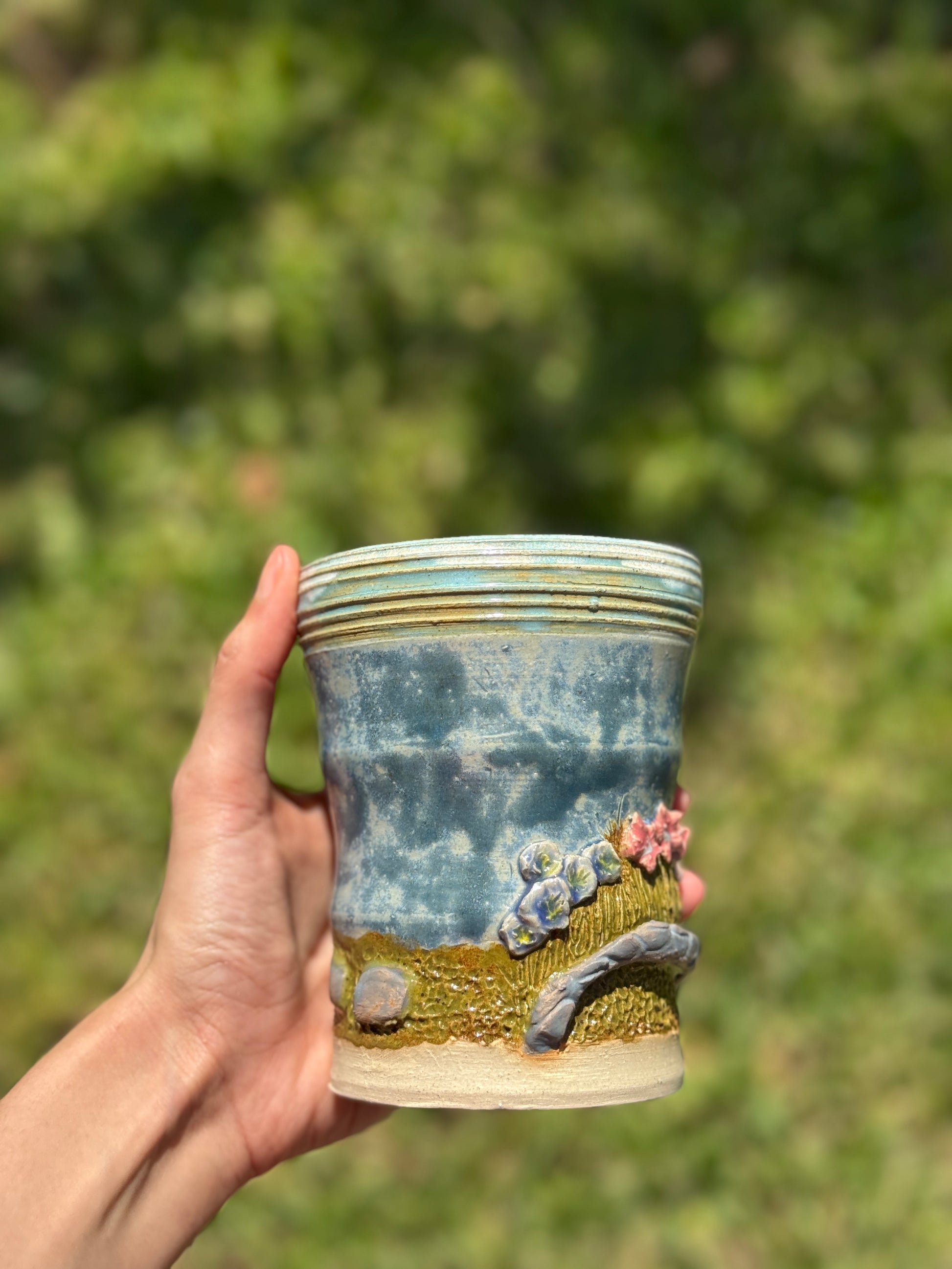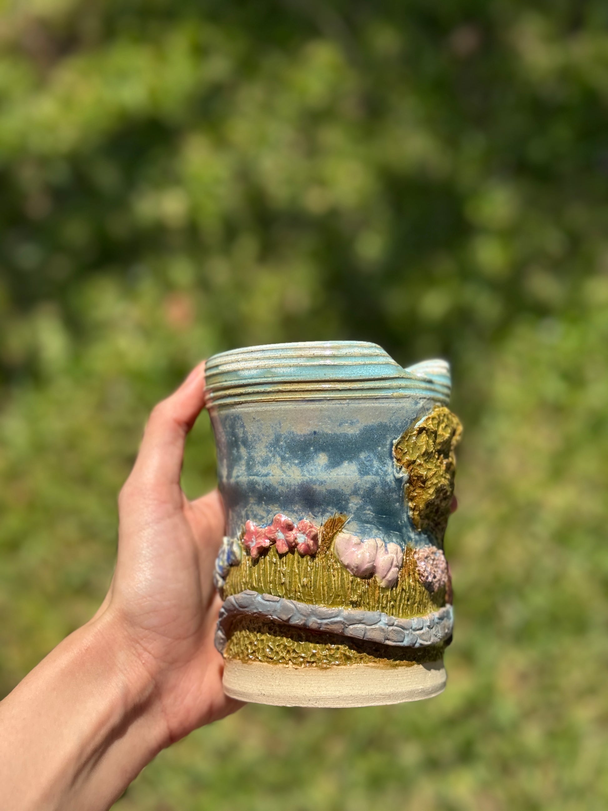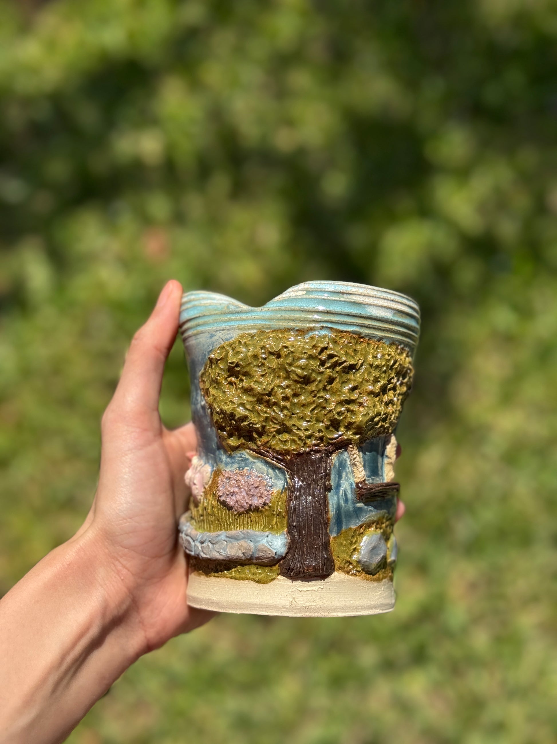 A to go mug featuring a peaceful scene of a swing hanging from a tree, with a winding path lined with blooming flowers.