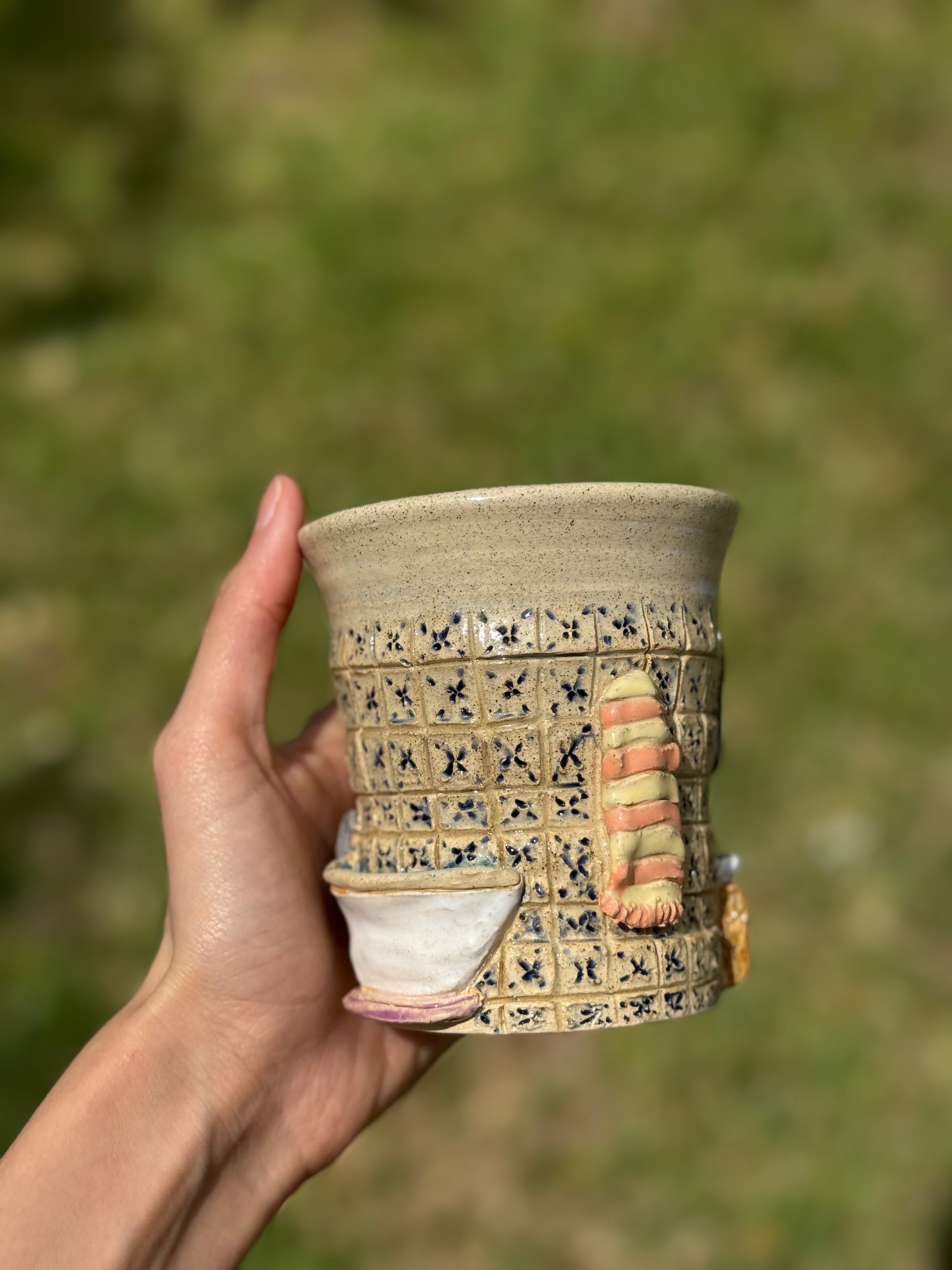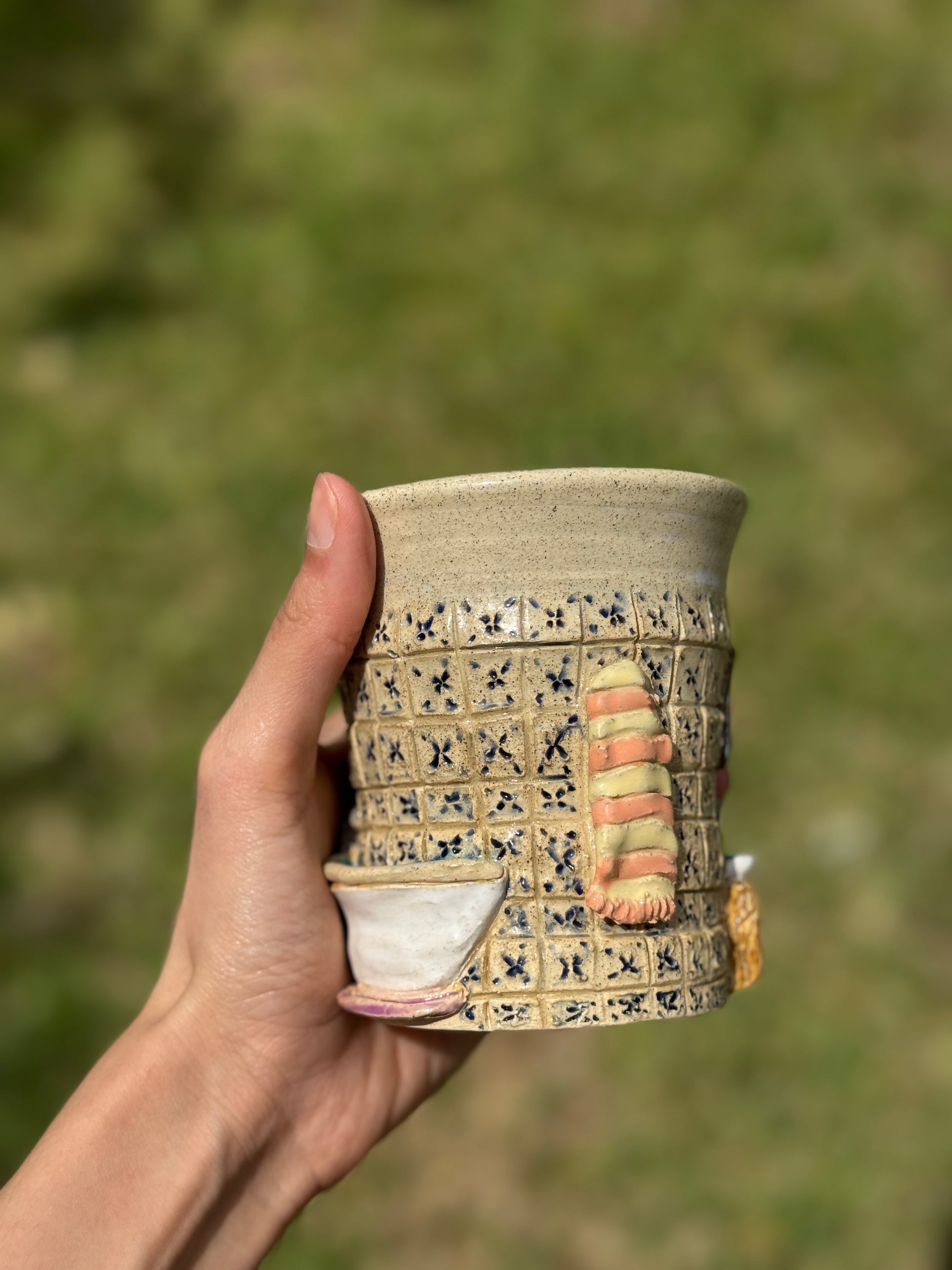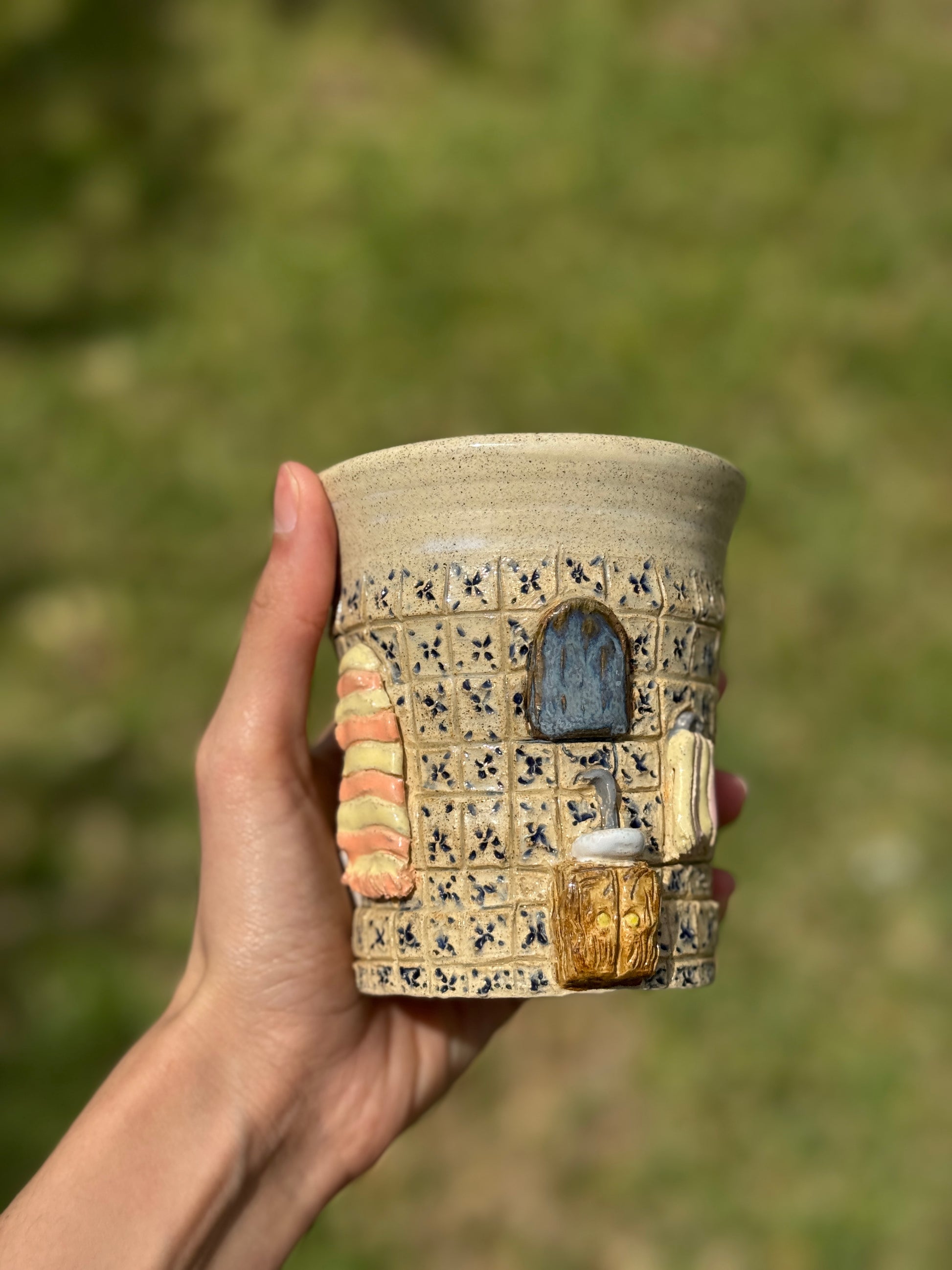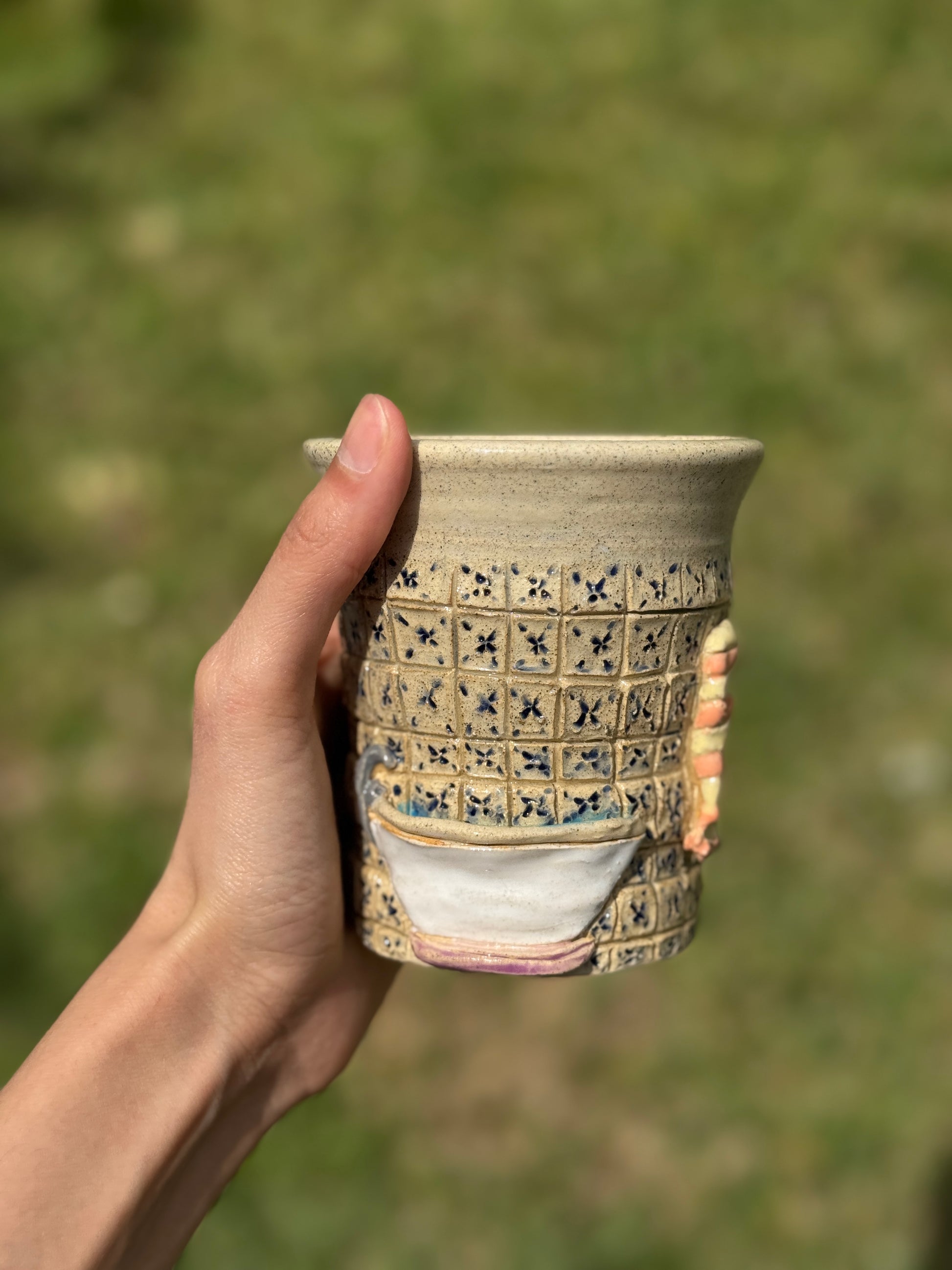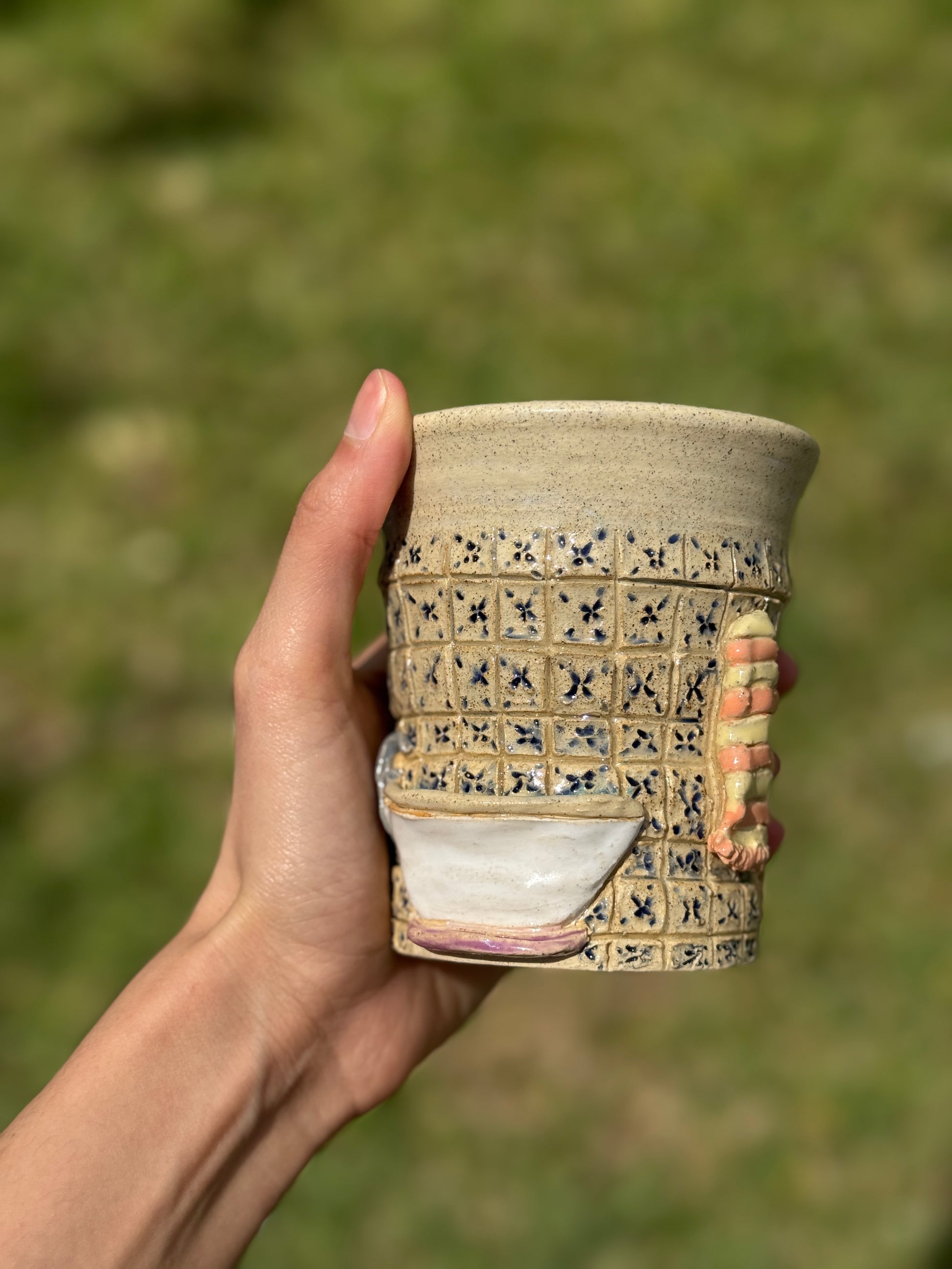 A ceramic cup featuring a charming vintage bathroom scene. Bringing a touch of nostalgic elegance to your sip.