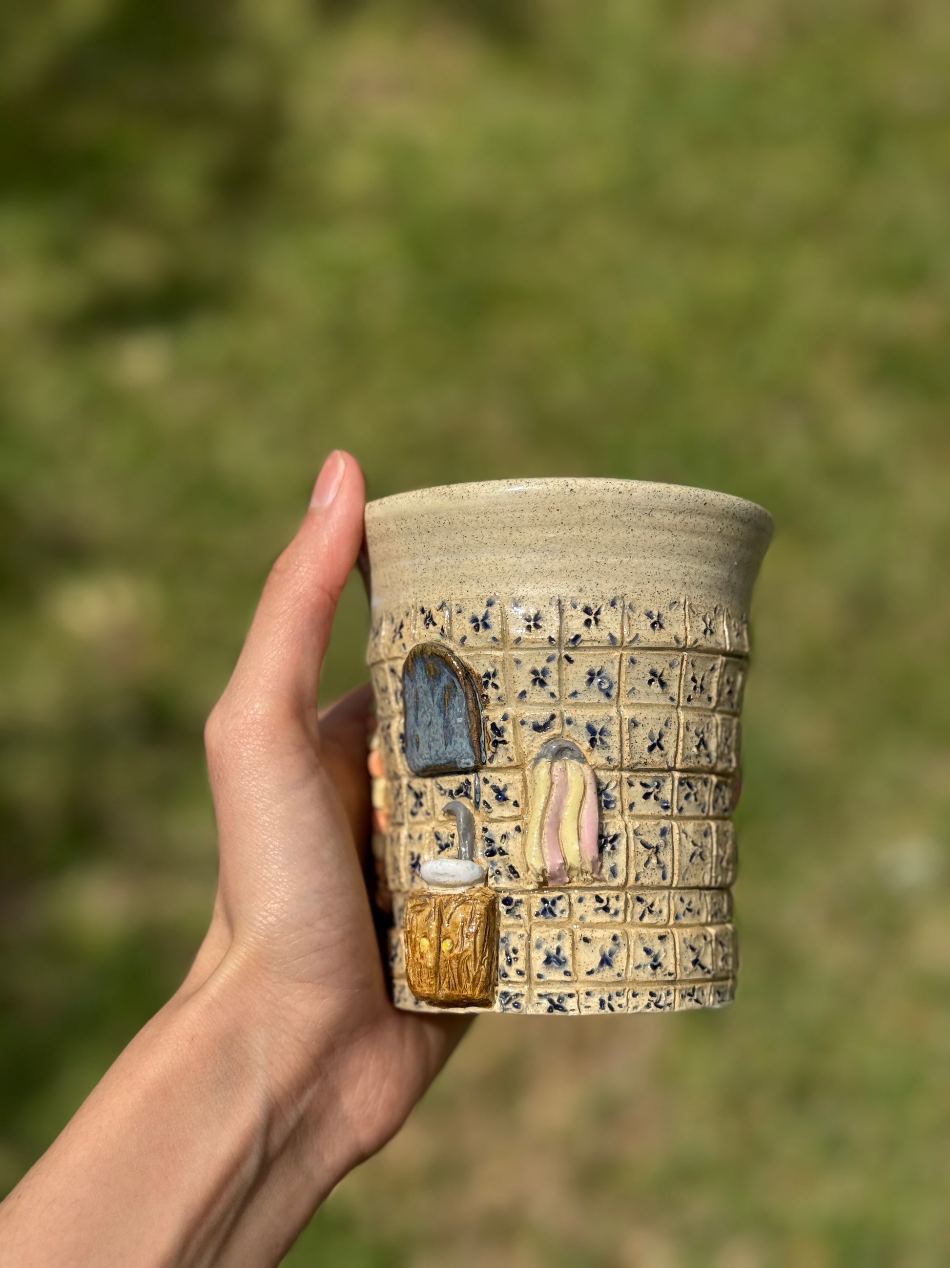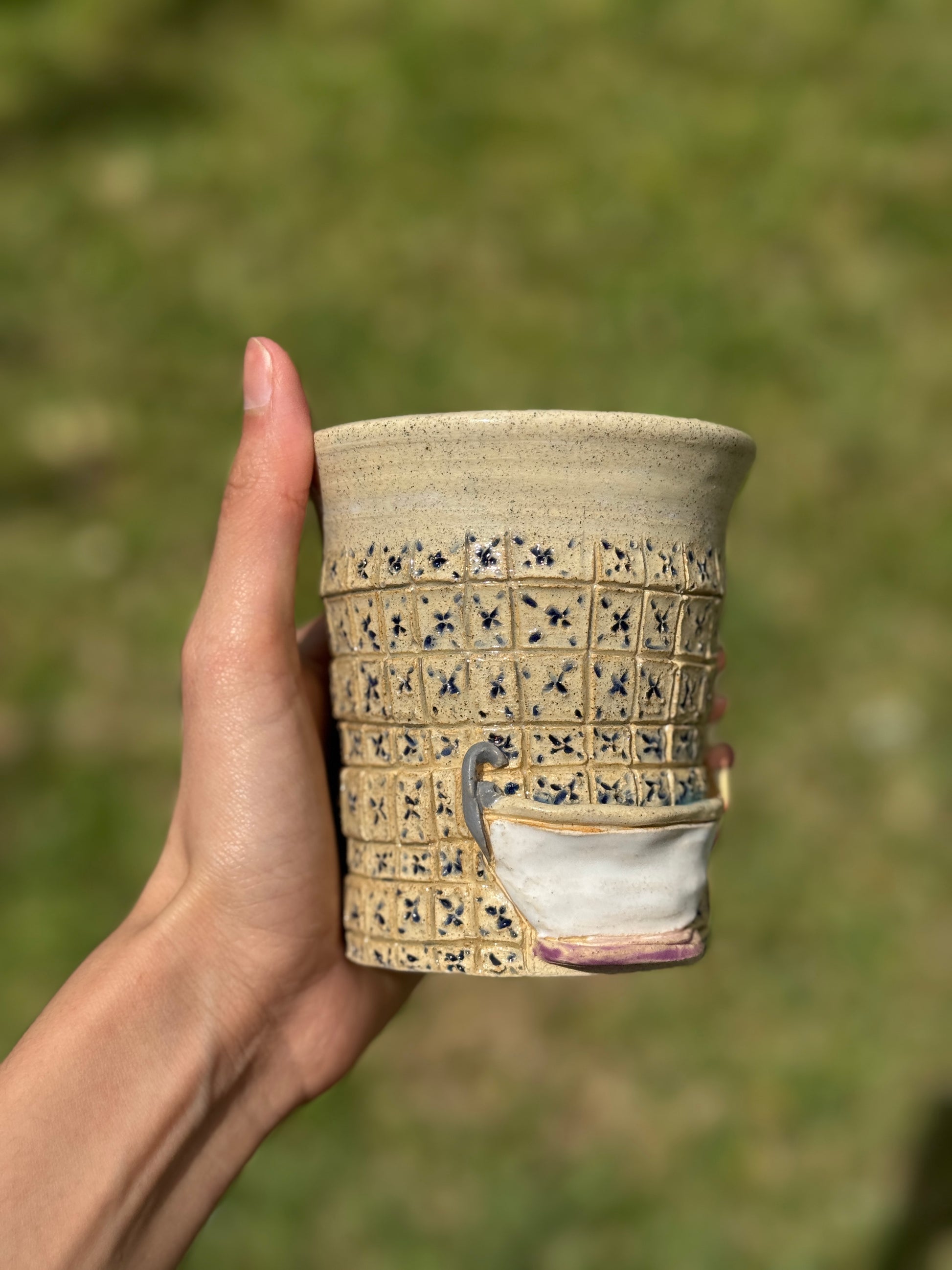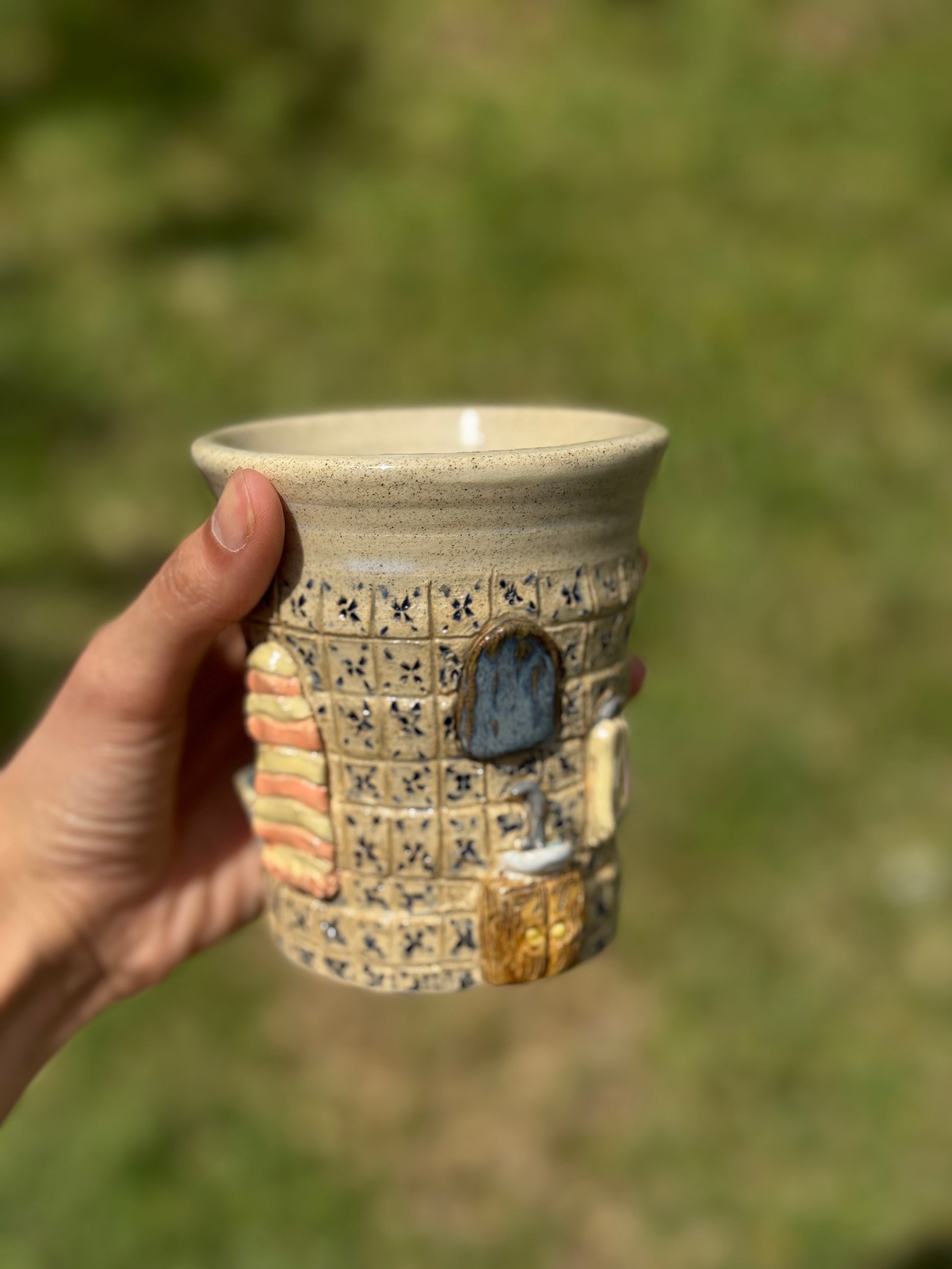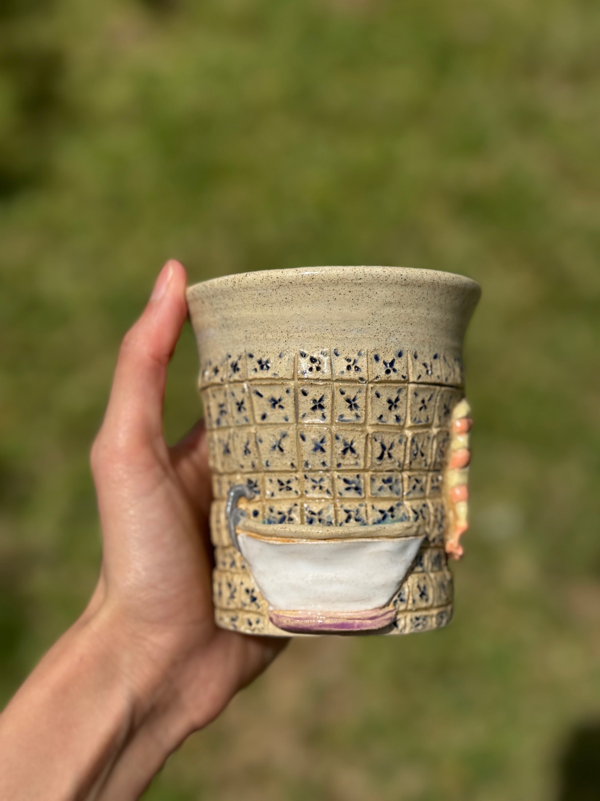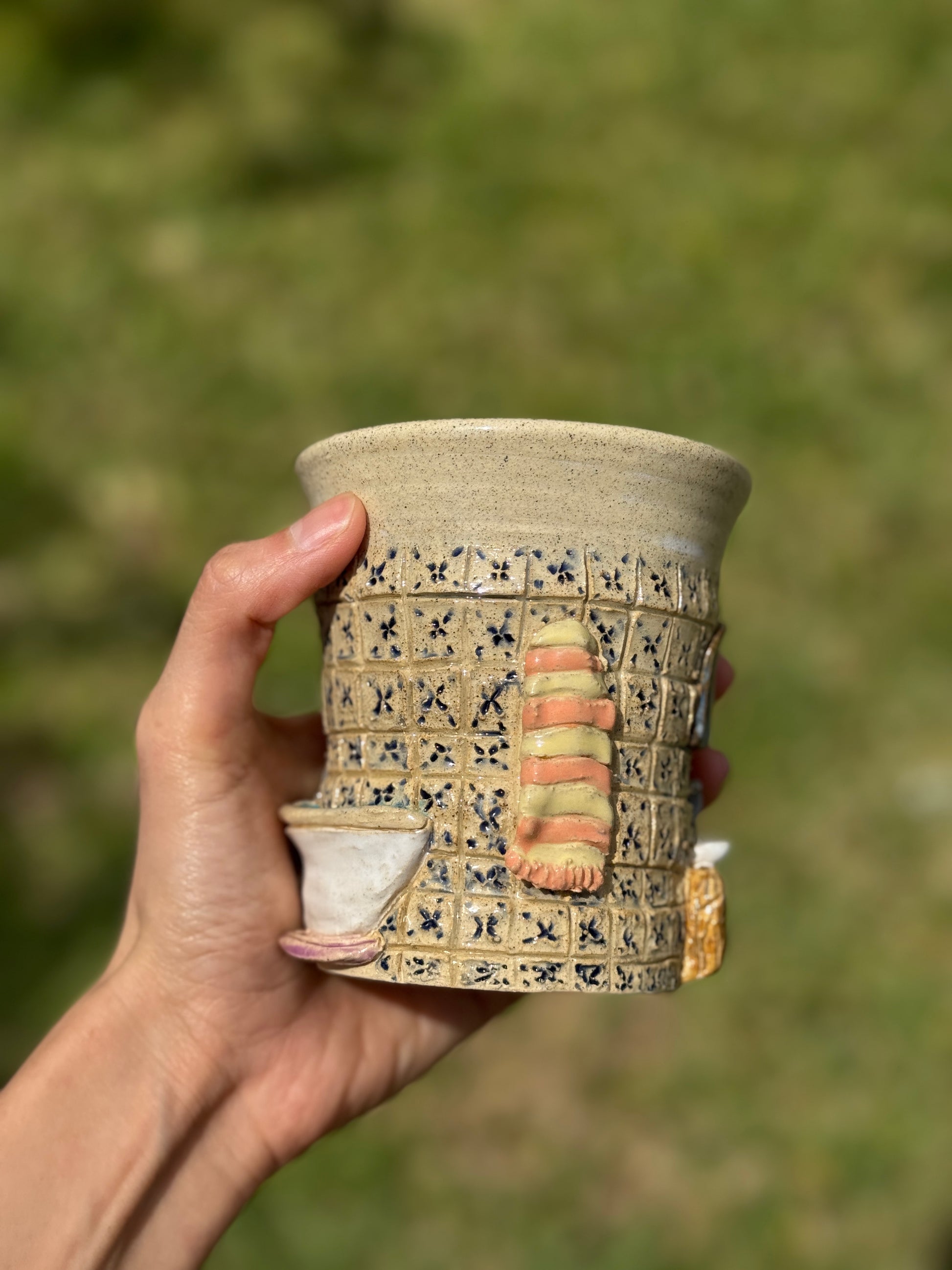 A ceramic cup featuring a charming vintage bathroom scene. Bringing a touch of nostalgic elegance to your sip.