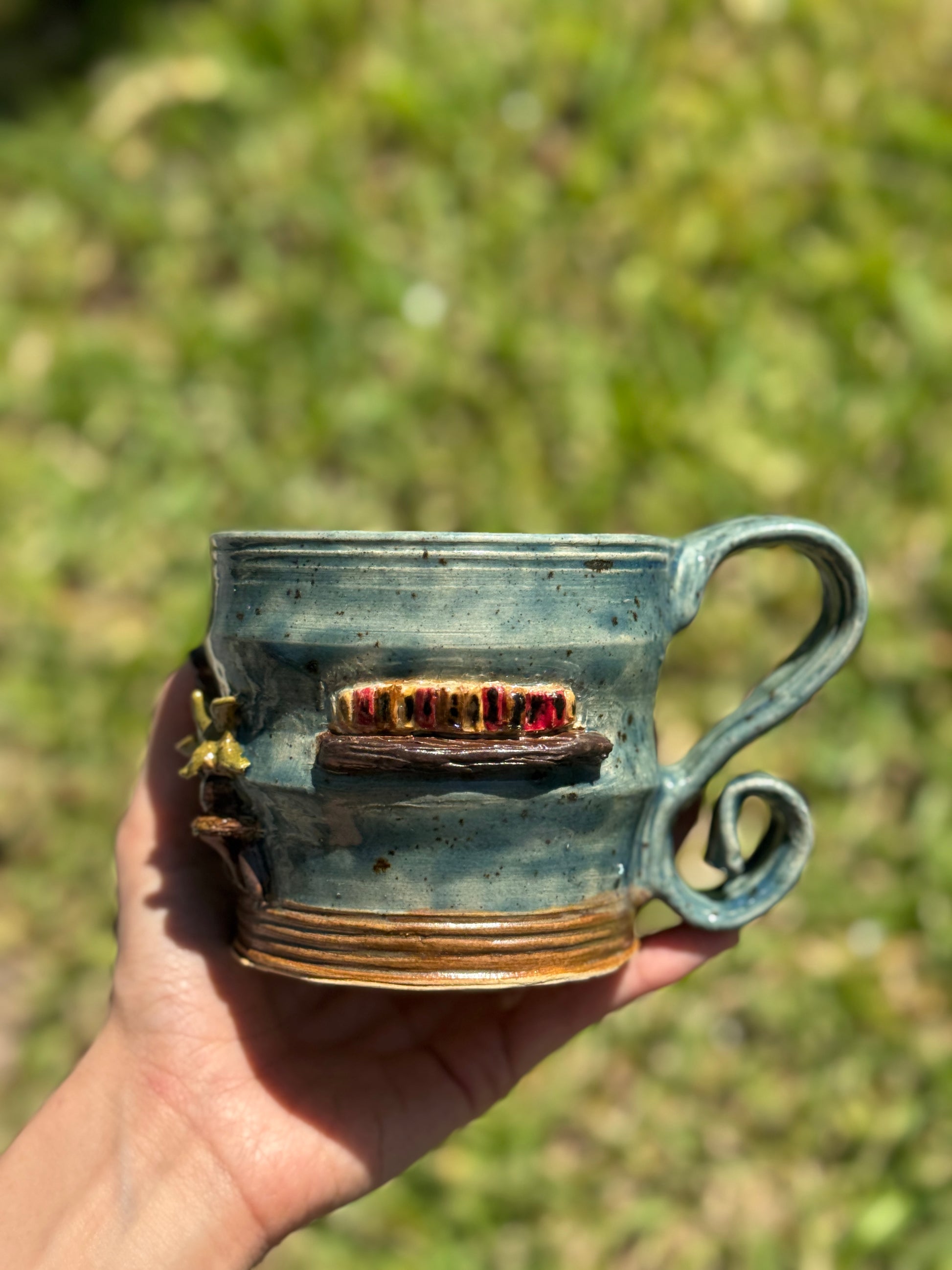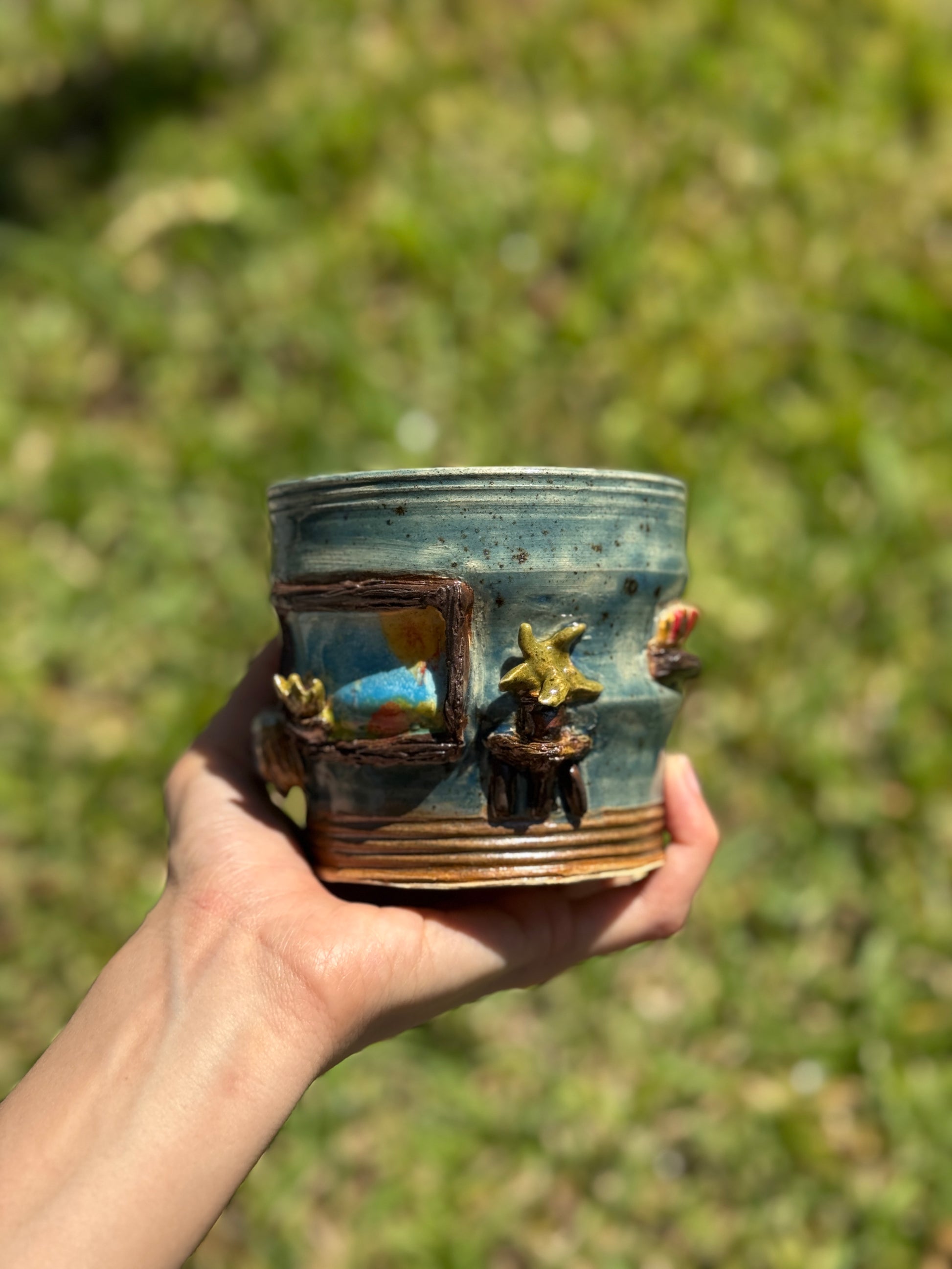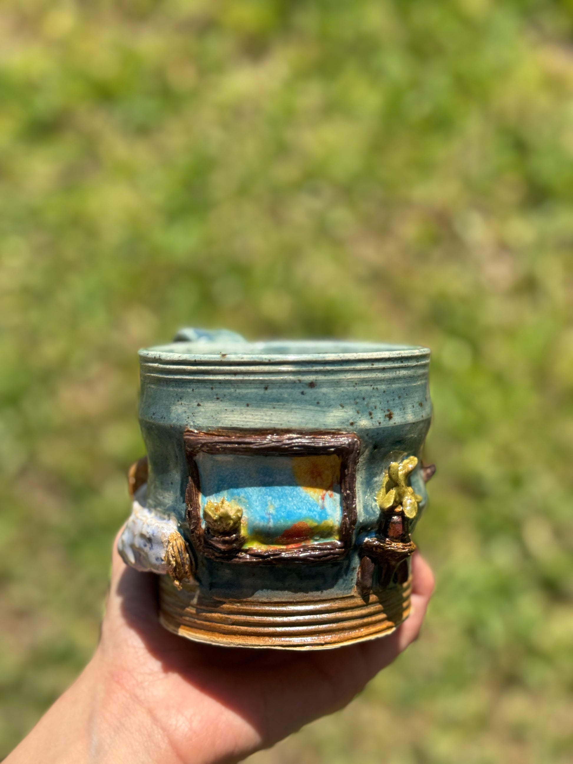 A cozy themed mug featuring a bedroom scene with a bookstand, a window view, and a potted plant. Perfect for lovers of quiet moments and warm spaces.
