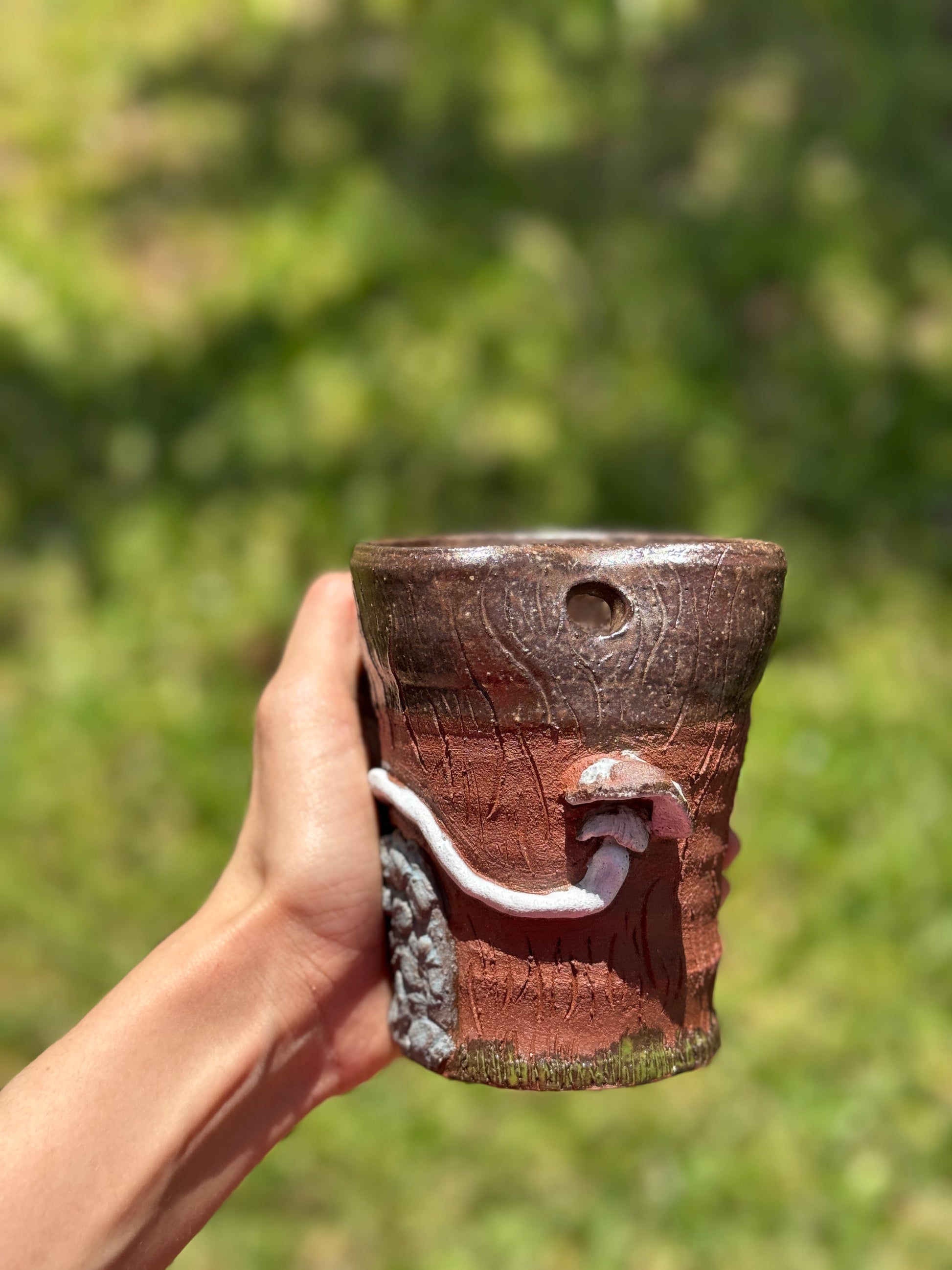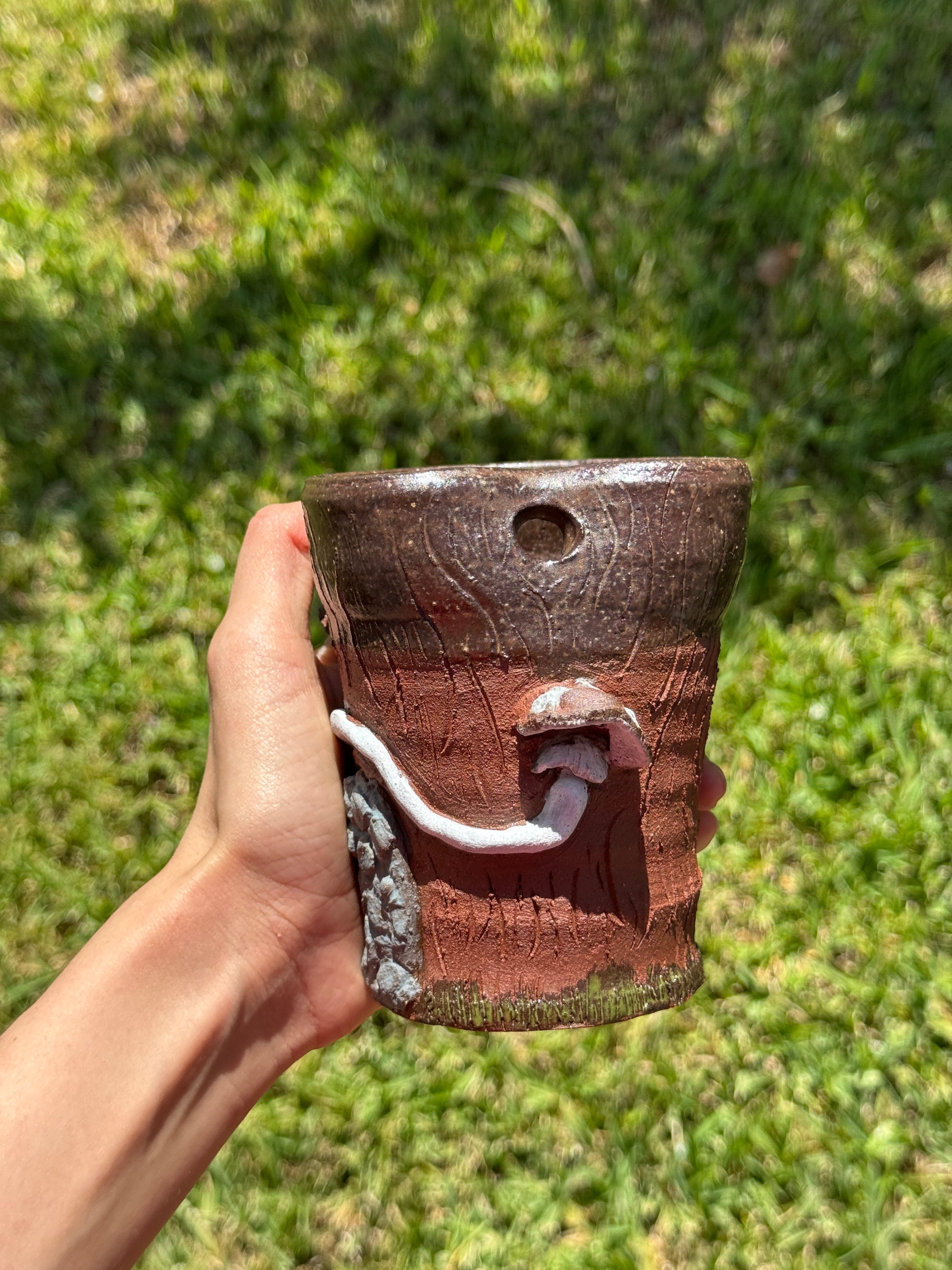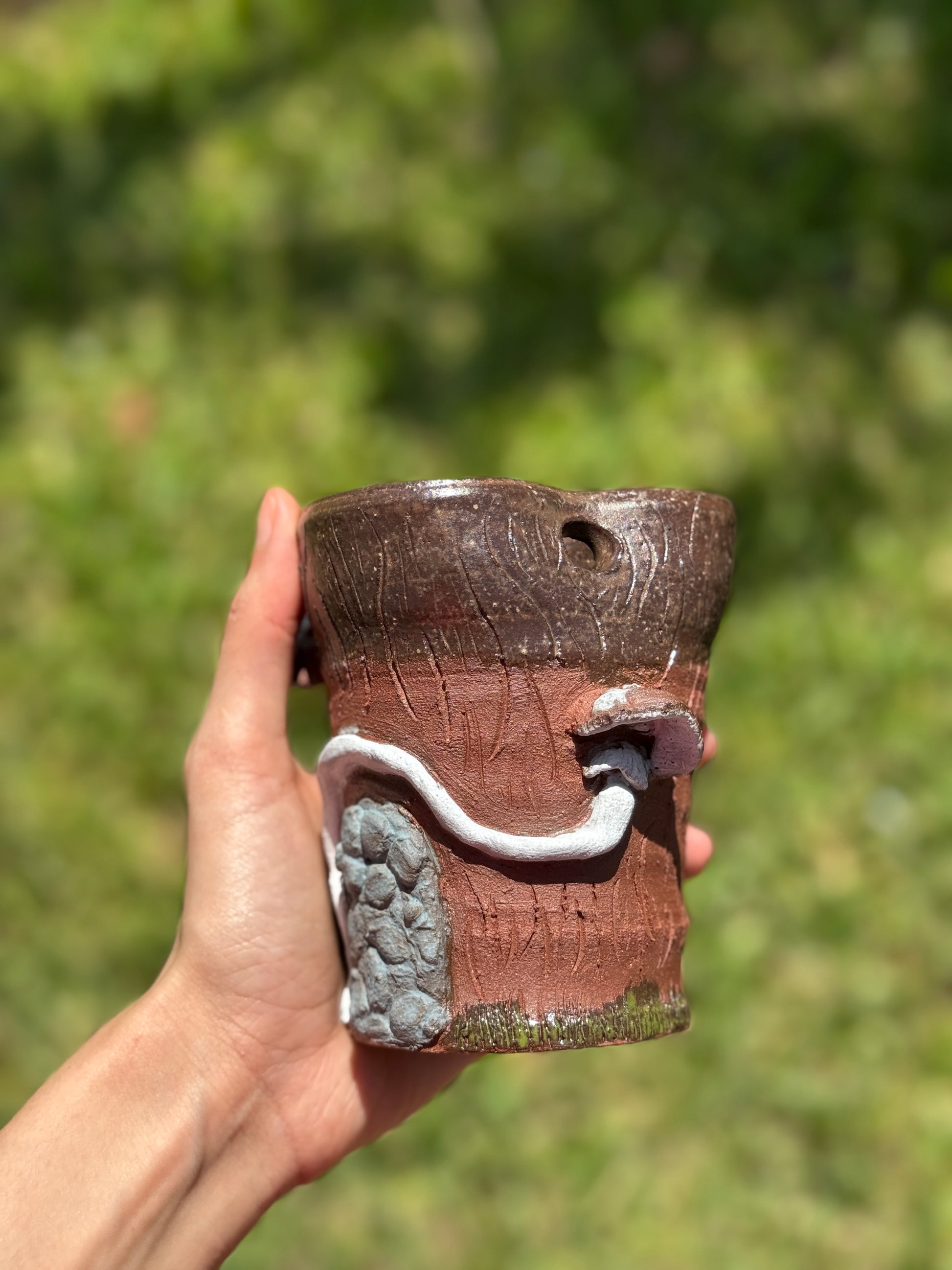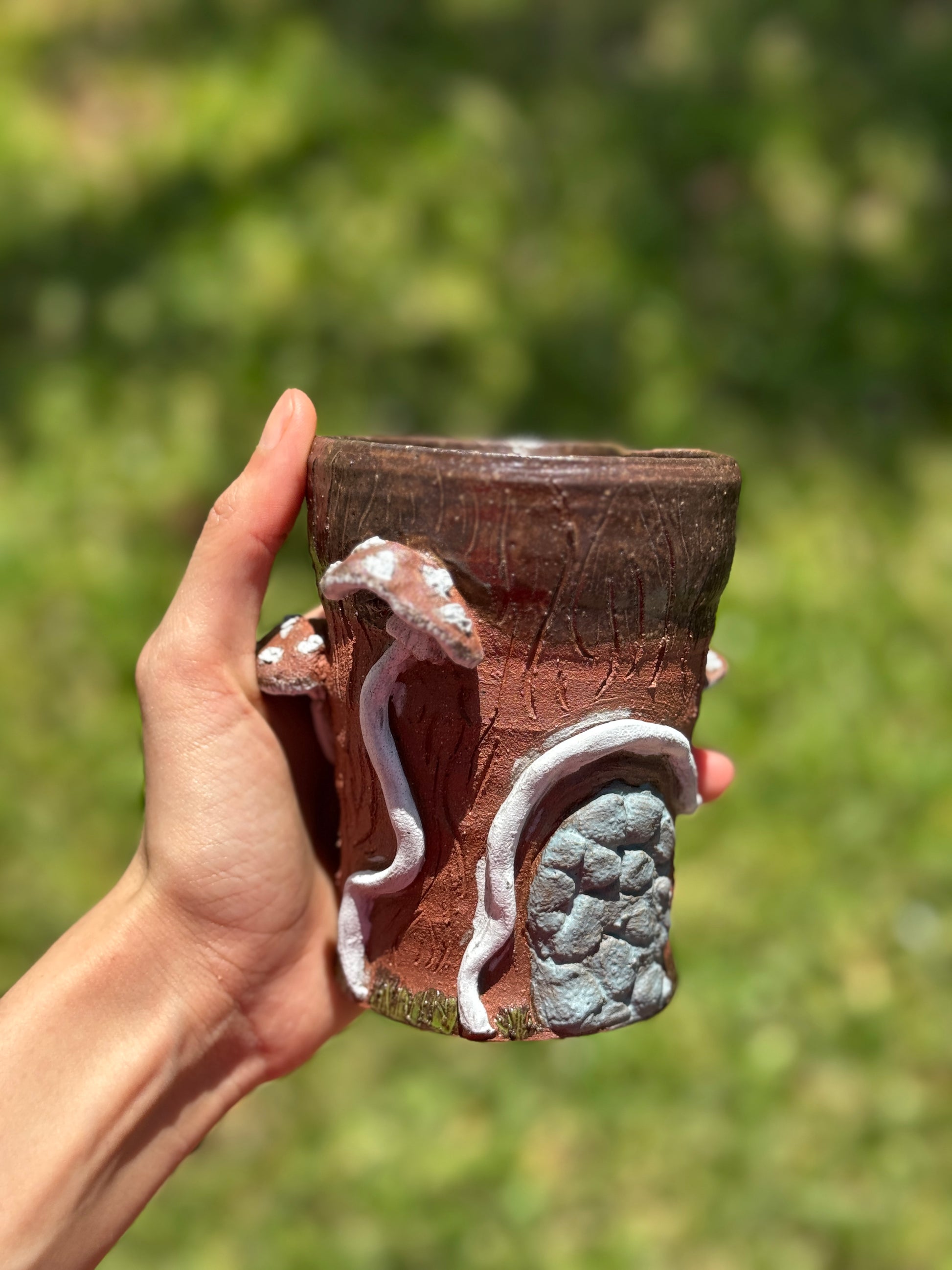A to go mug with a straw hole, designed with a whimsical hidden rock door nestled into its side. Perfect for those who love a hint of mystery and magic with their drink.
