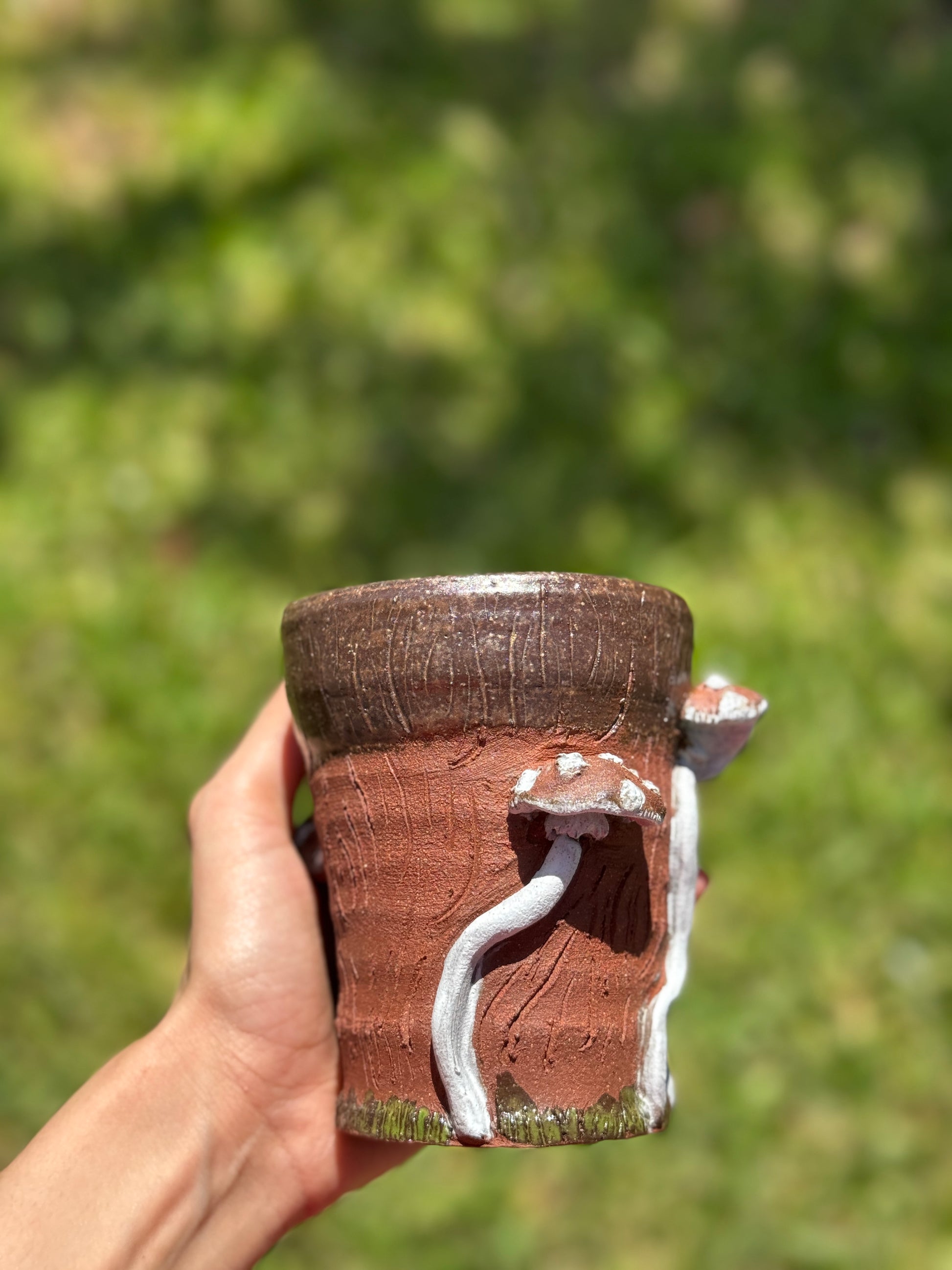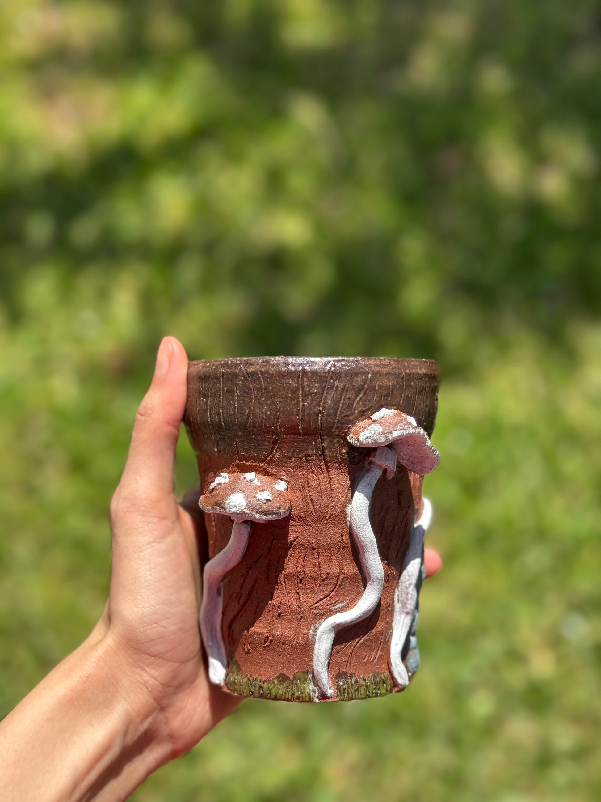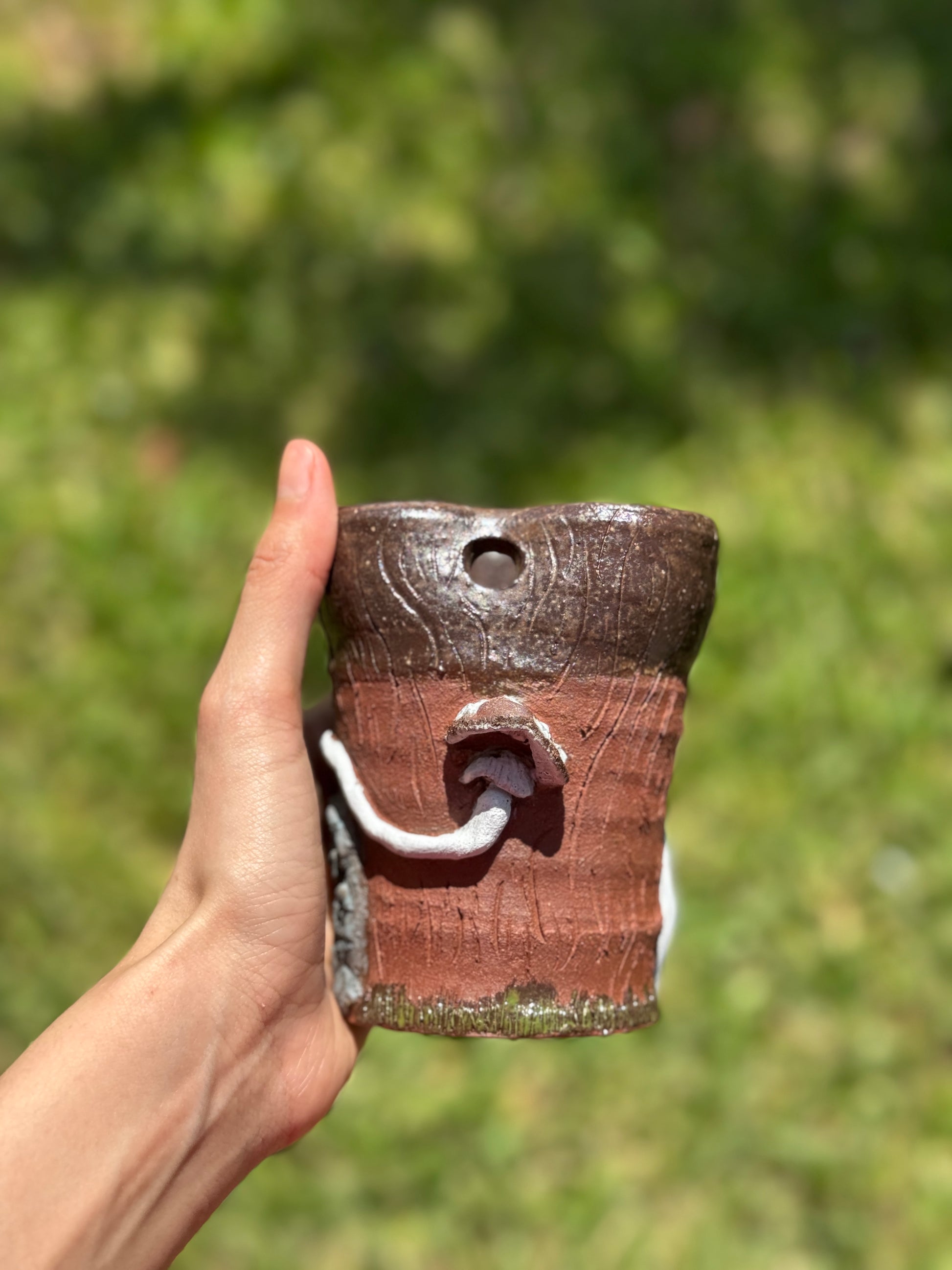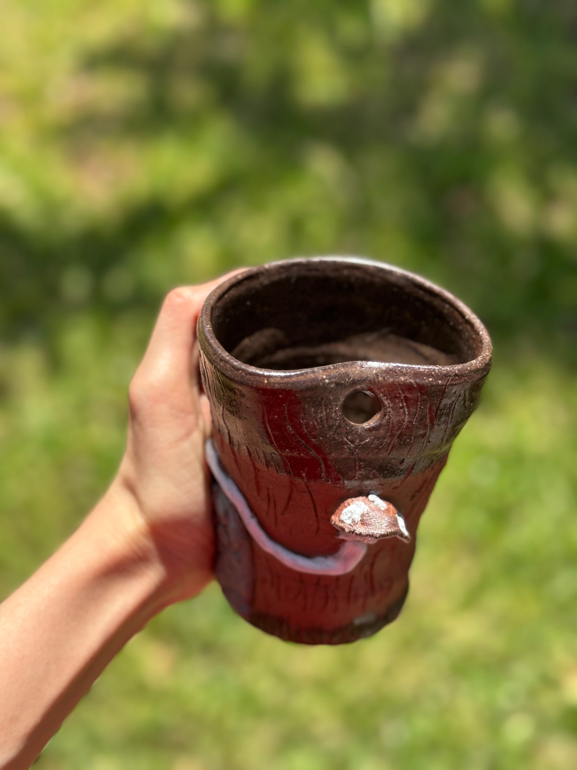 A to go mug with a straw hole, designed with a whimsical hidden rock door nestled into its side. Perfect for those who love a hint of mystery and magic with their drink.