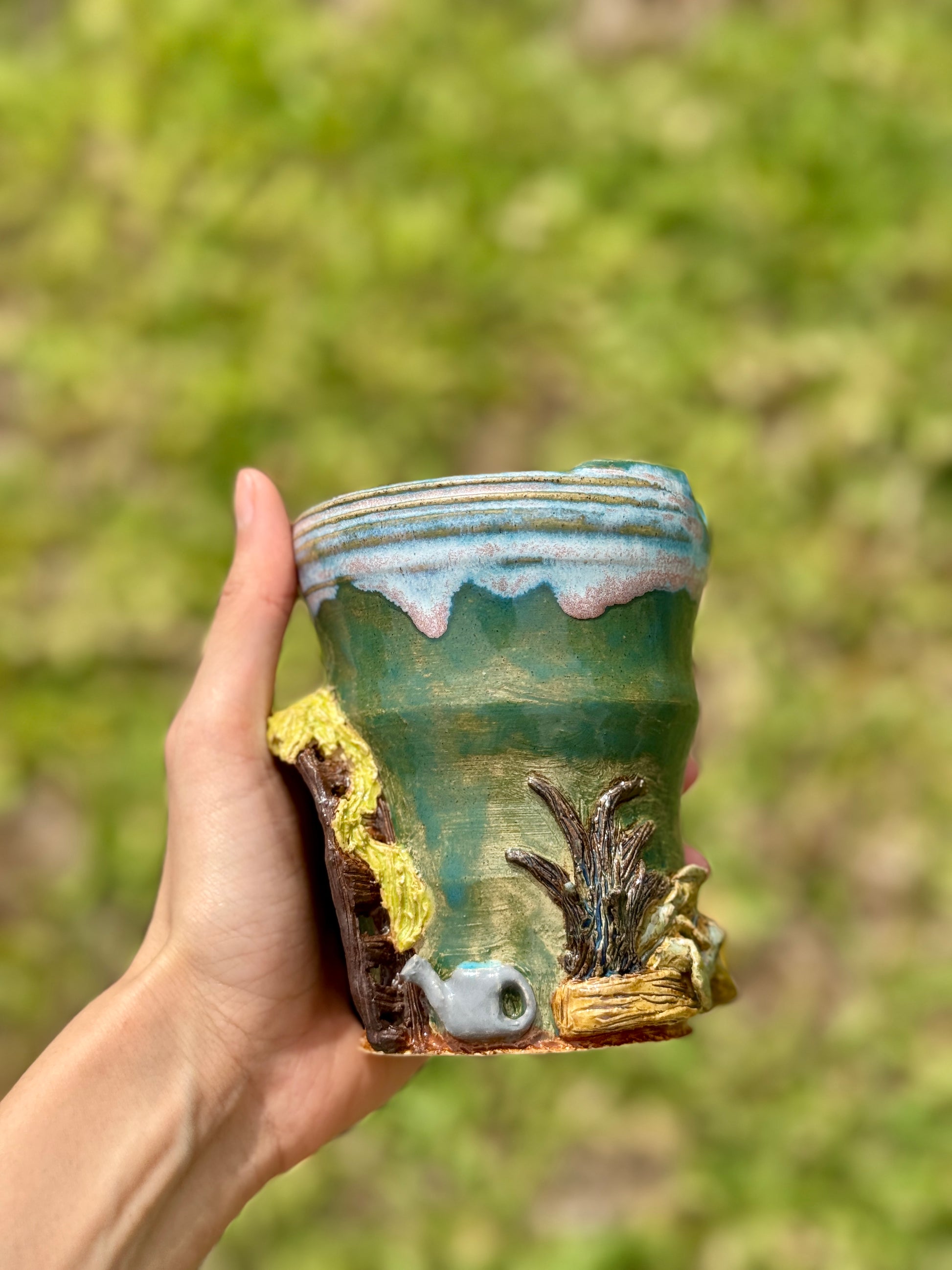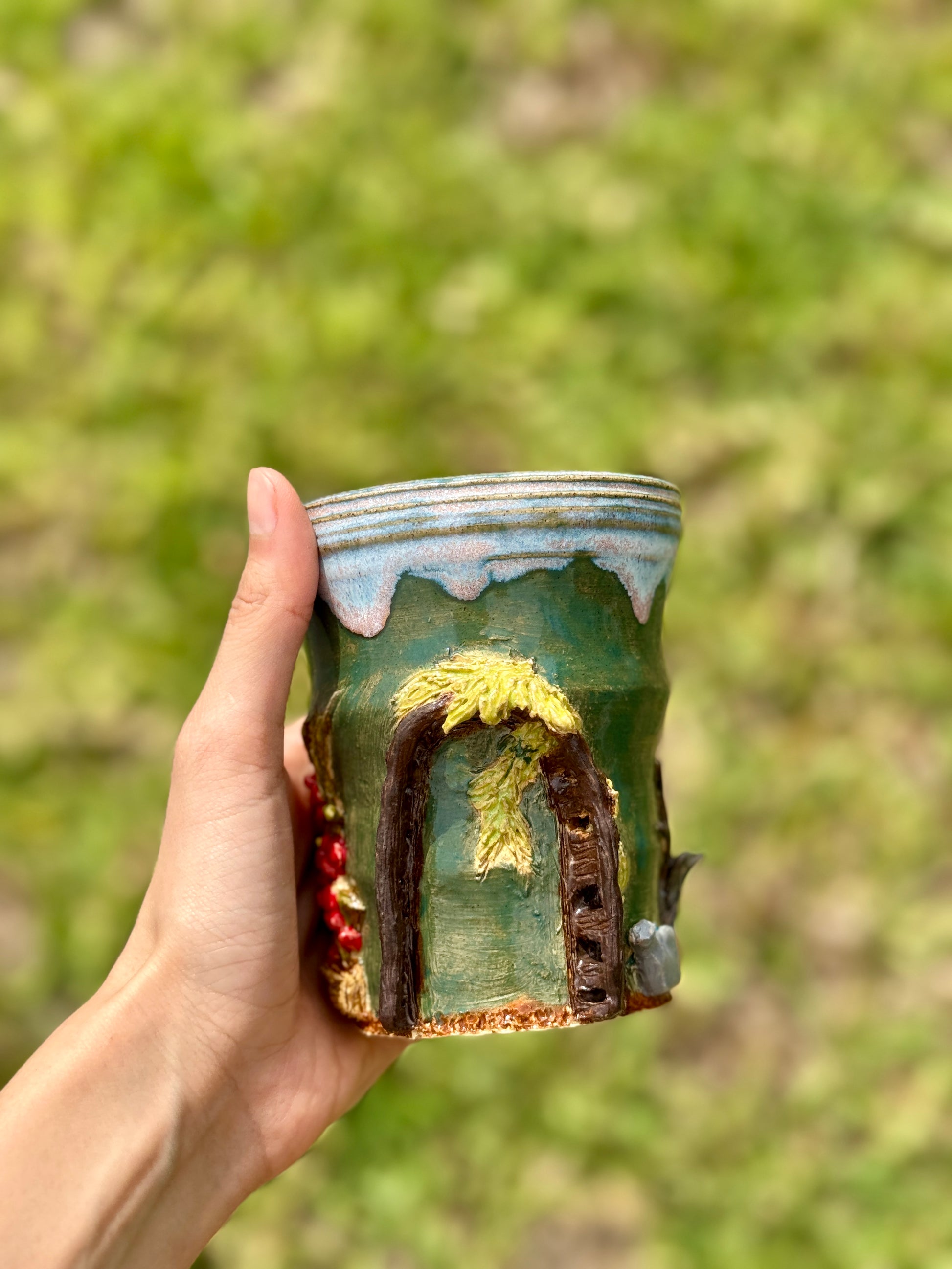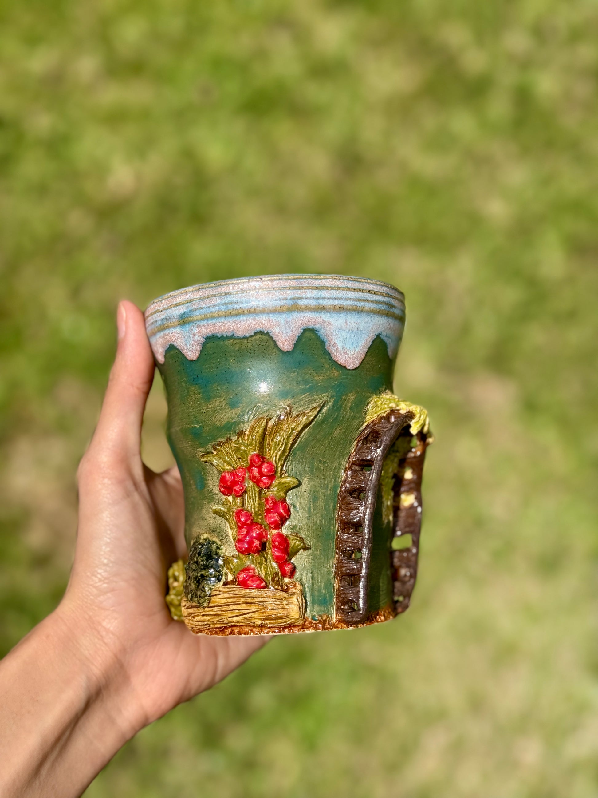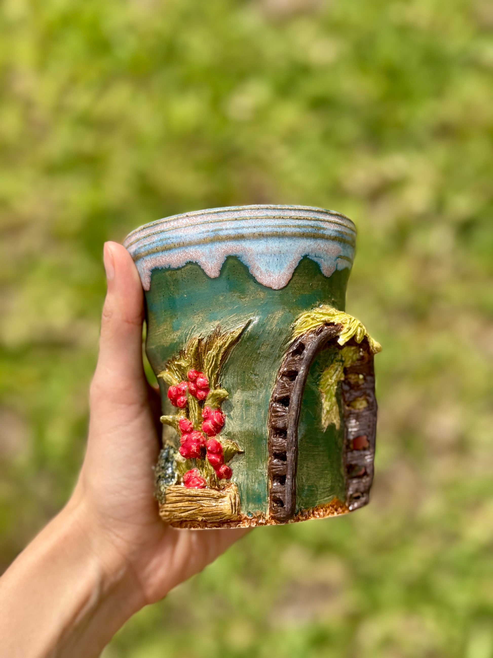 A to go mug featuring a cozy vegetable garden scene with vibrant greens, ripe veggies, and a rustic wooden entrance. Perfect for garden lovers on the move.