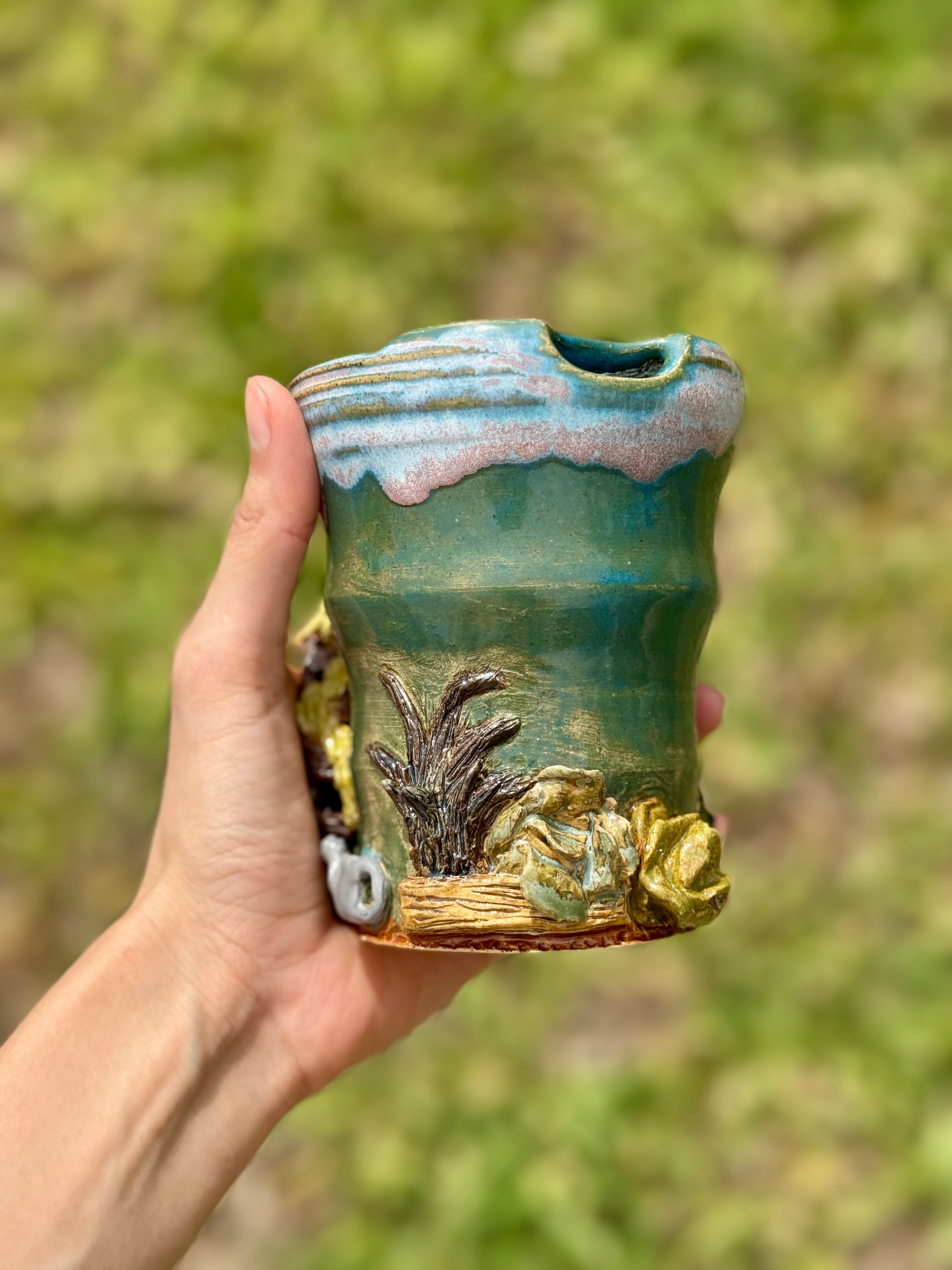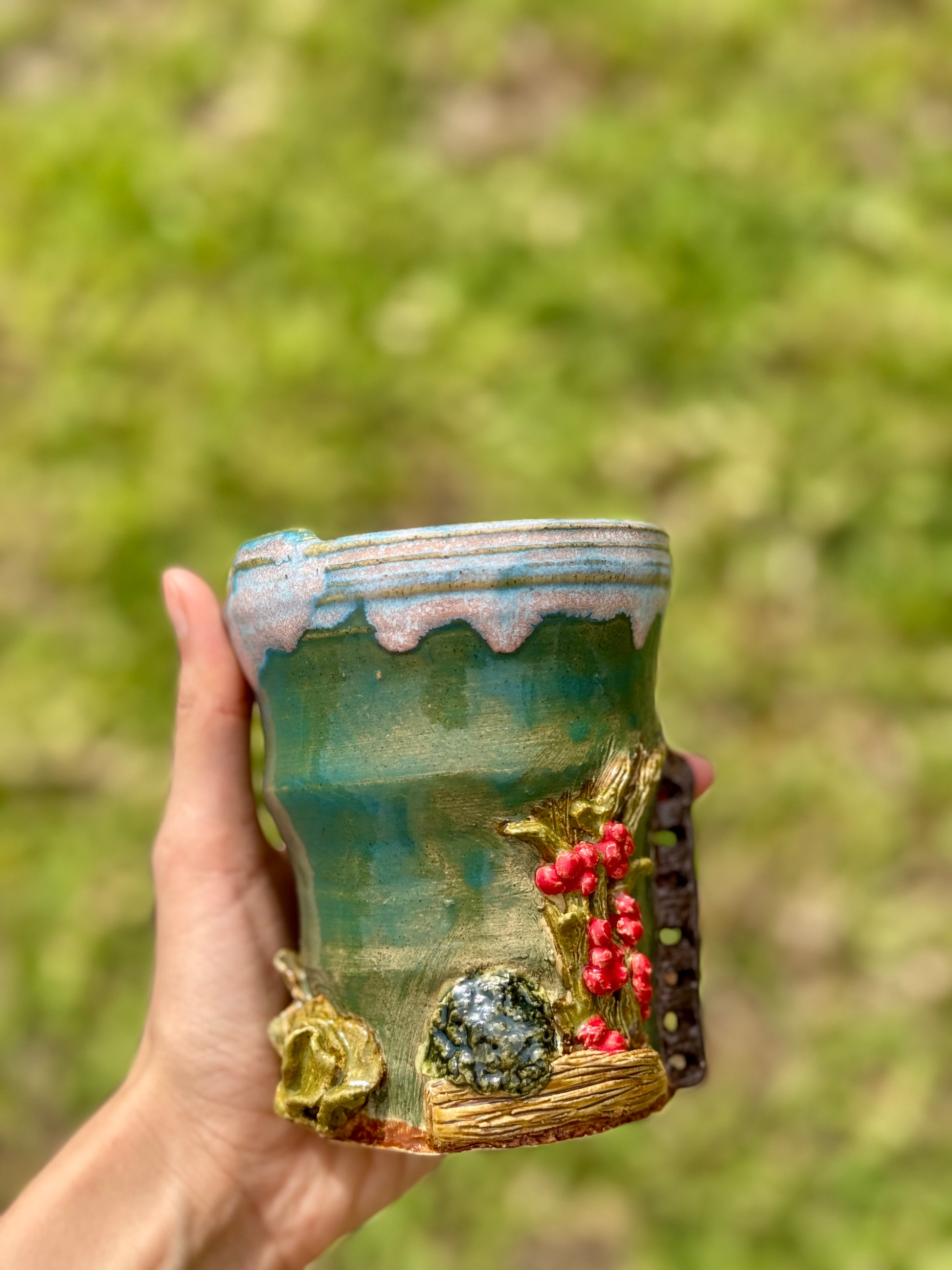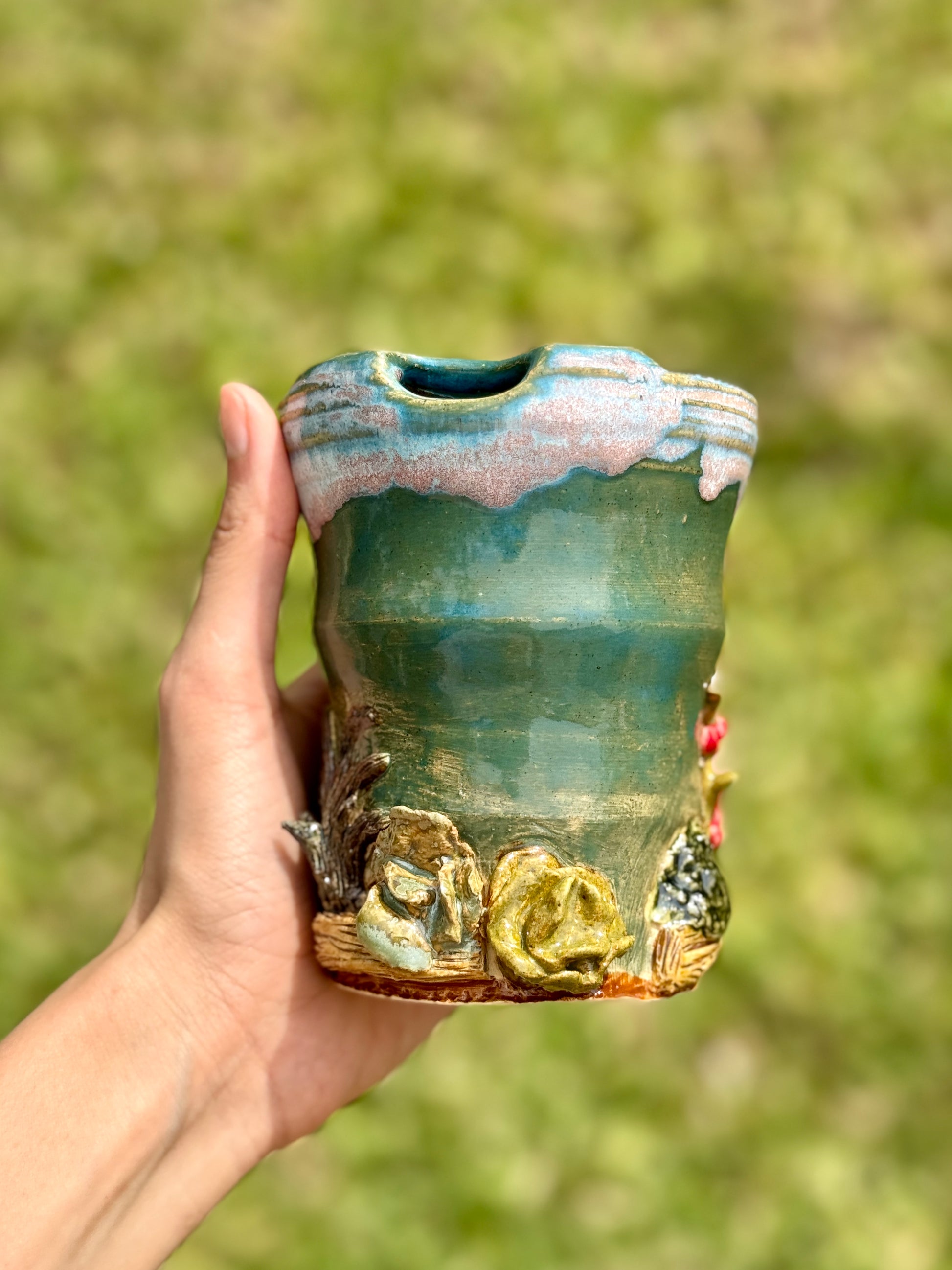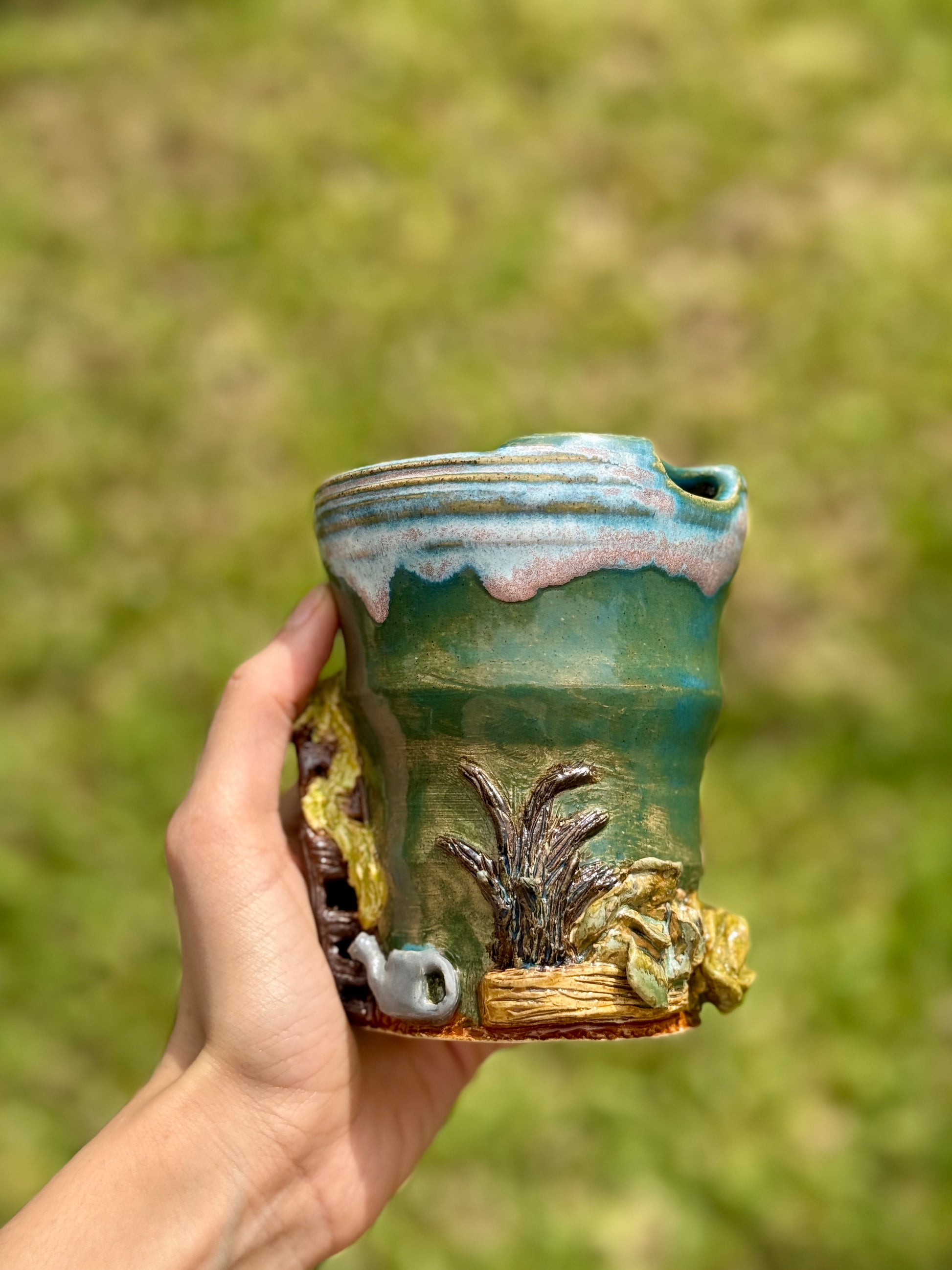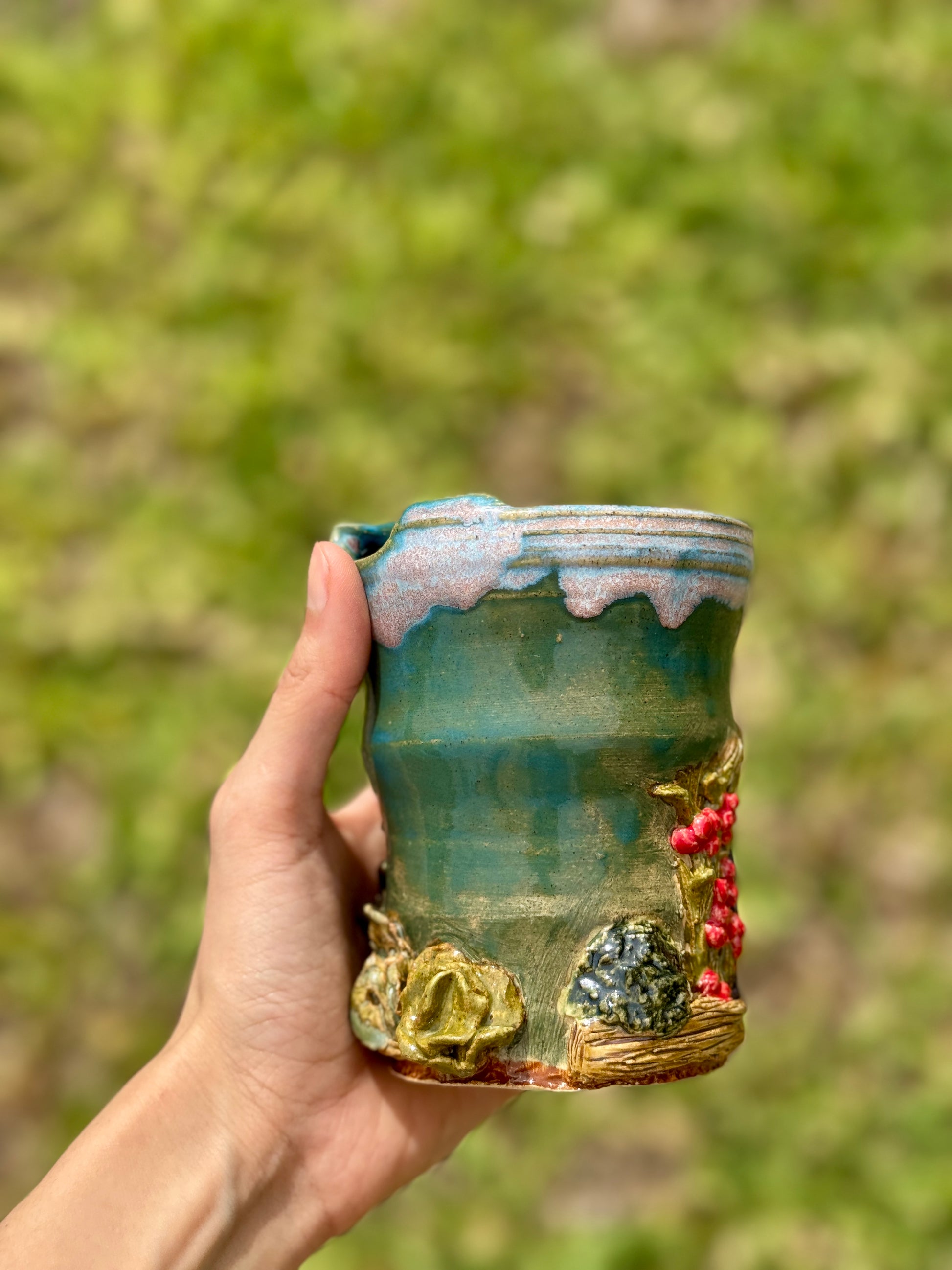 A to go mug featuring a cozy vegetable garden scene with vibrant greens, ripe veggies, and a rustic wooden entrance. Perfect for garden lovers on the move.